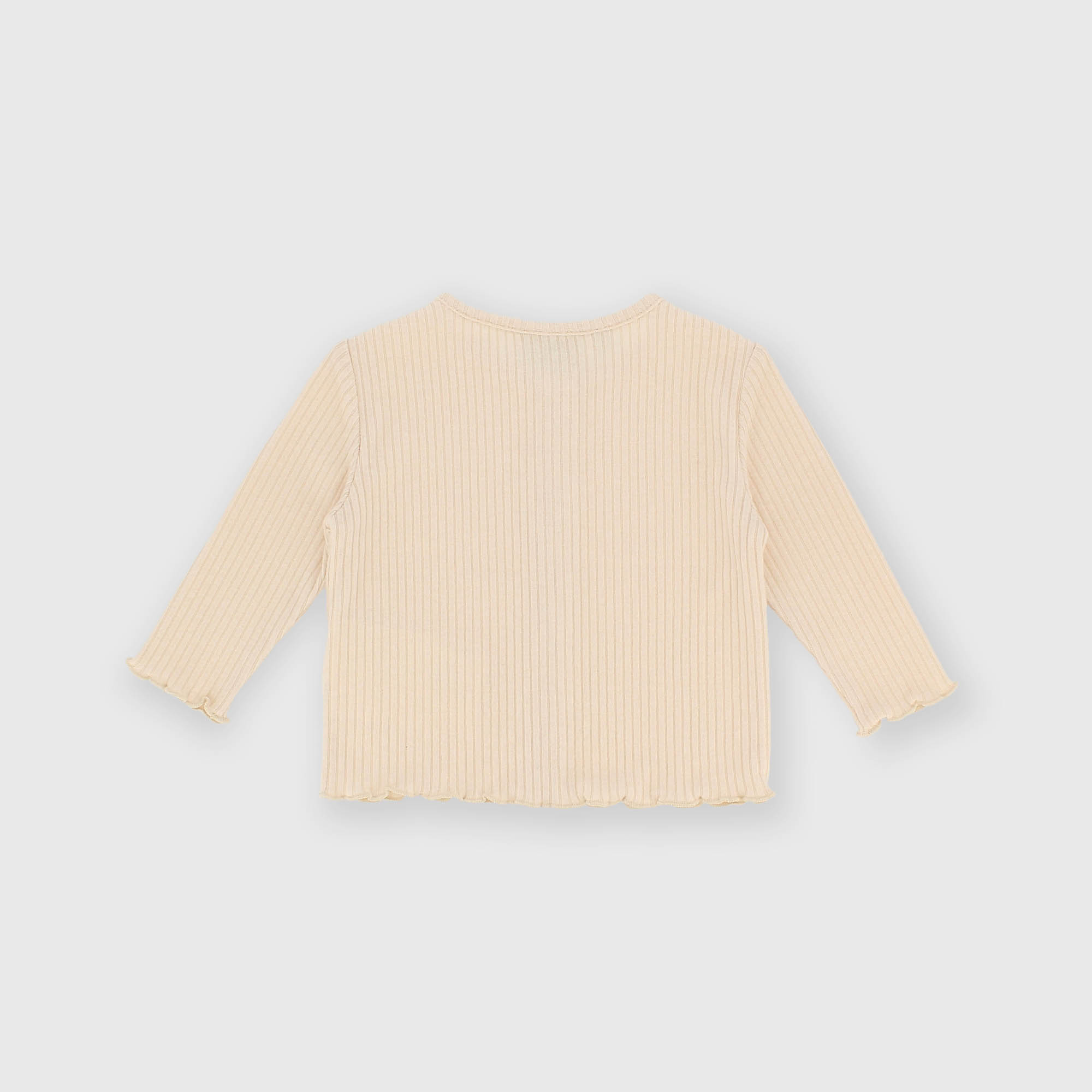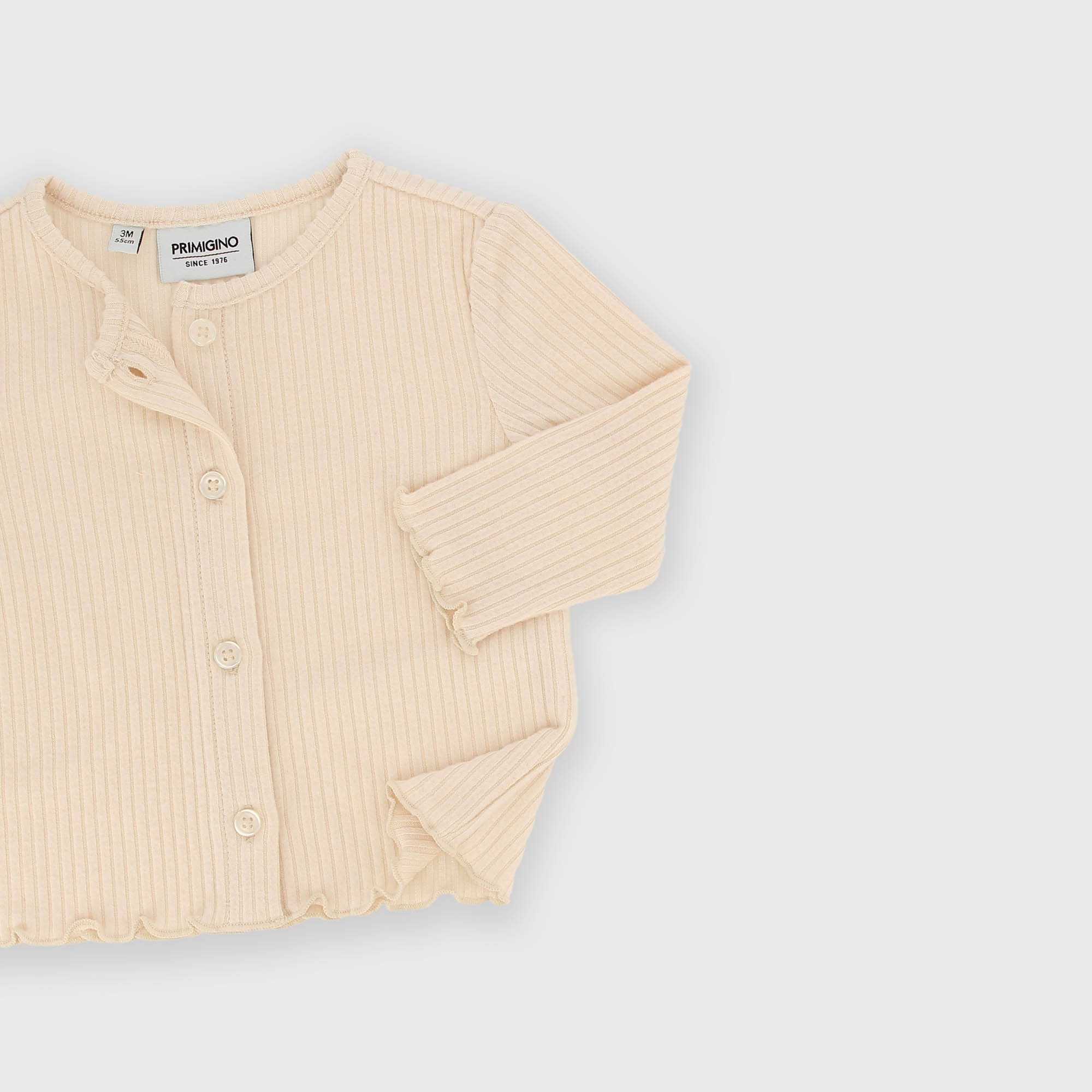 Rebeca canalé, cuello redondo. Cierre con botones en la parte delantera. Acabado con punto bambola.