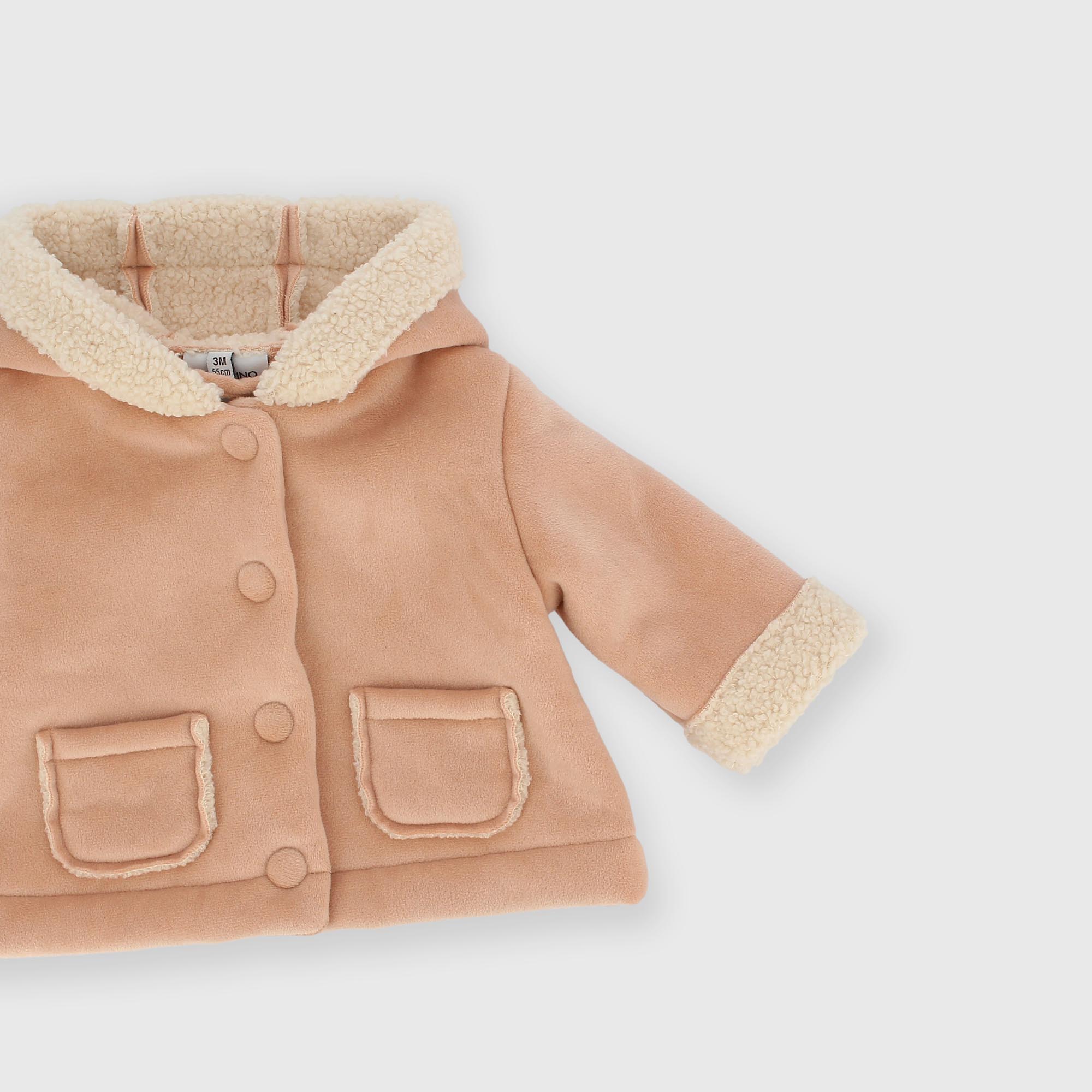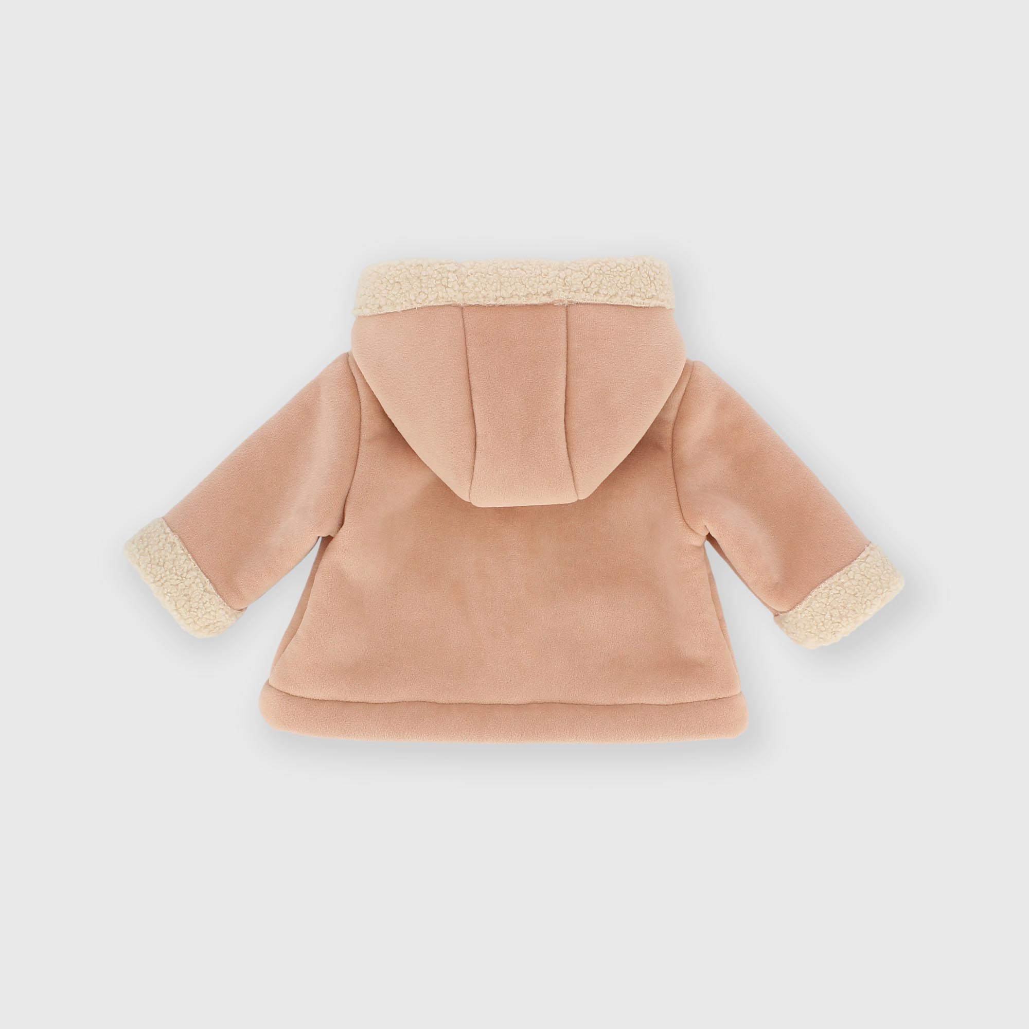 Cazadora de borreguillo con capucha y mangas largas. Cierre con broches a presión y bolsillos de parche en la parte delantera. Parte interior de peluche efecto teddy.