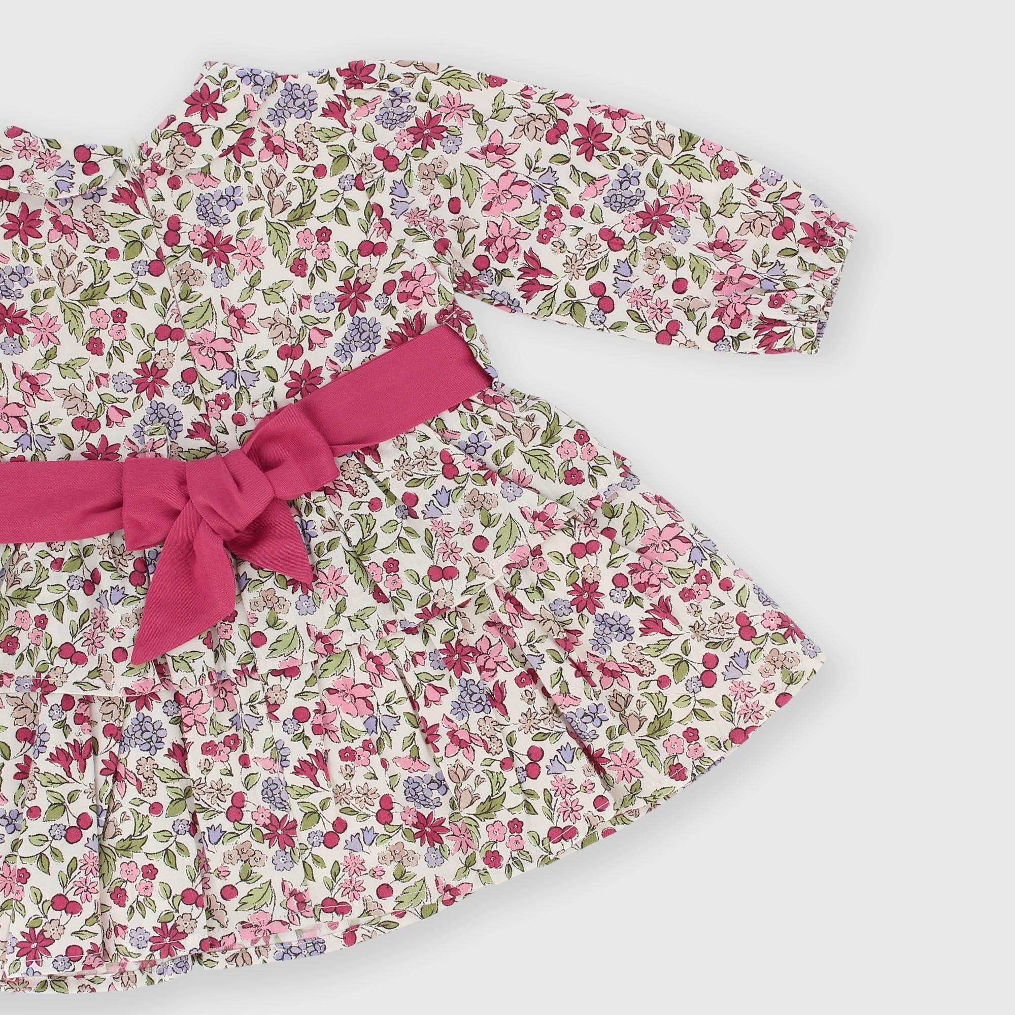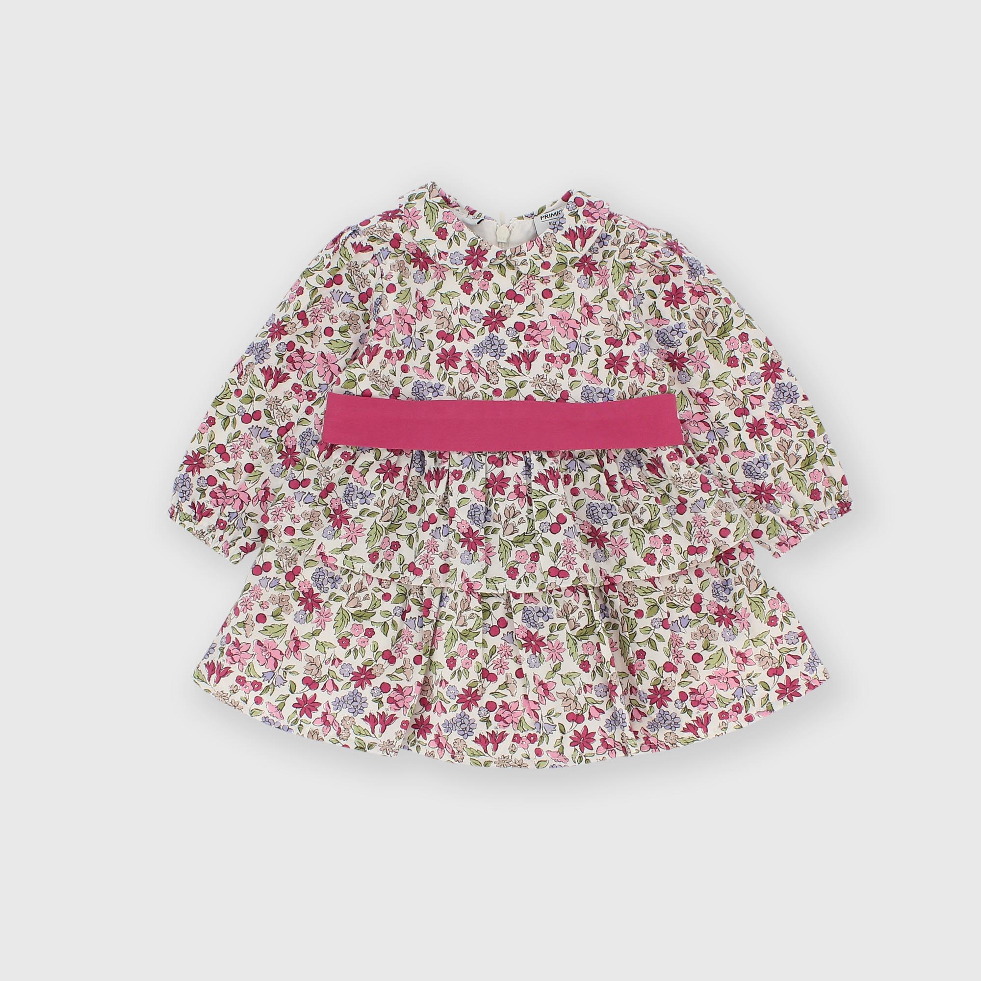 Vestido con cuello y mangas largas. Cierre con cremallera oculta en la parte trasera. Estampado integral de flores. Falda con volantes. Puños fruncidos. Cinturón en combinación.