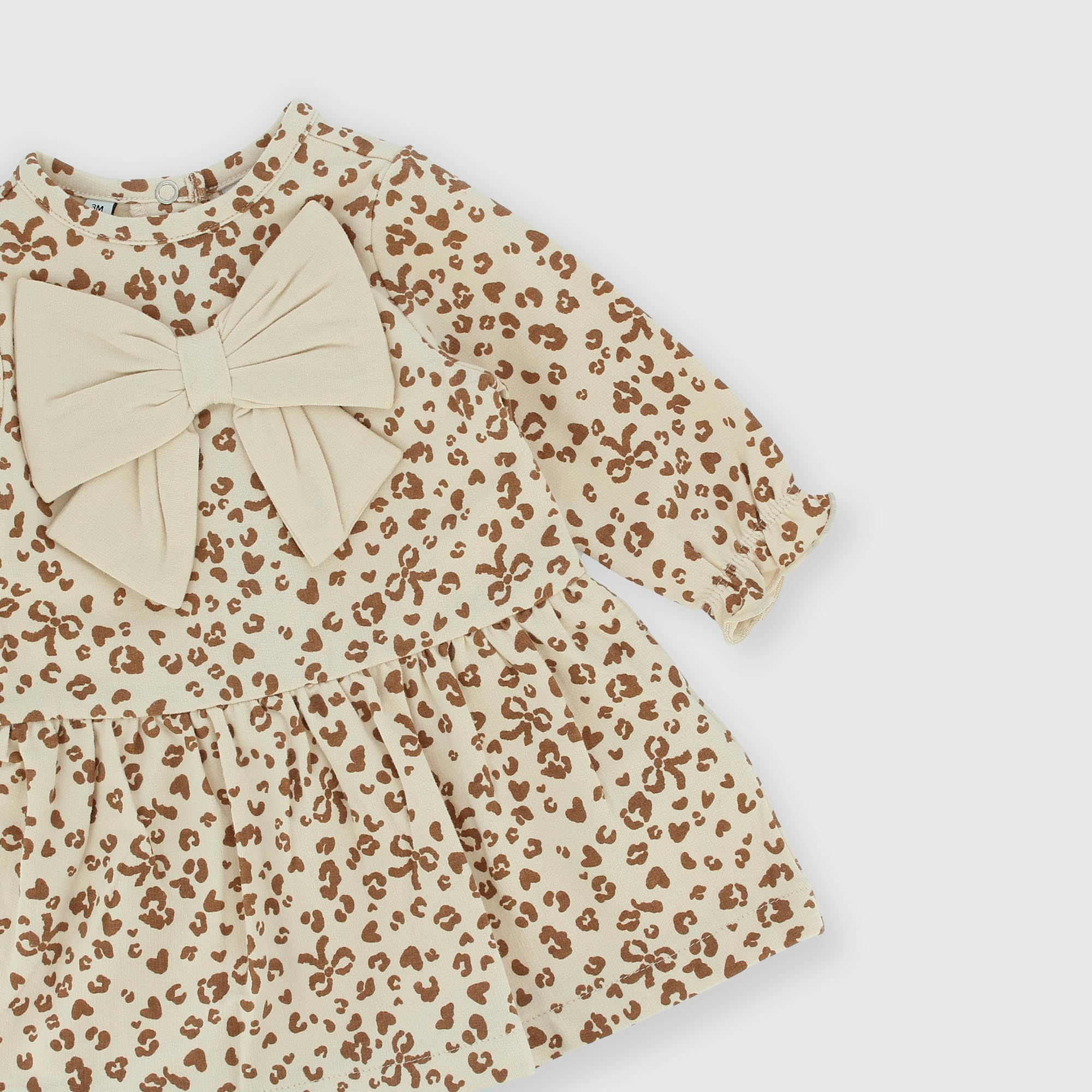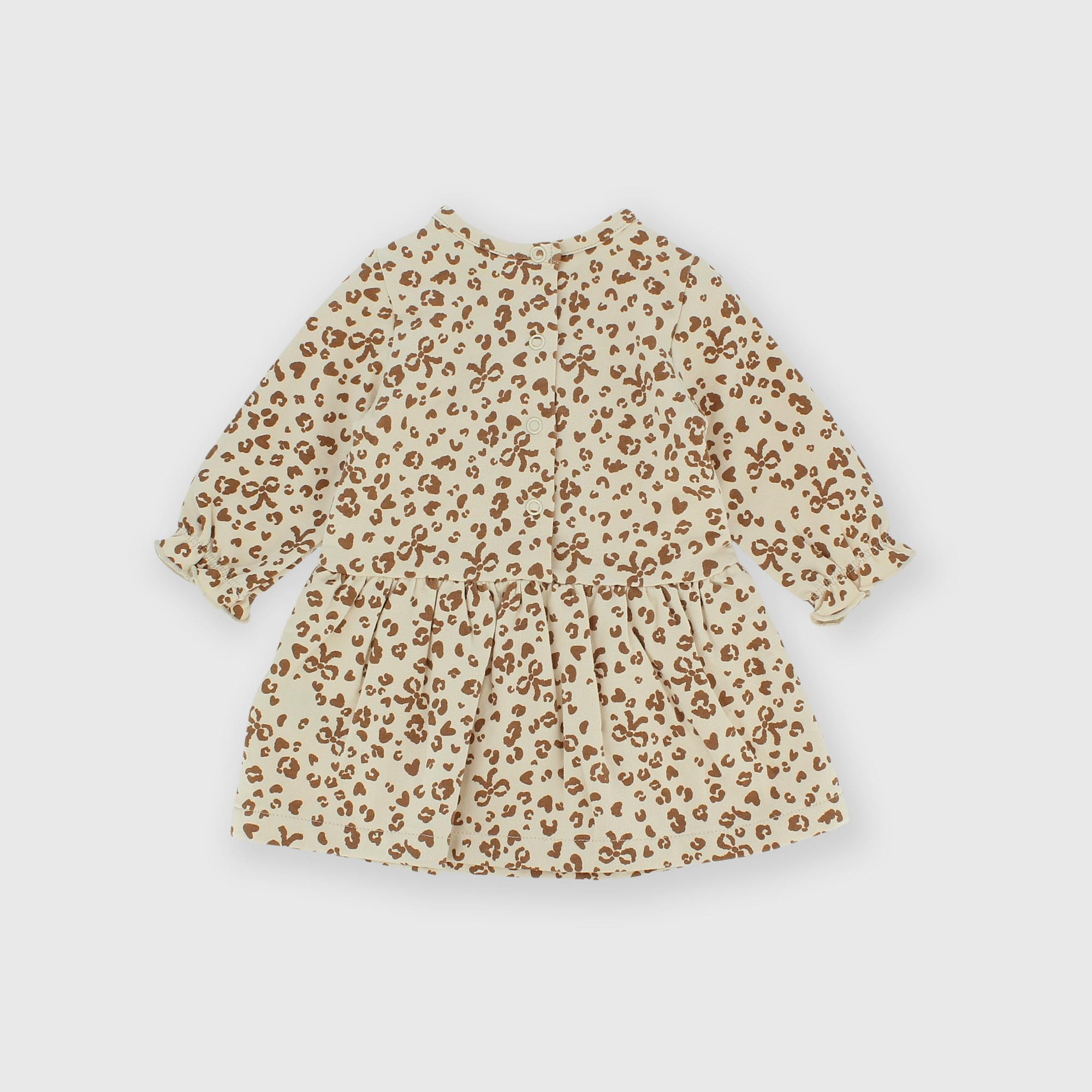 Vestido de felpa con cuello redondo y mangas largas. Cierre con broches a presión en la parte posterior. Estampado intergal animalier y adorno de lazo en la parte delantera. Volante en la parte inferior y puños elásticos con acabado punto bambola.