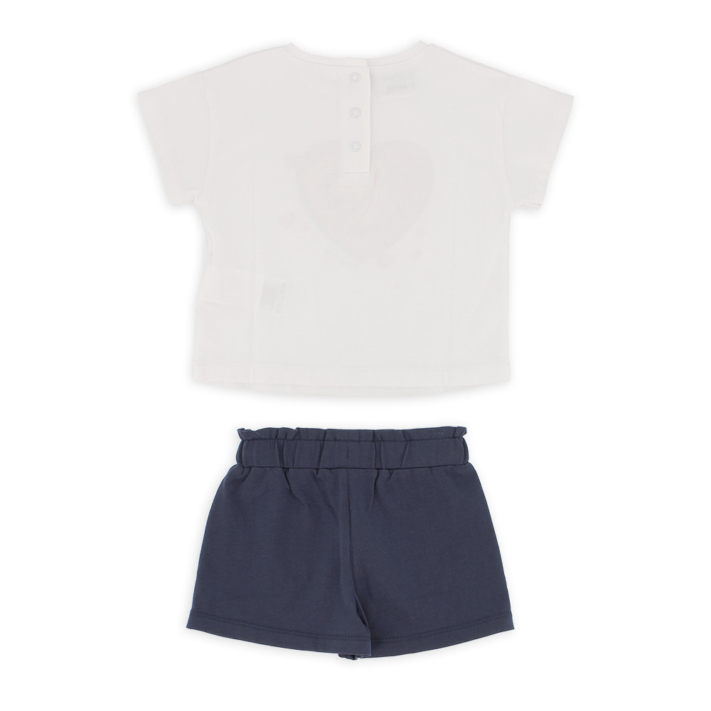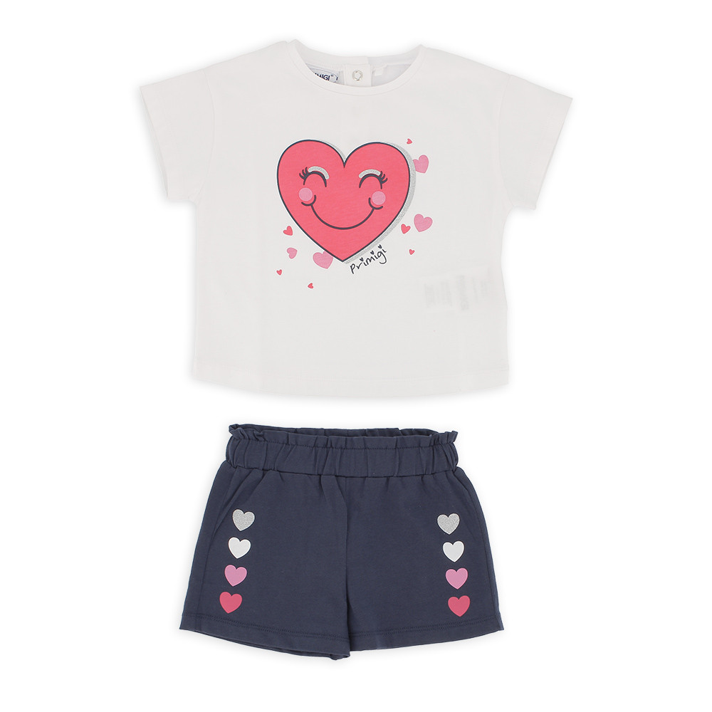 Complet composé de deux pièces. T-shirt maillot col équipage, à manches courtes. Fermeture arrière avec boutons pression. Impression frontale avec des détails scintillants. Short en jersey avec taille élastiquée et imprimés symétriques avec coeurs.