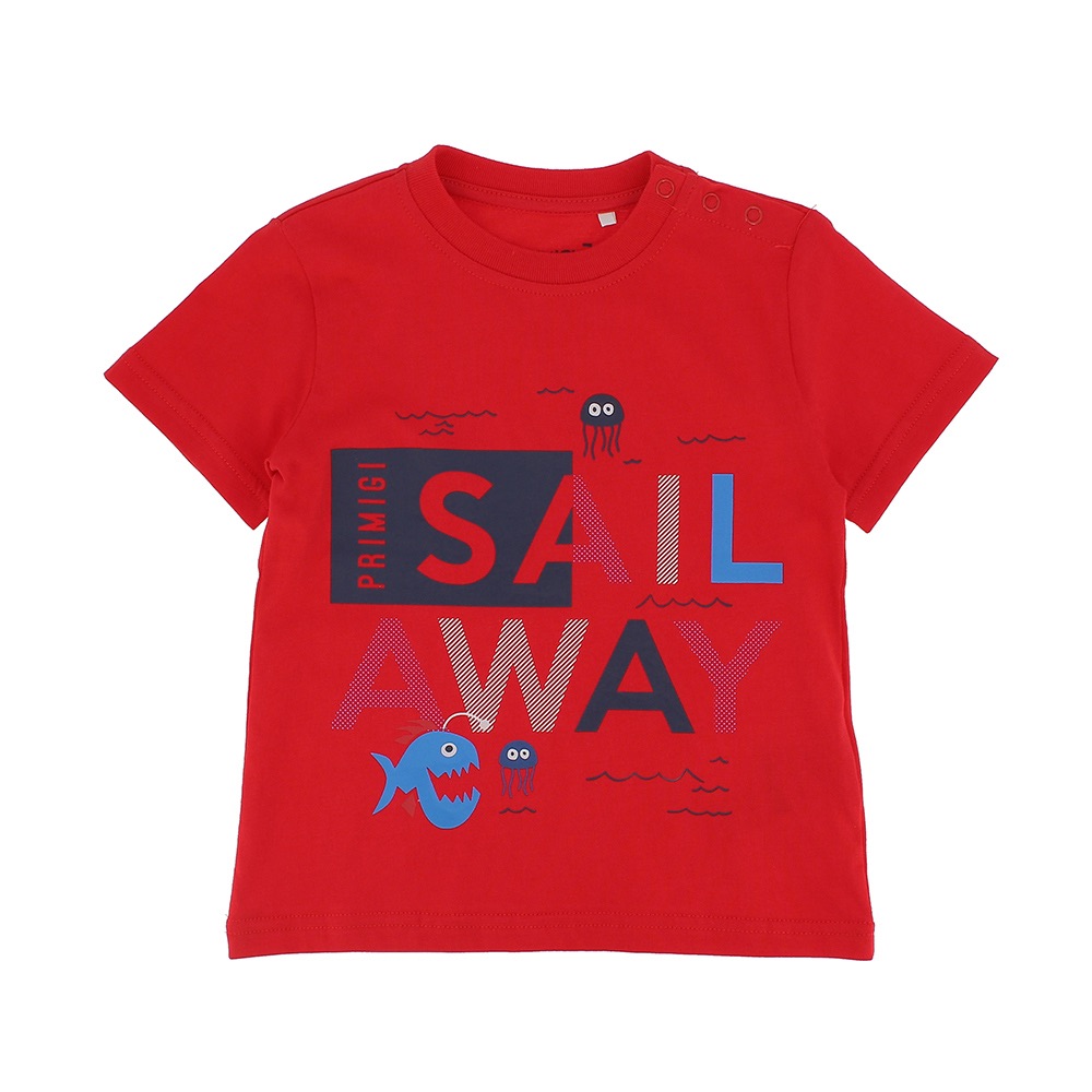 T-shirt à manches courtes col d'équipage, en jersey. Fermeture par bouton-pression sur l'épaule. Im pression frontale.