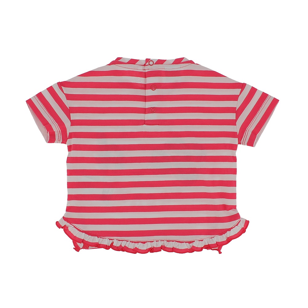 T-shirt à manches courtes col d'équipage, en jersey. Fermeture arrière avec boutons pression. Fond avec volants et fentes latérales et impression frontale.