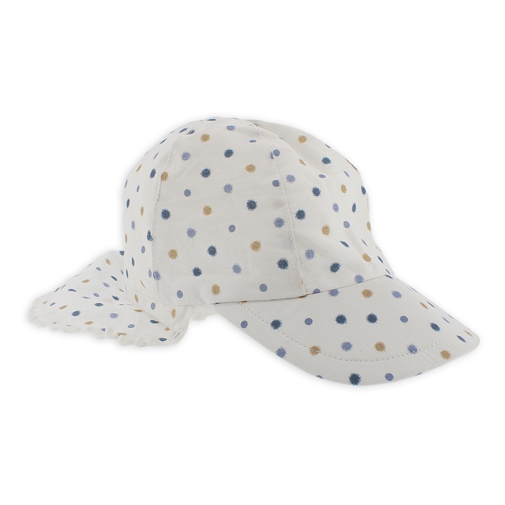 Casquette en coton à pois avec pare-soleil et visière rigide. Fermeture avec lacets et élastique su r le dos.