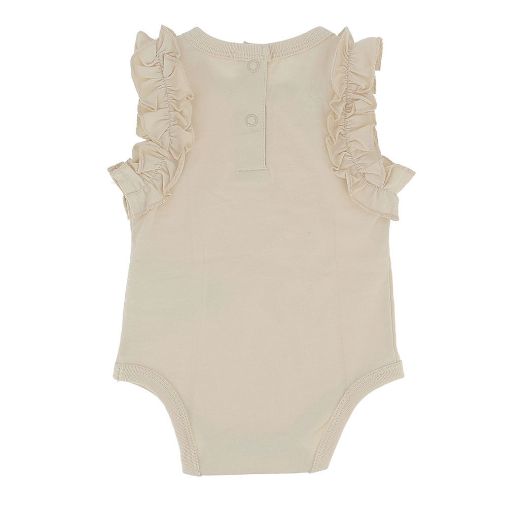 Corps en jersey, col d'équipage, avec de petits rouches sur la boucle de la manche. Fermeture par b outon-pression sur le cheval. Ce vêtement est éco-durable car il est fait de pur coton biologique.
