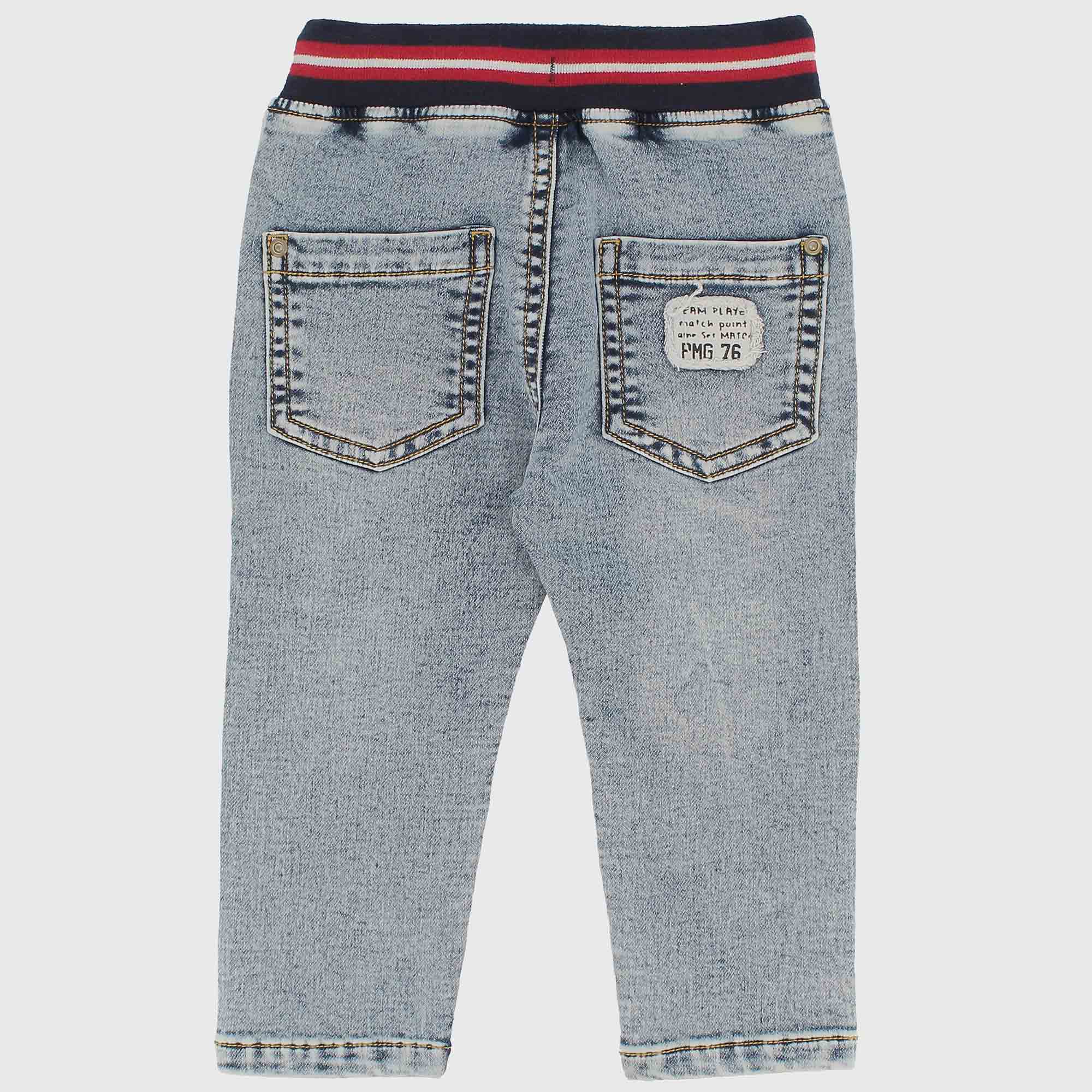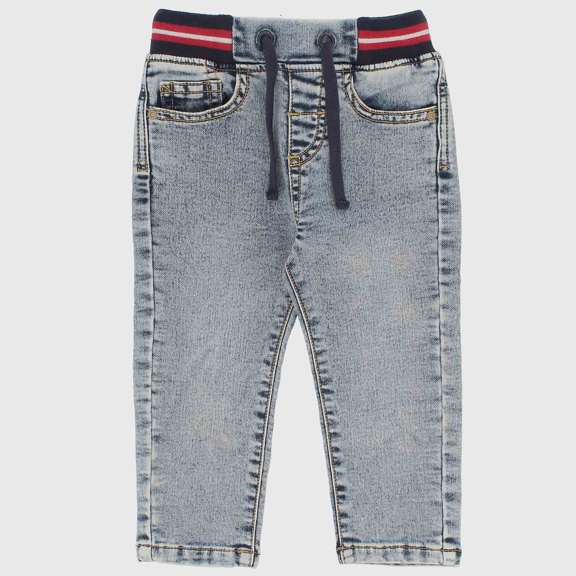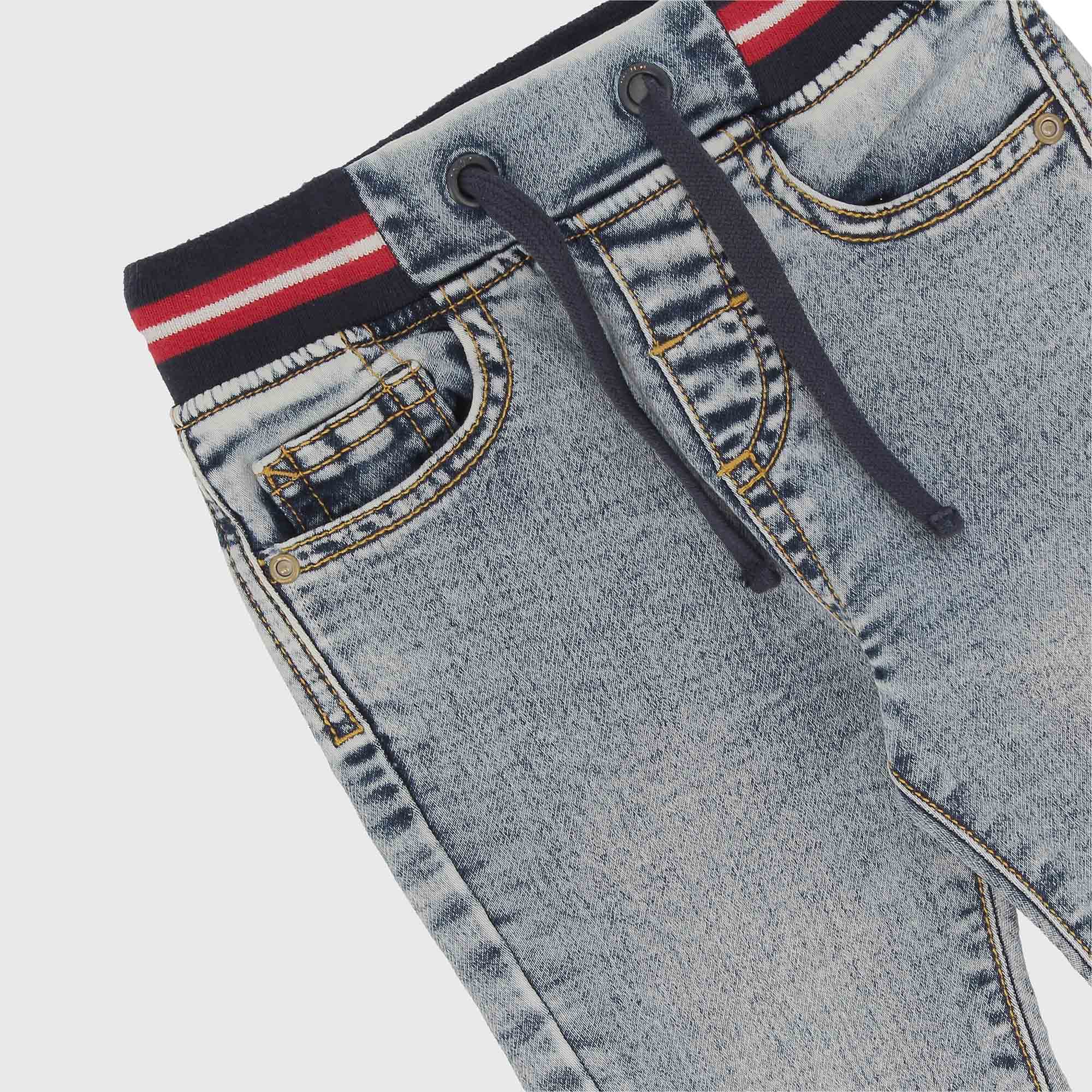 Pantalon en jeans côtelé avec taille élastiquée rayée et lacets avant. Cinq poches. Patch imprimé au dos.