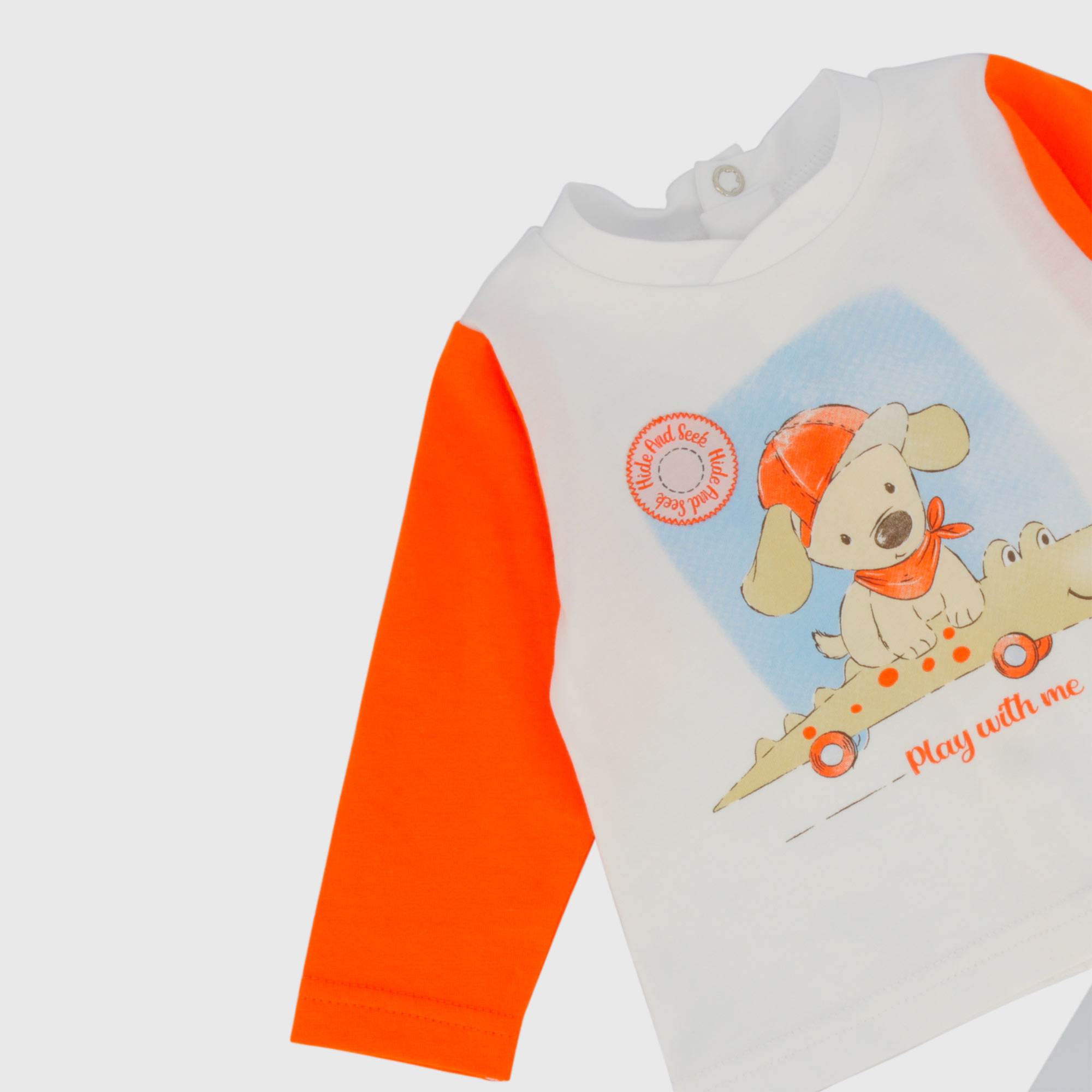 Complet composé de deux pièces. T-shirt en jersey à col rond et manches longues. Fermeture arrière avec boutons pression. Imprimé avec animaux de compagnie et patch sur le devant. Pantalon en jersey rayé avec taille et pieds élastiques.