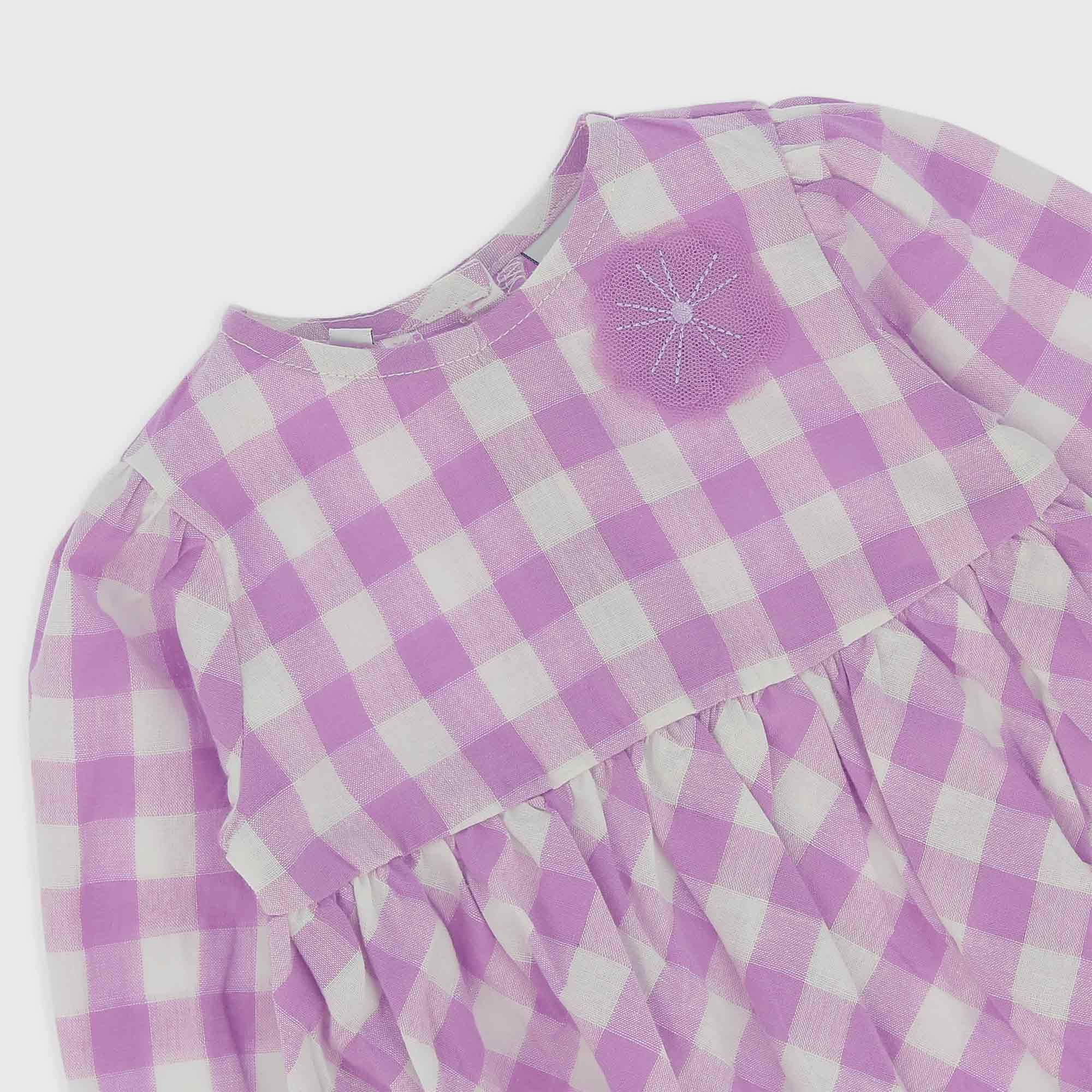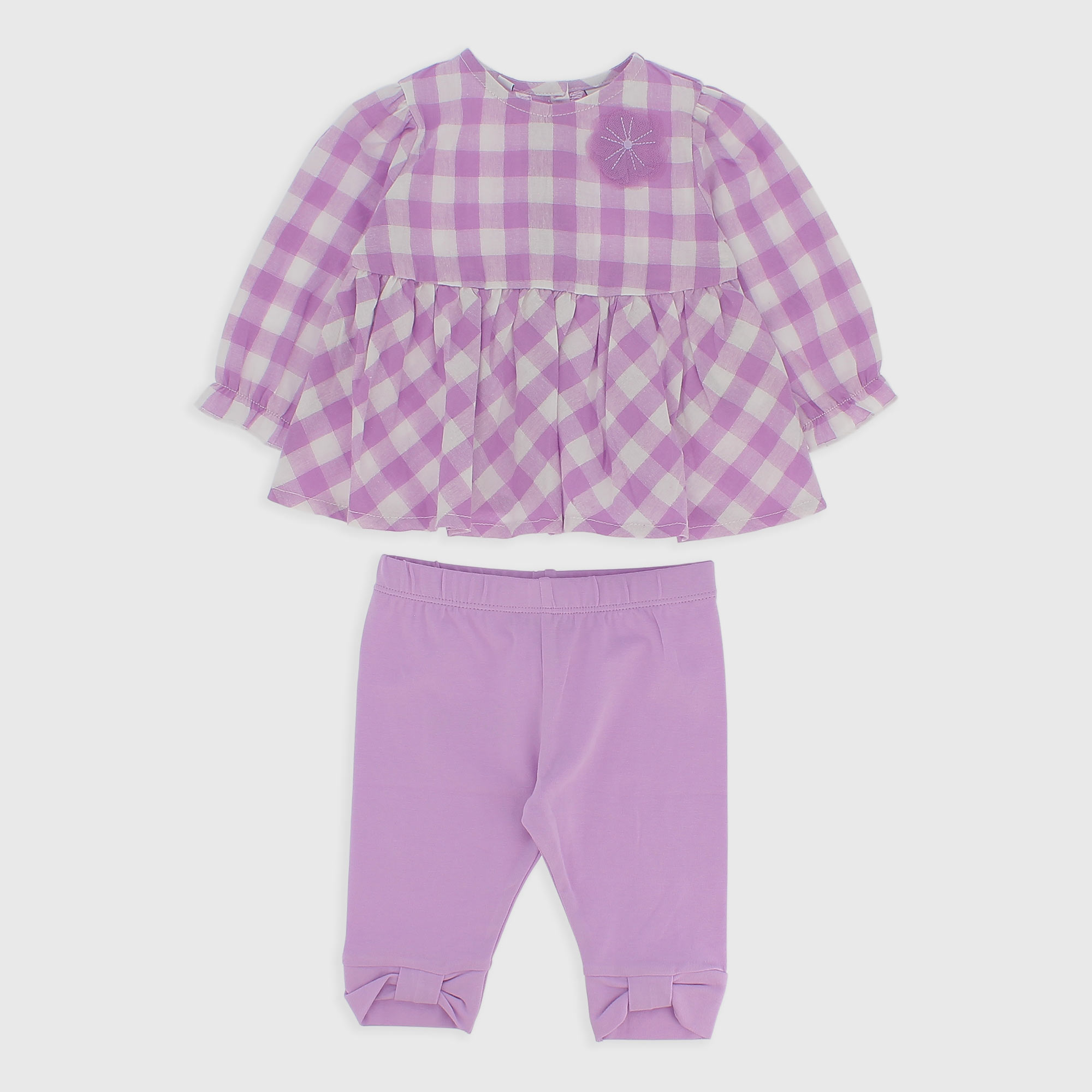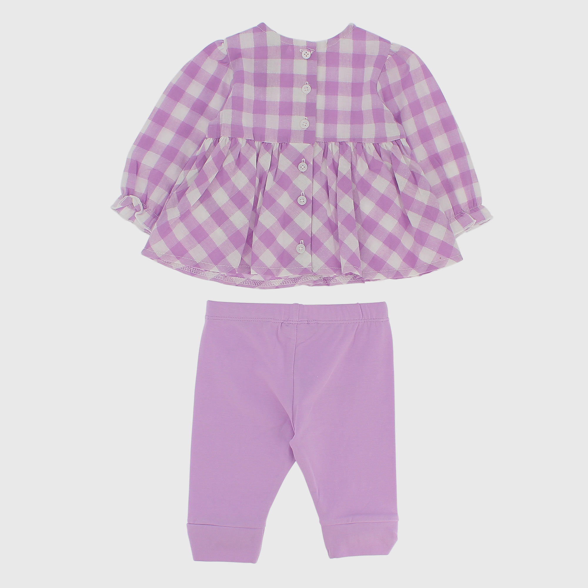Complet composé de deux pièces. Blouse en coton à carreaux, col rond, manches longues. Fermeture arrière avec boutons. Fleur de tulle sur le devant. Leggings en jersey avec taille élastiquée et bas avec nœud.