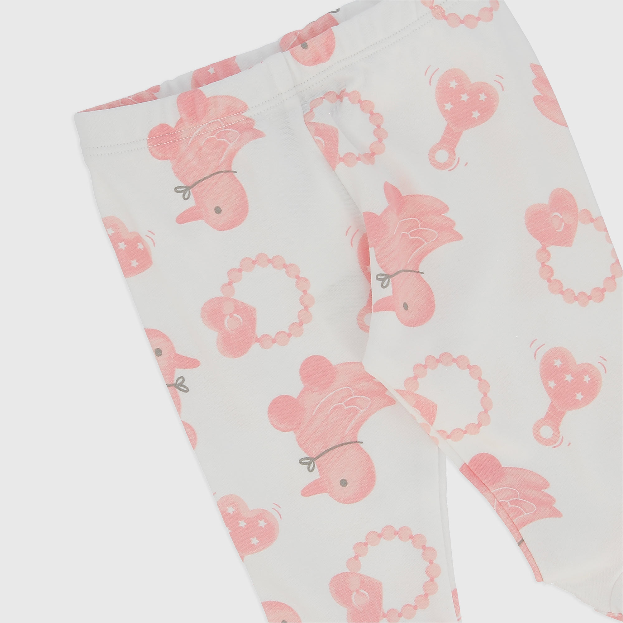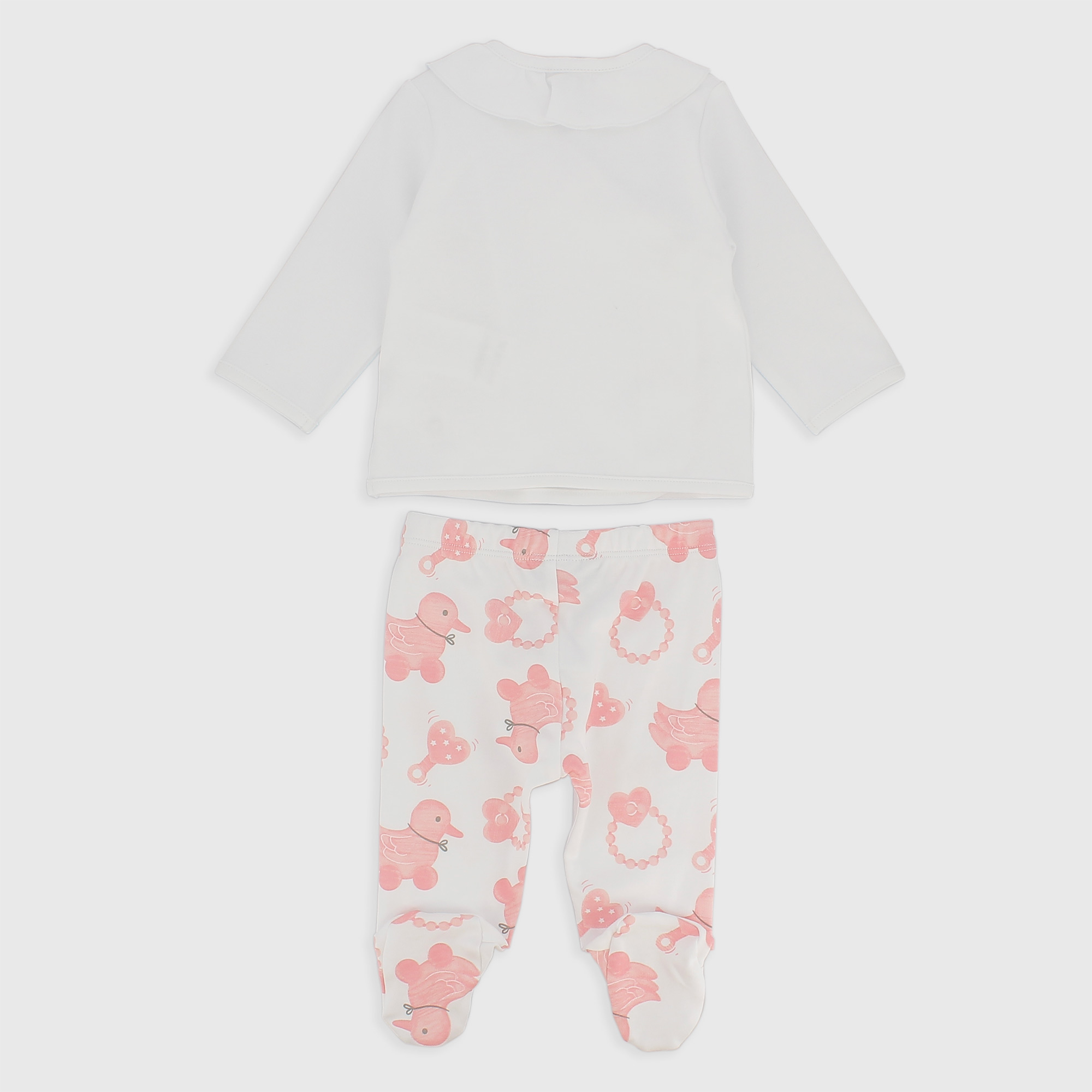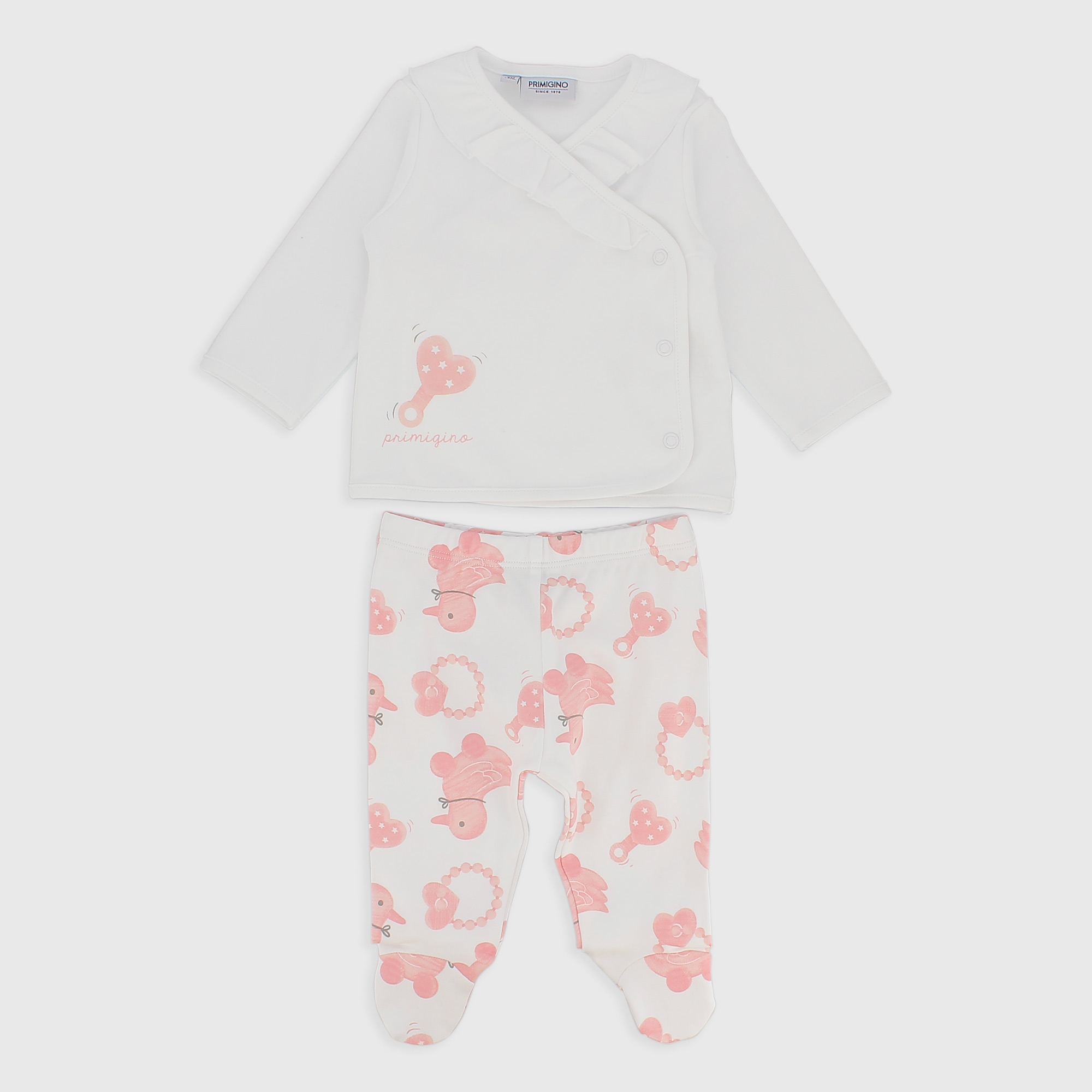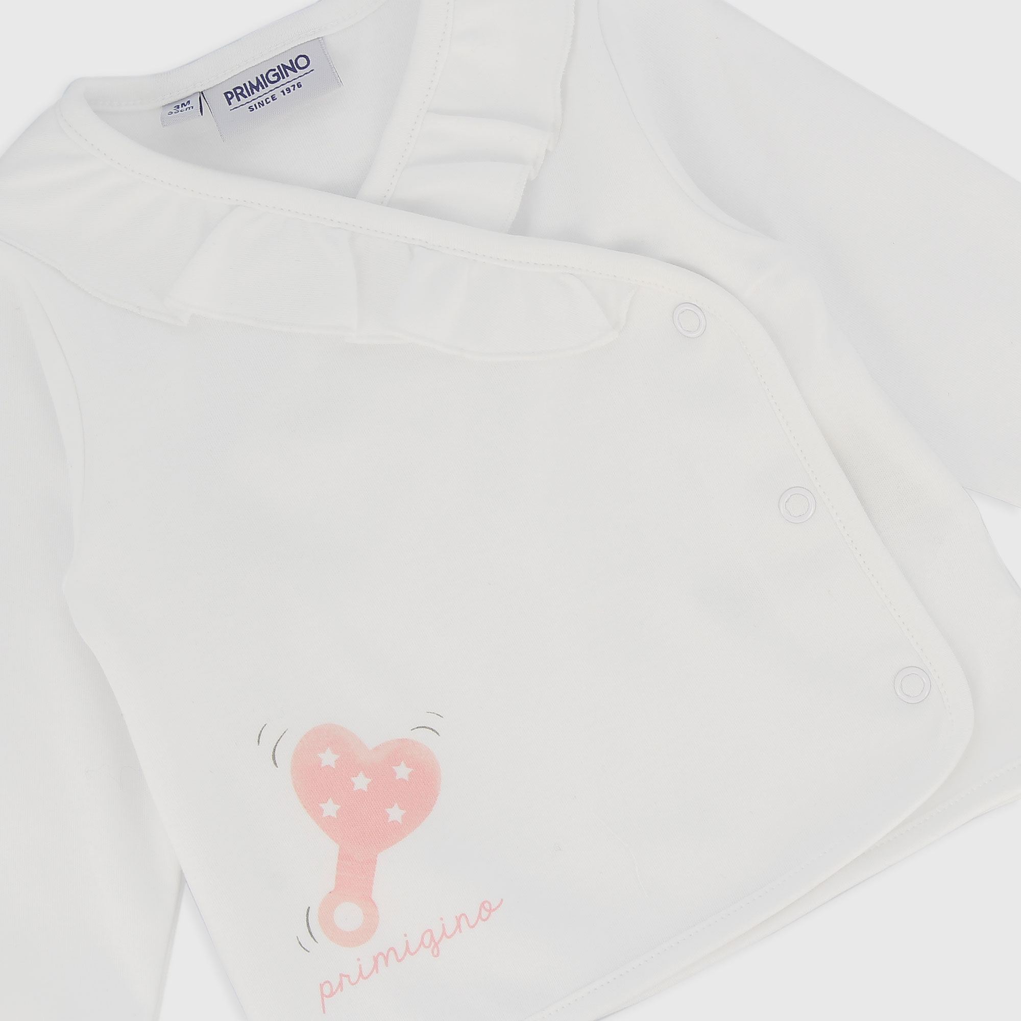 Complet composé de deux pièces. T-shirt en coton à manches longues avec des volants sur le décolleté. Fermeture genre kimono avec boutons-pression. Imprimé sur le devant. Pantalon en coton avec taille et pieds élastiques, imprimés intégral.