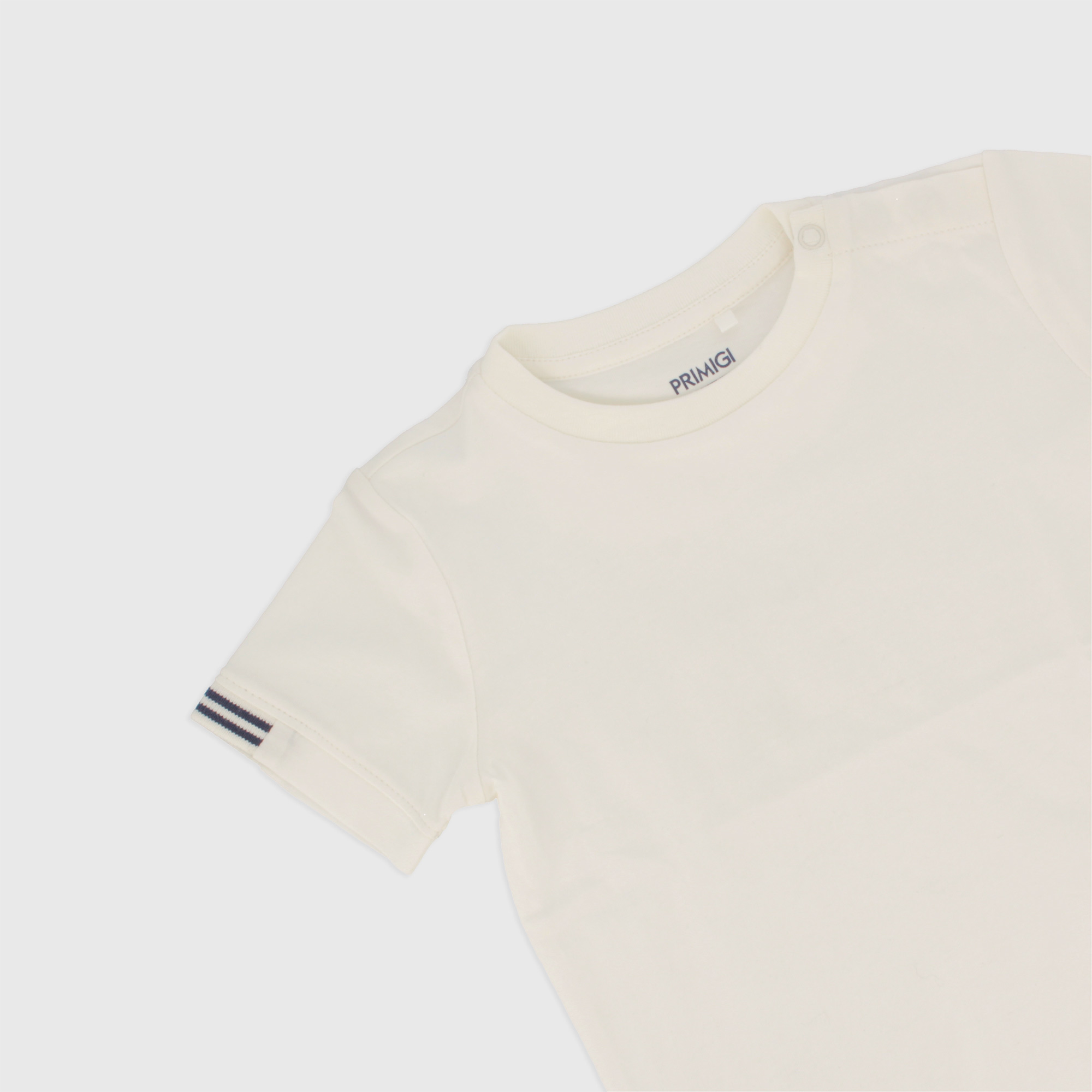 T-shirt en jersey, col rond, manches courtes. Fermeture avec bouton à pression sur l’épaule. Insert rayé côtelé sur le bas de la manche.