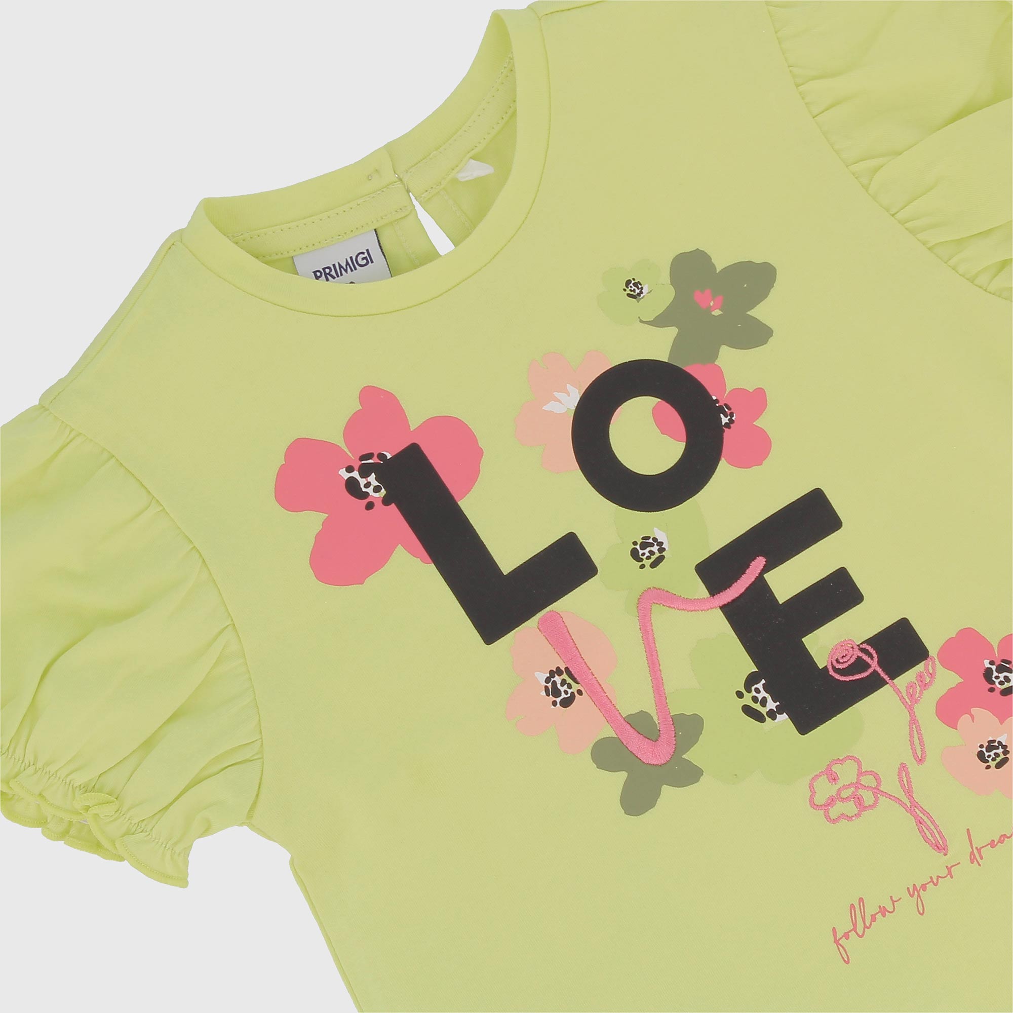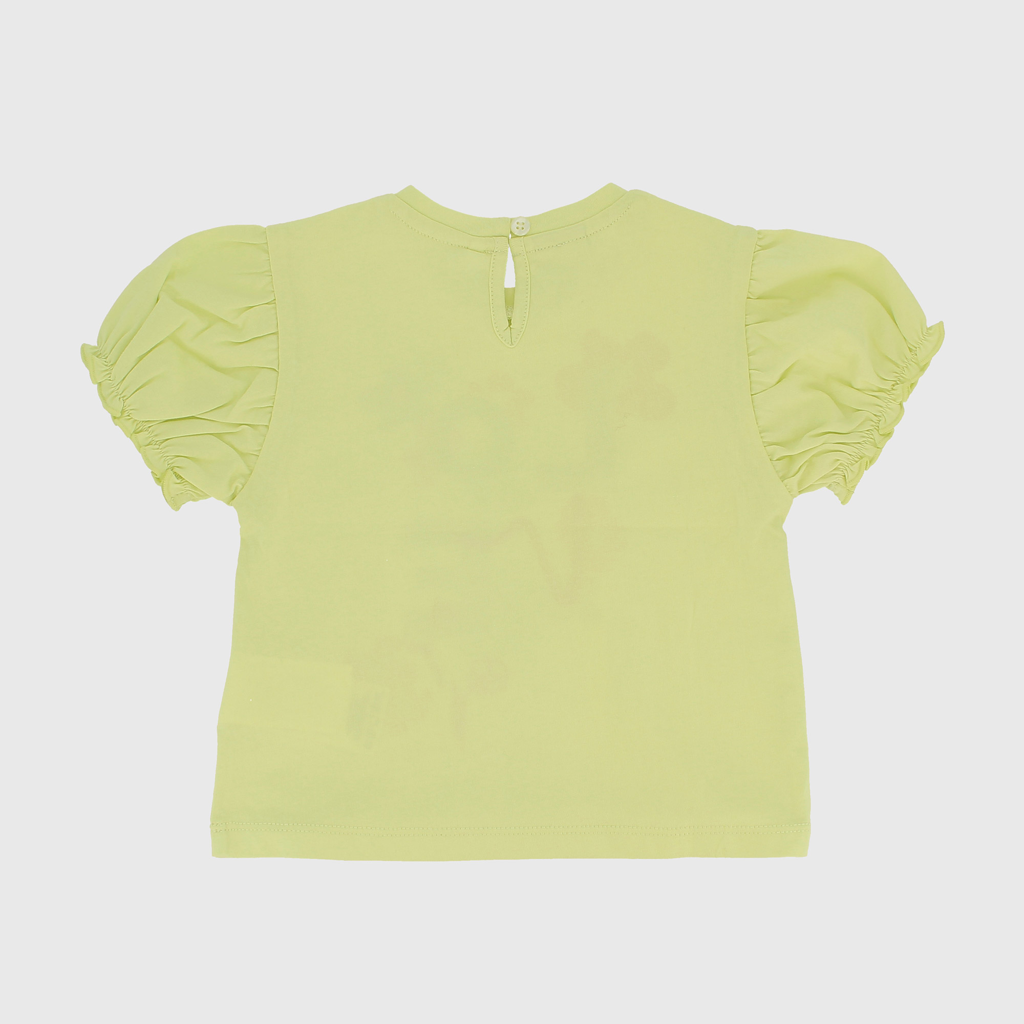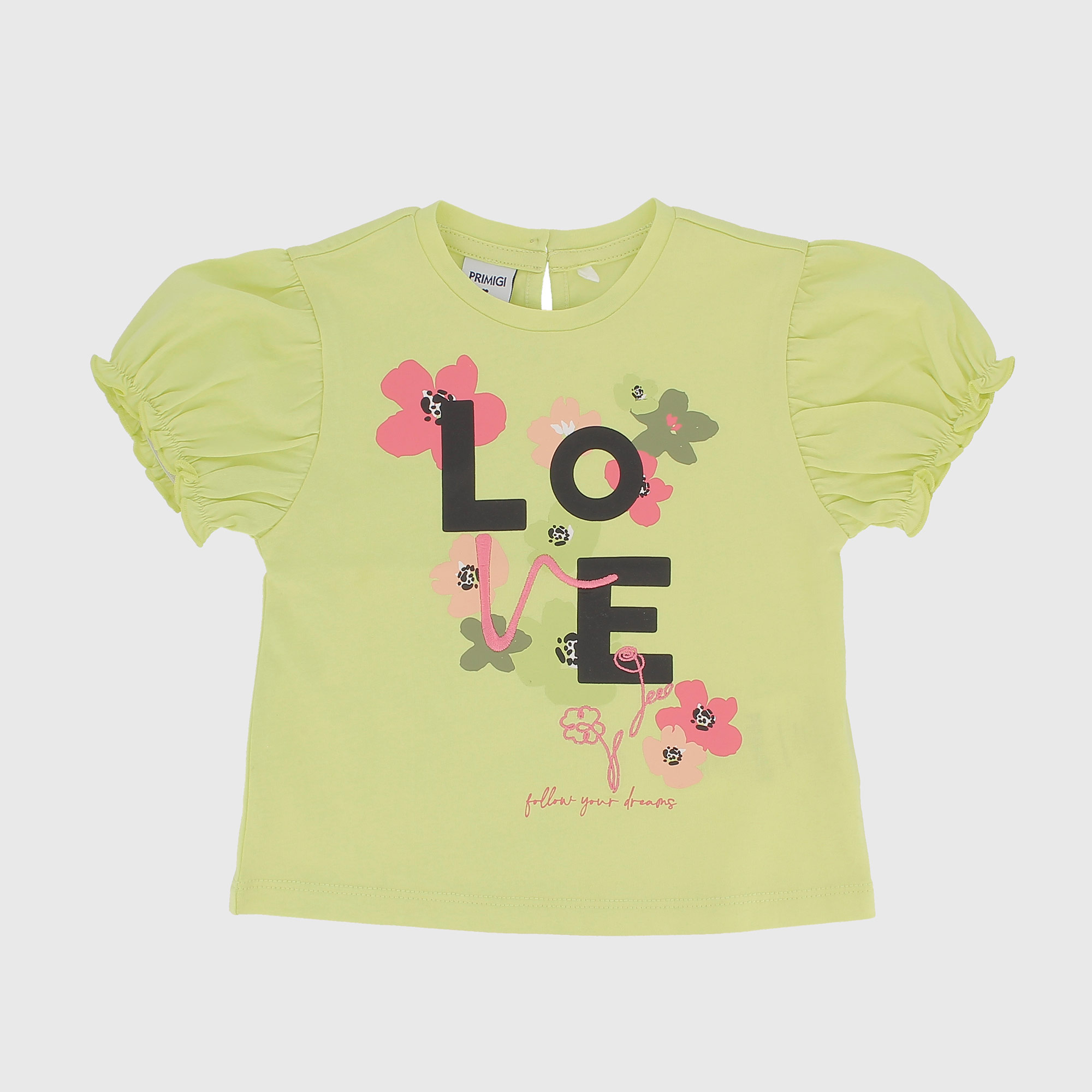 T-shirt en jersey, col équipage, ballon à manches courtes. Fermeture arrière avec boutons pression. Impression et broderie frontale.