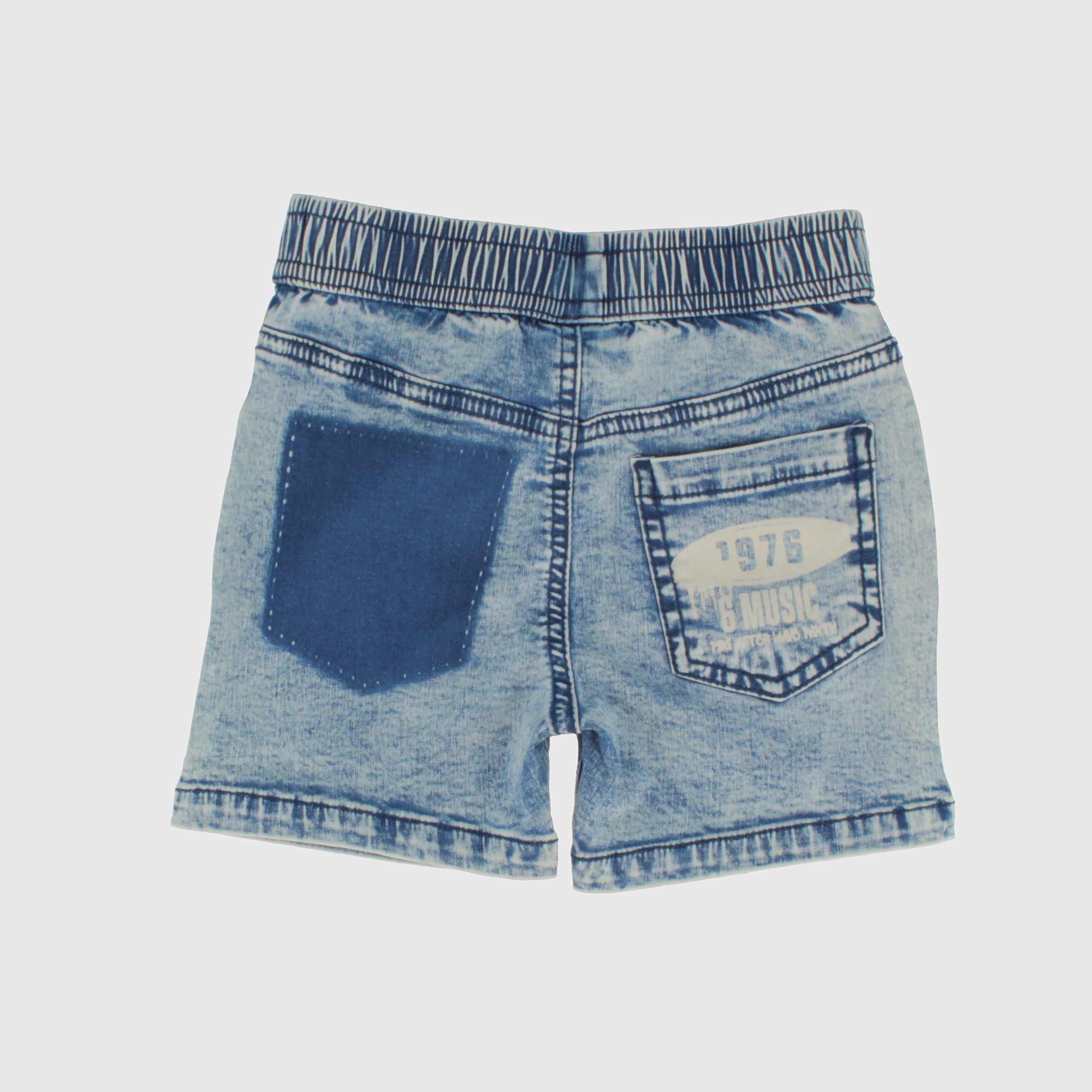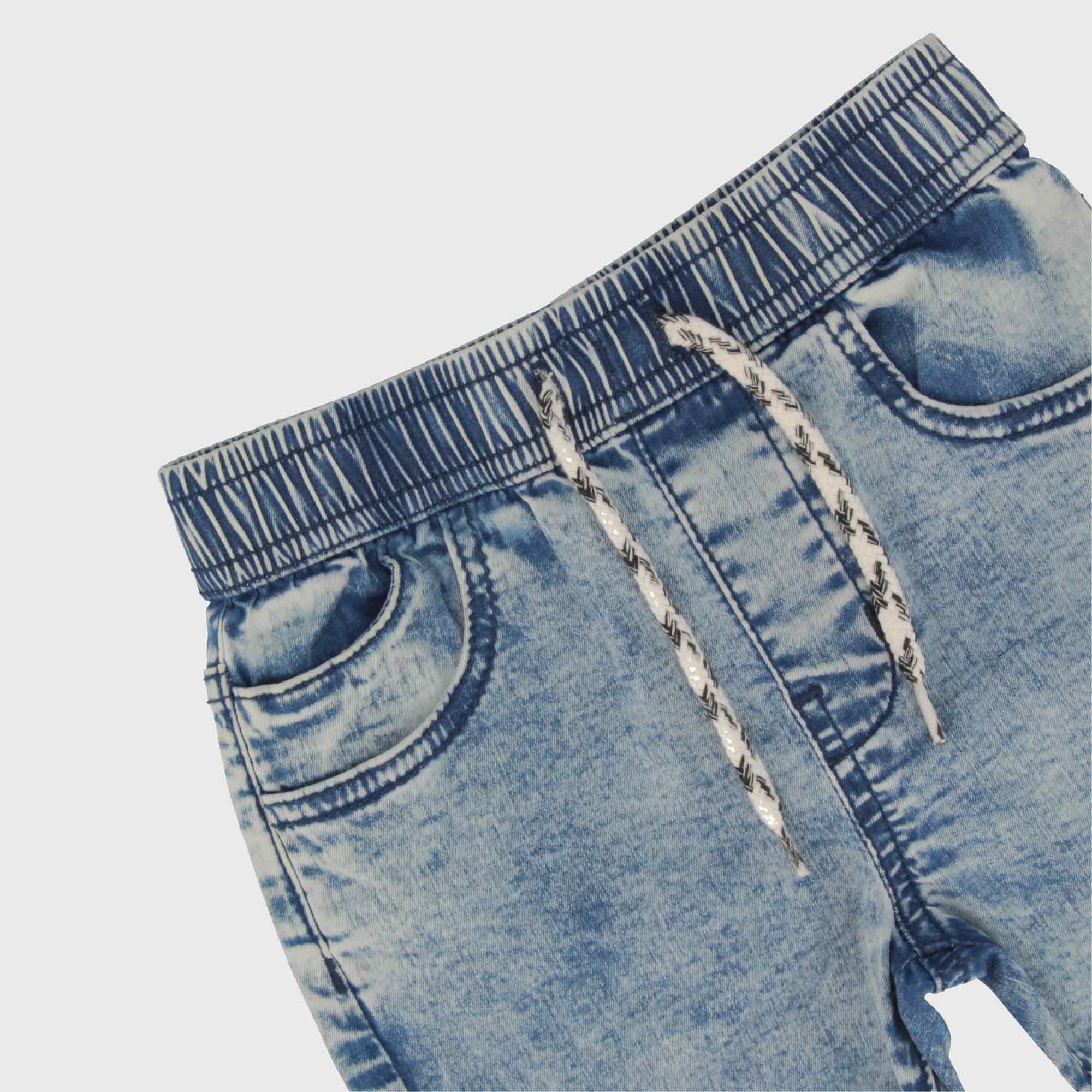Bermuda en jeans tricotés avec taille élastiquée et lacets avant. Poches avant et poche arrière. Fond avec rabat.