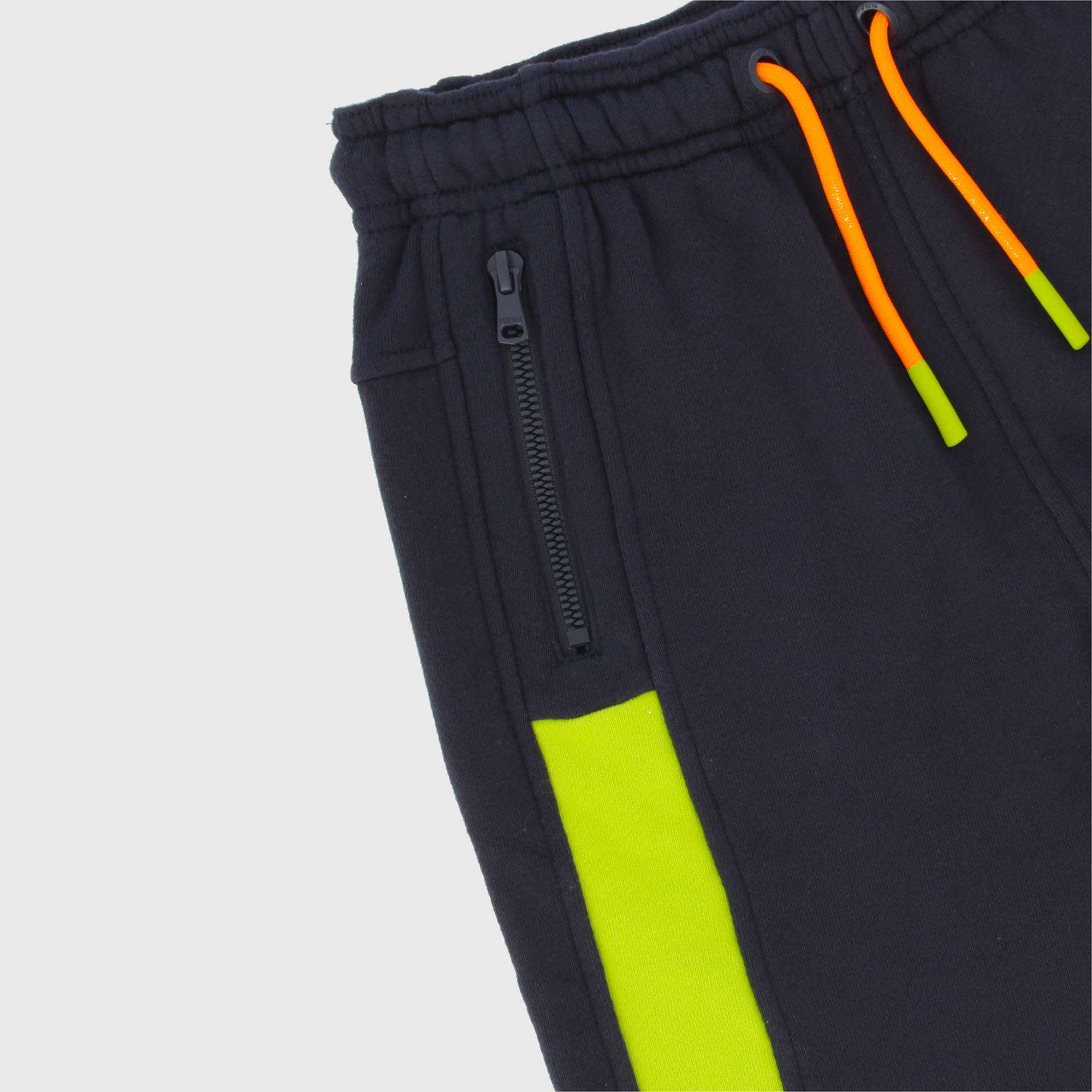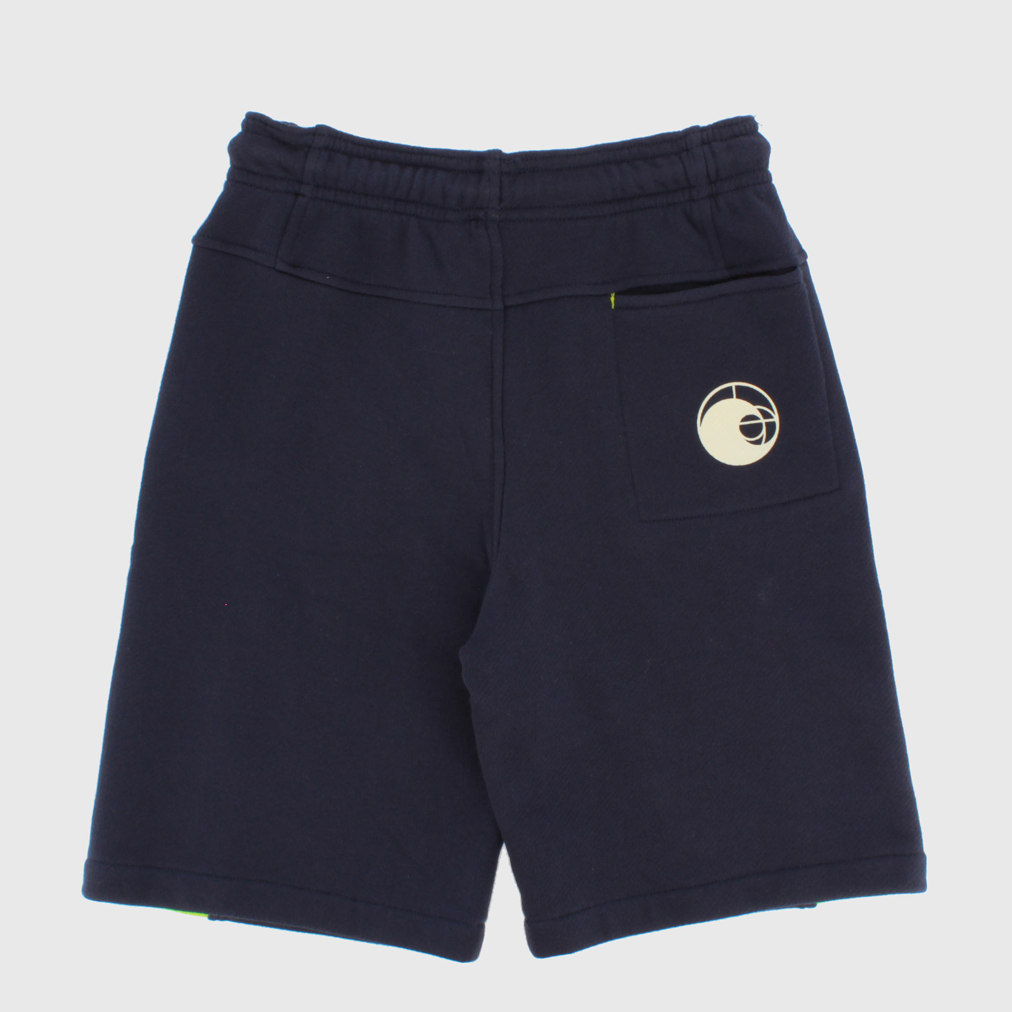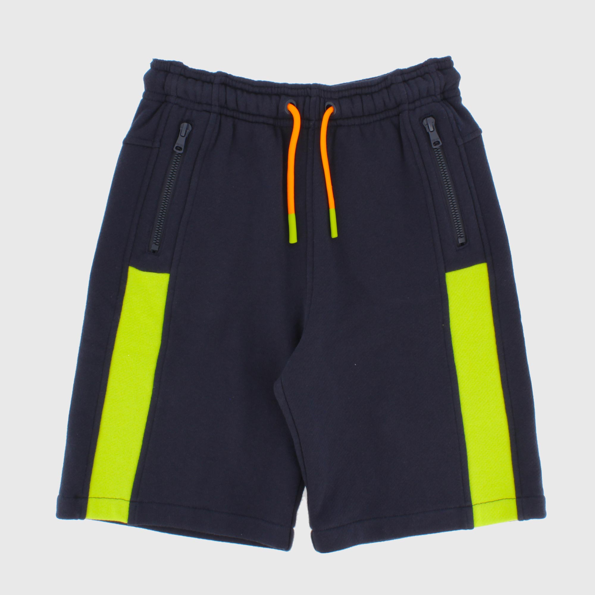 Bermuda en sweat avec taille élastiquée et lacets avant. Poches latérales avec zip et poche arrière avec broderie. Inserts en tissu contrastants.