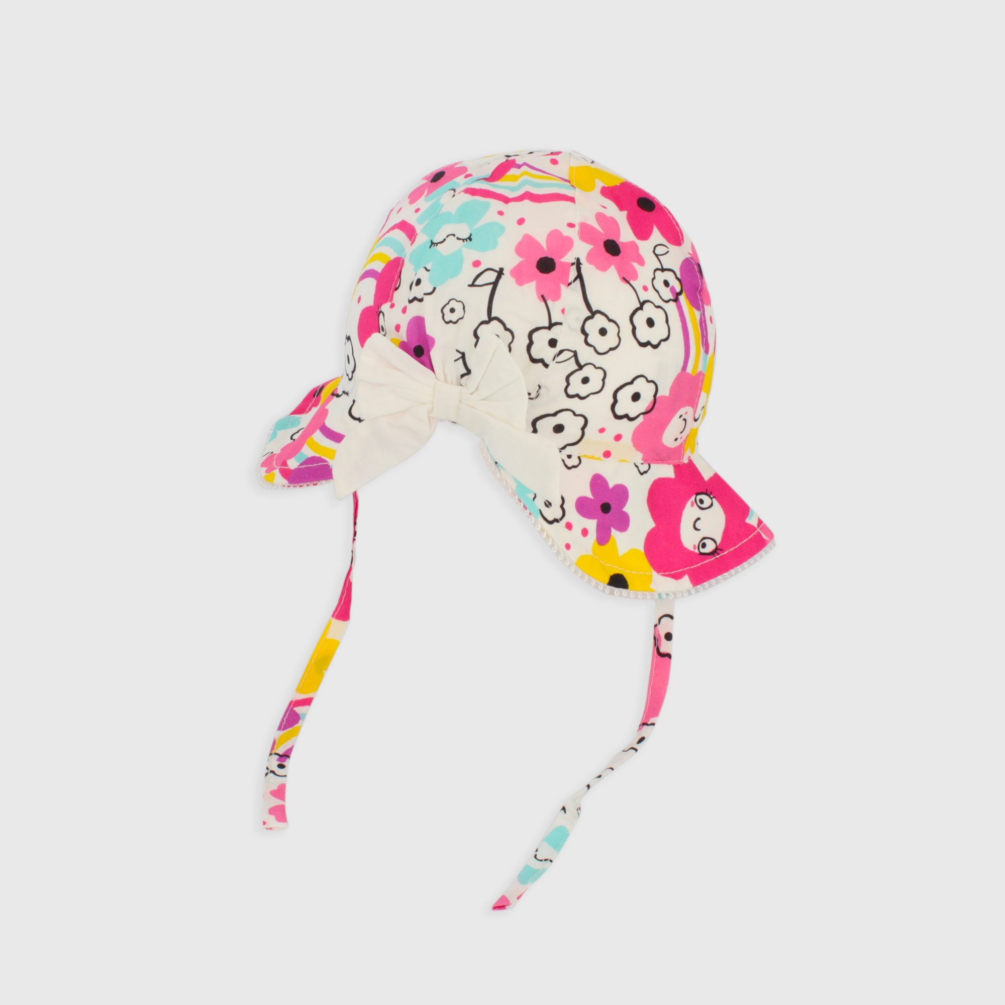 Chapeau en coton à motifs. Volants sur le bord et arc appliqué. Intérieur doublé.