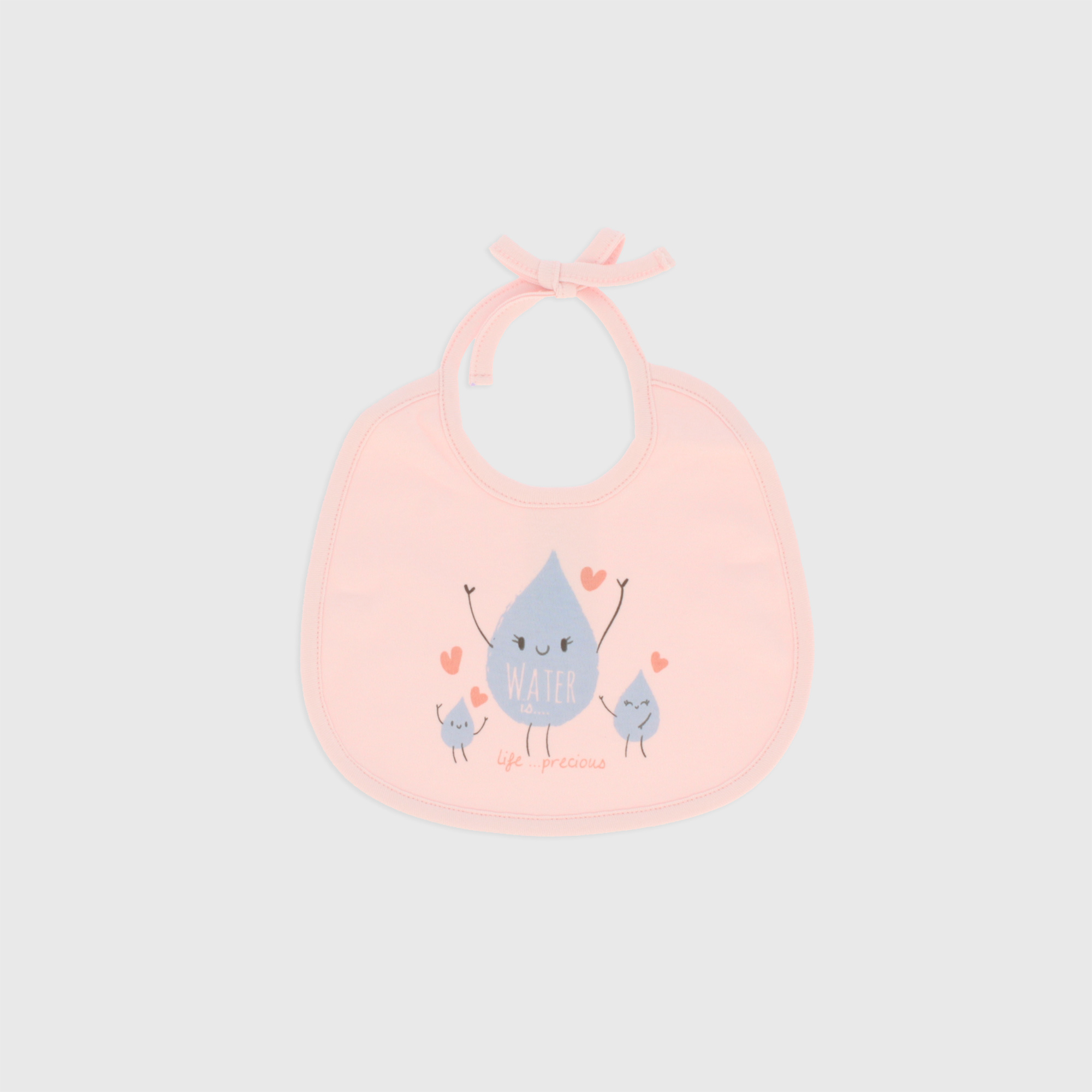 Bavoir en coton avec sangle et imprimé sur le devant. Ce vêtement est éco-durable car il est principalement fabriqué avec du coton biologique.