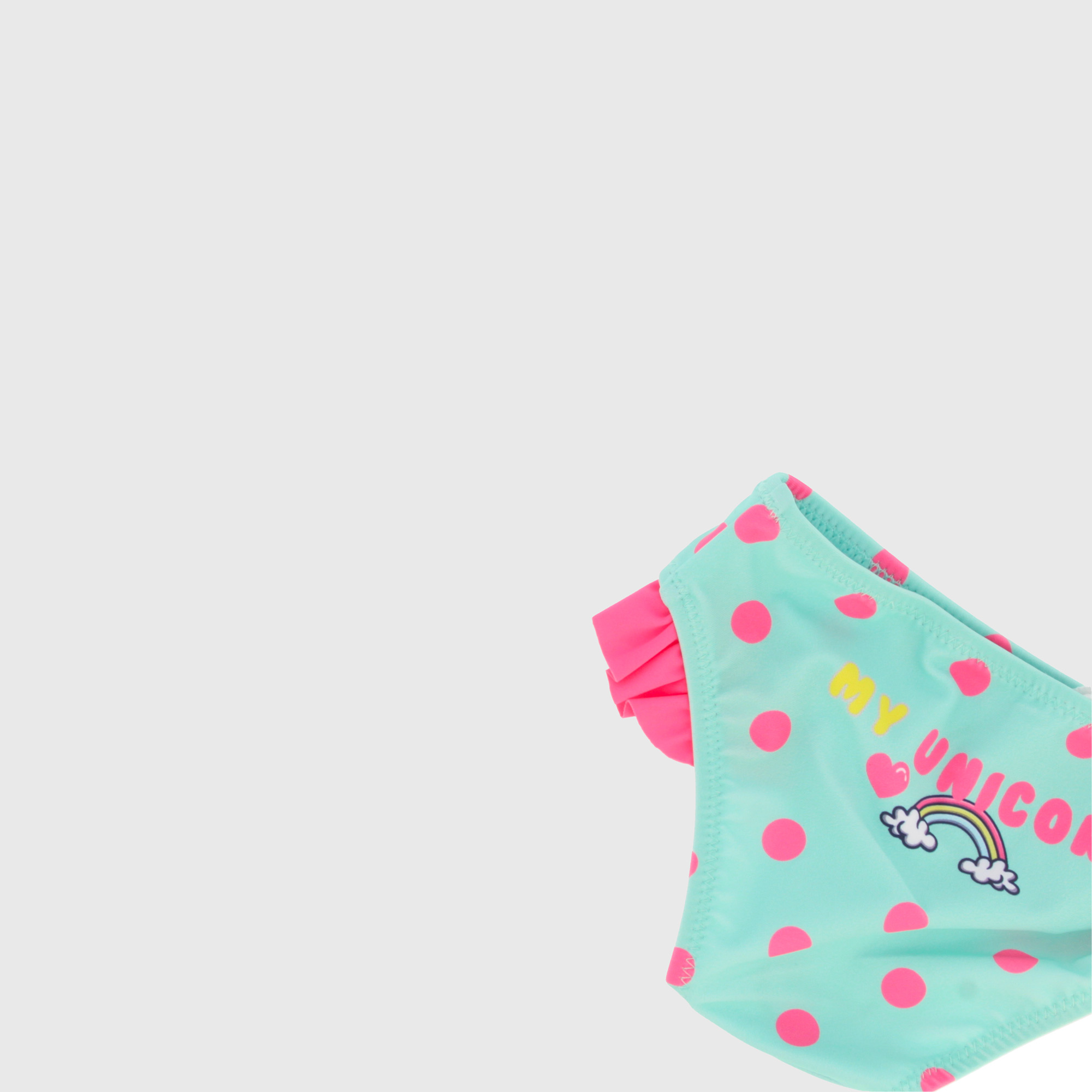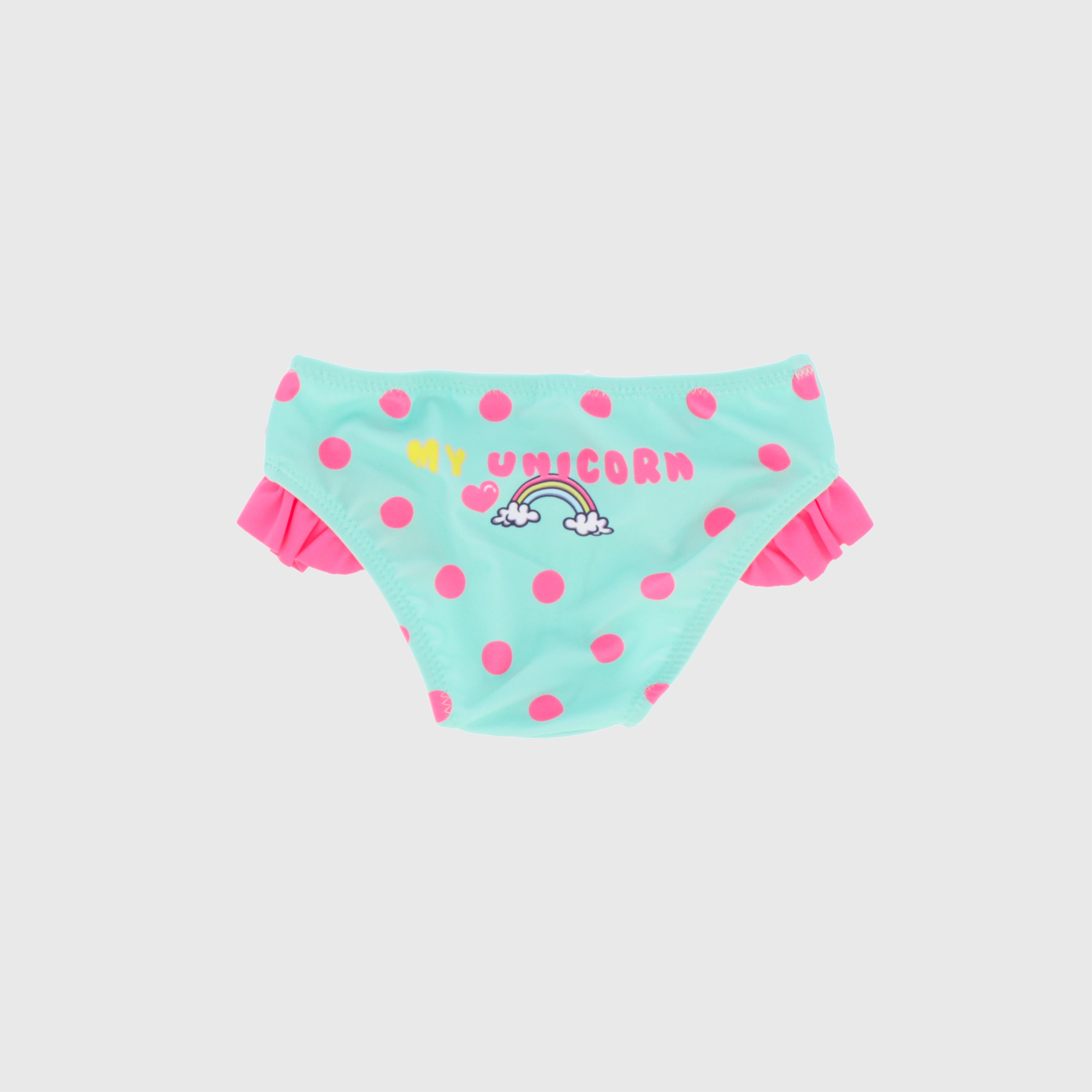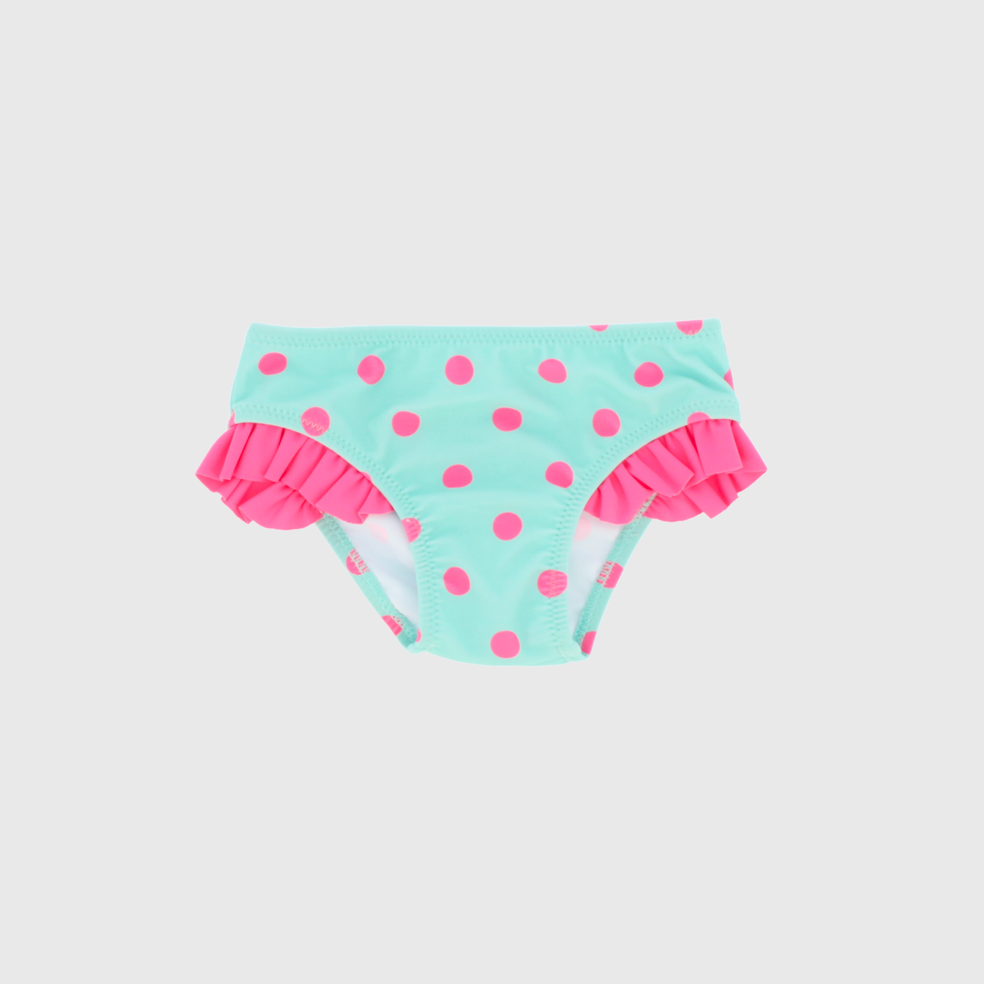 Slip de bain à motifs avec taille élastiquée et petits volants sur les côtés.