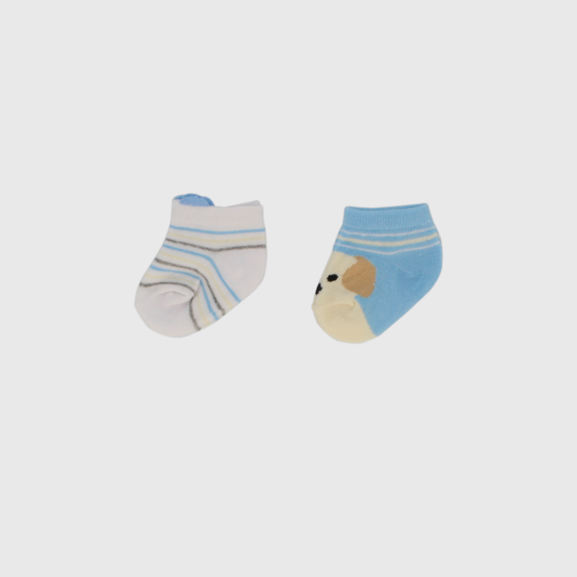 Pack composé de deux paires de chaussettes courtes pour nouveau-nés. Une paire rayée avec des oreilles et une paire avec un motif de chien. Bords élastiques.