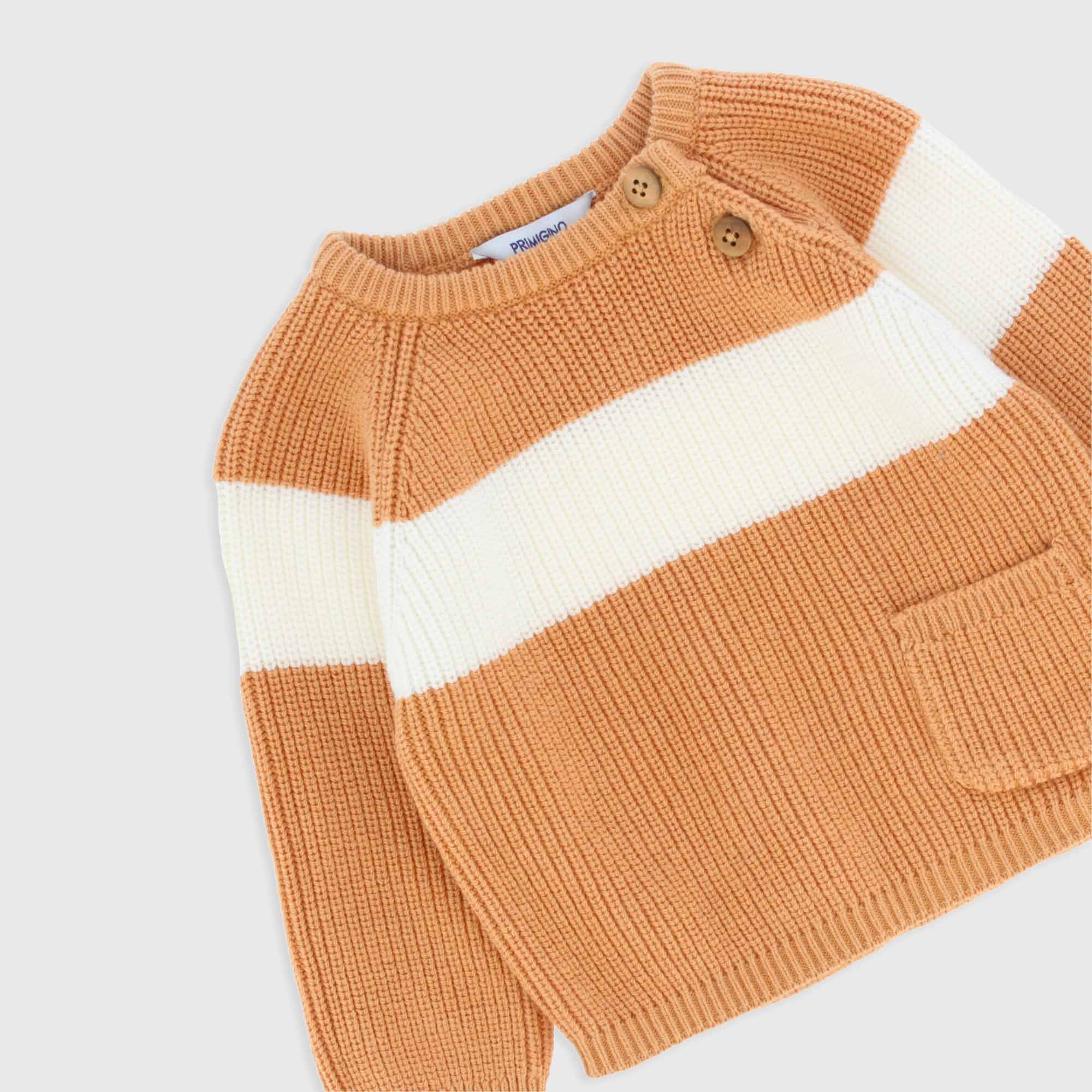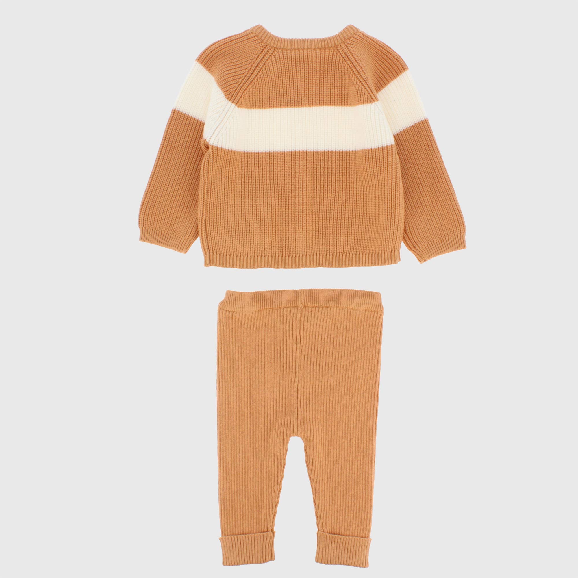 Combiné en tricot composé de deux pièces. Pullover côtelé col rond, manches longues. fermeture avec boutons sur côté e poche appliquée. pantalon côtelé avec taille élastique.