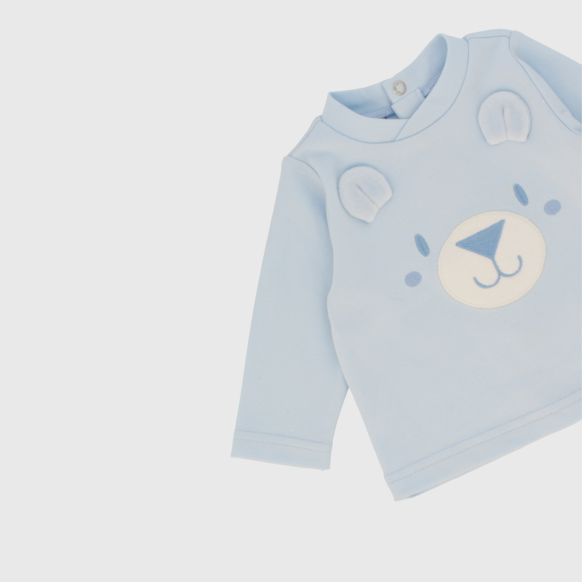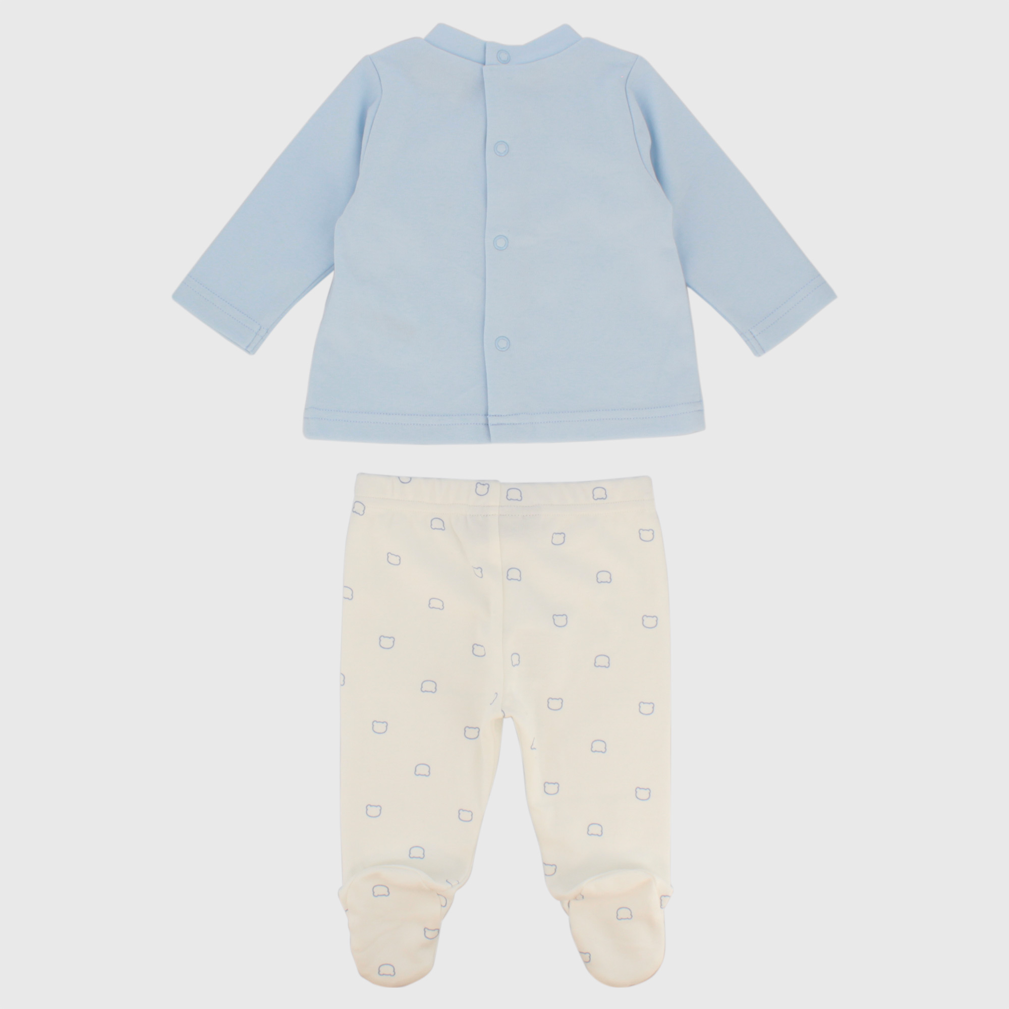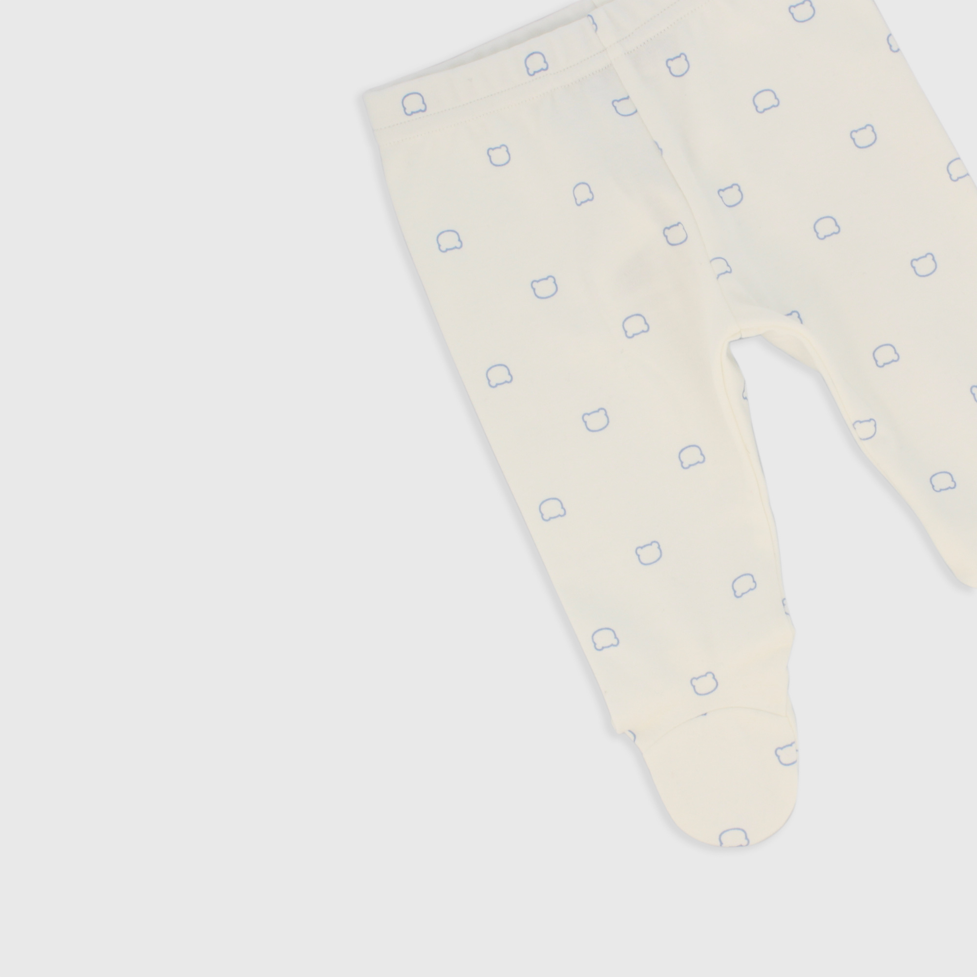 Combiné composé de deux pièces. pull en interlock col rond, manches longues. fermeture arrière avec boutons automatiques. ours brodé devant. guêtres en interlock avec taille élastique e pieds, imprimé all-over avec ours .