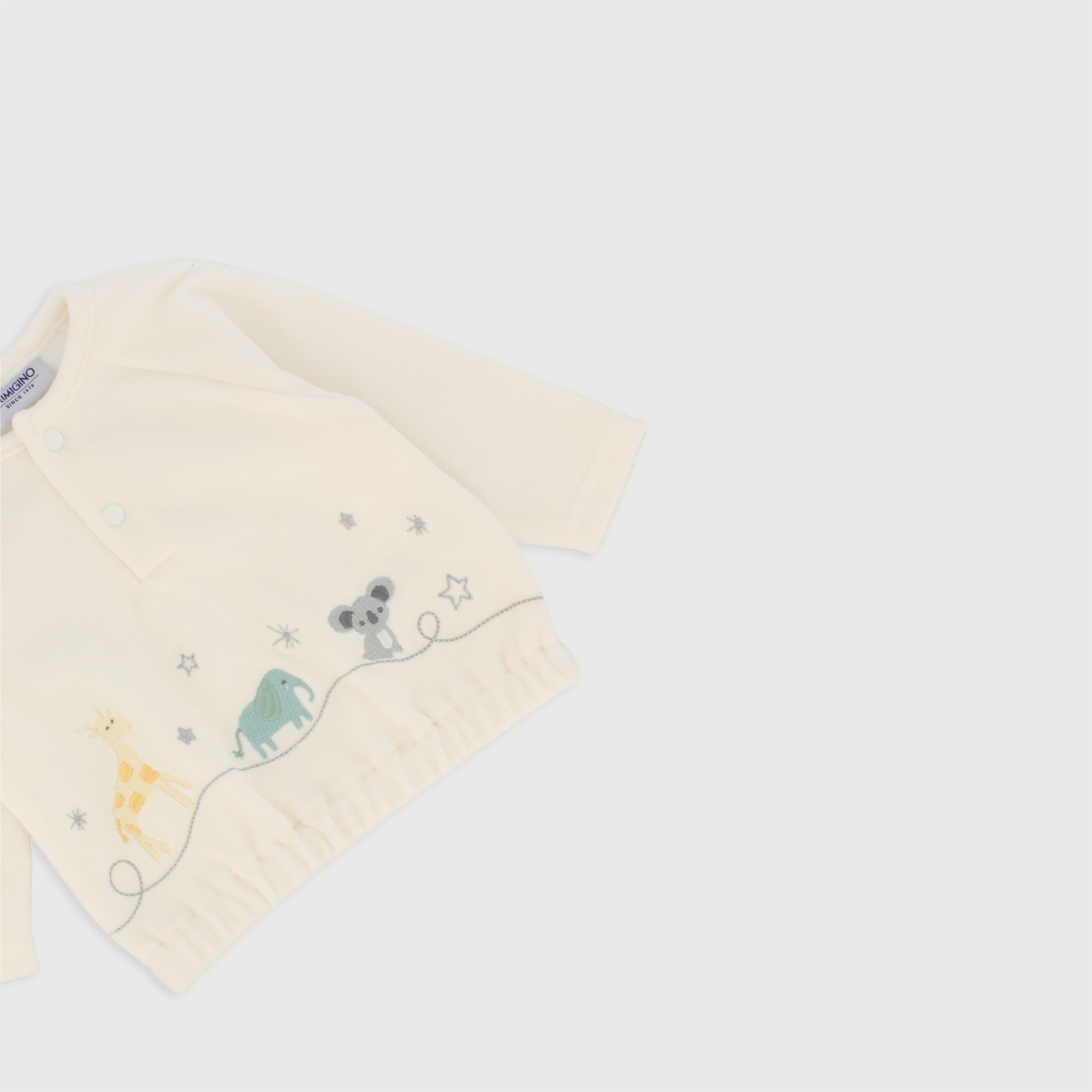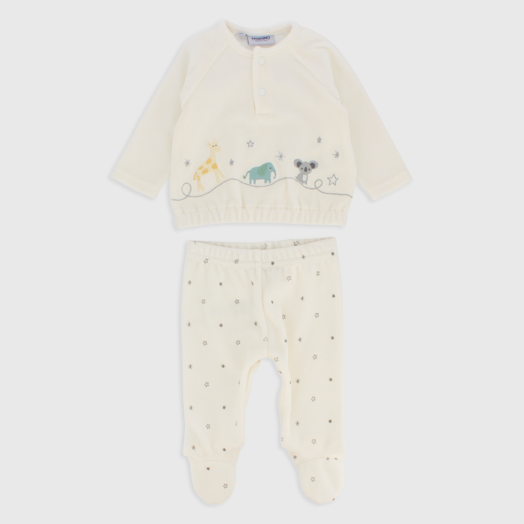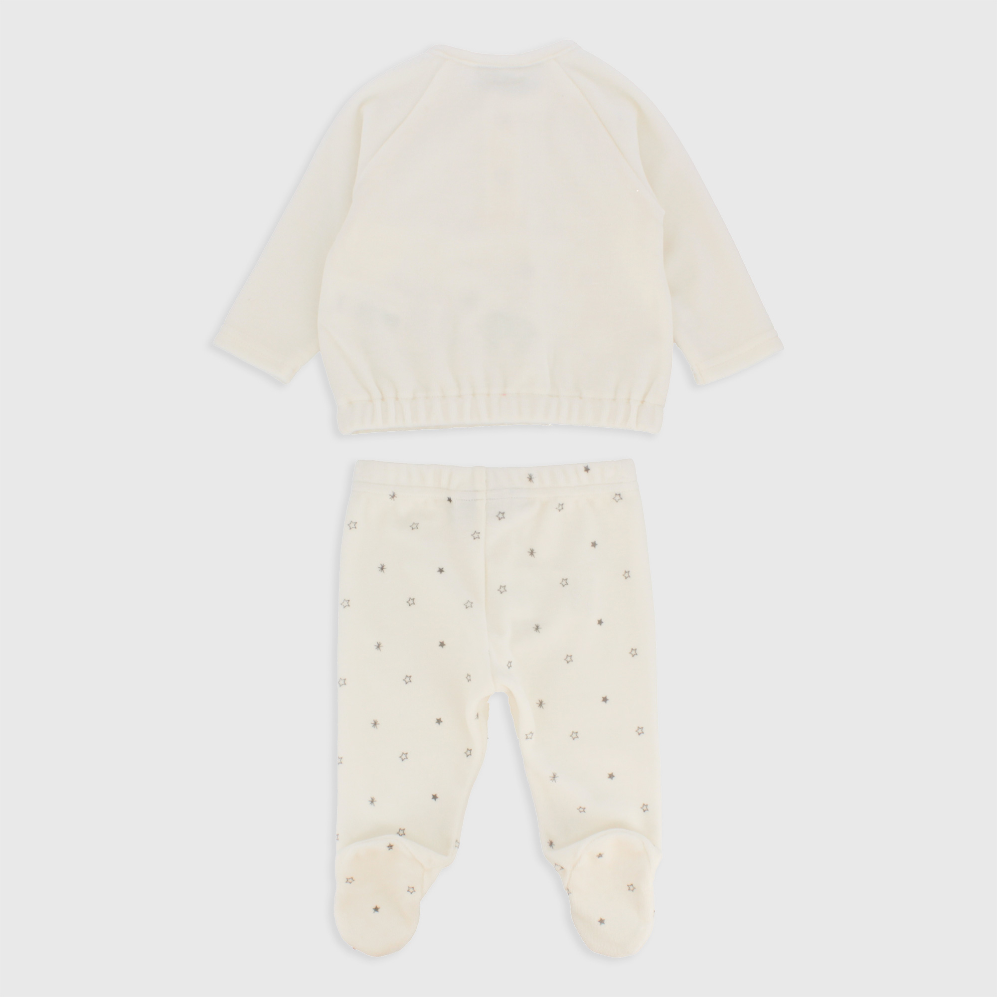 Combiné composé de deux pièces. pull en chenille avec col rond, manches longues. boutons devant. animaux brodés, et fond avec élastique.guêtres en chenille avec taille élastique e pieds. imprimé all-over avec étoiles.