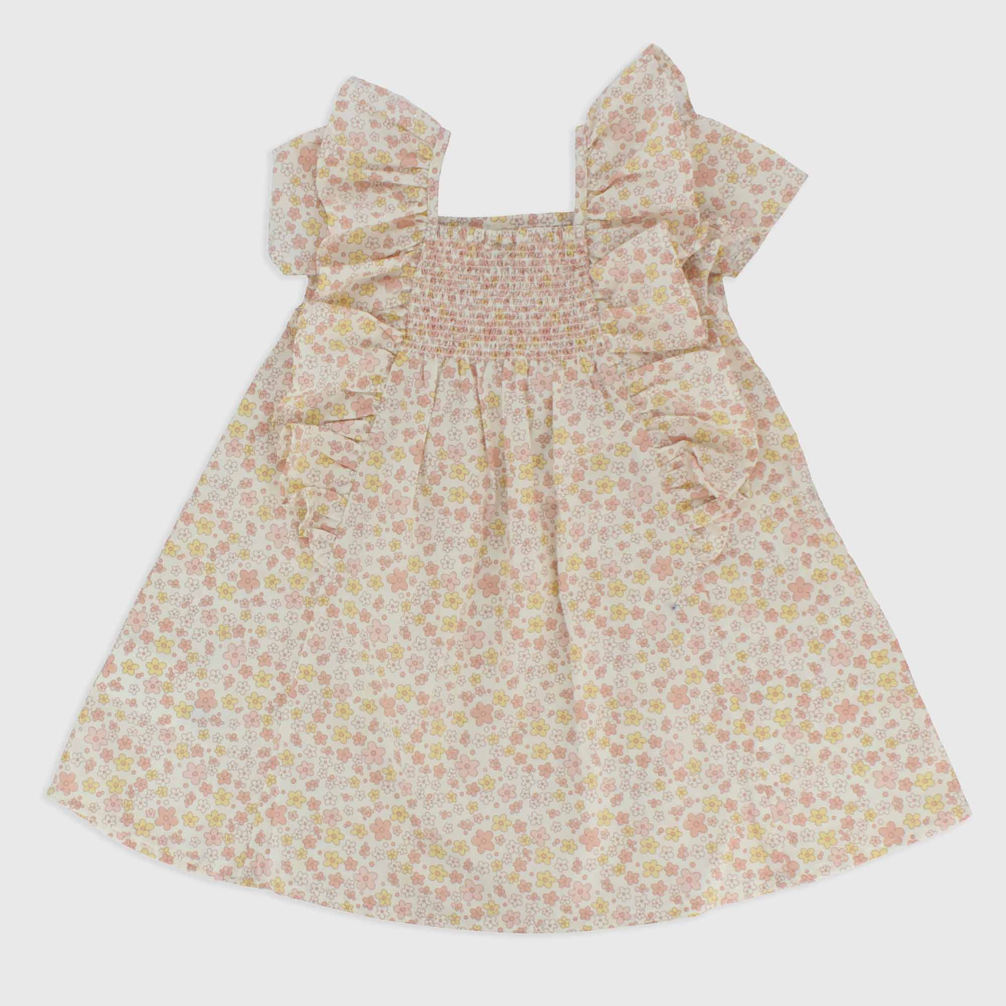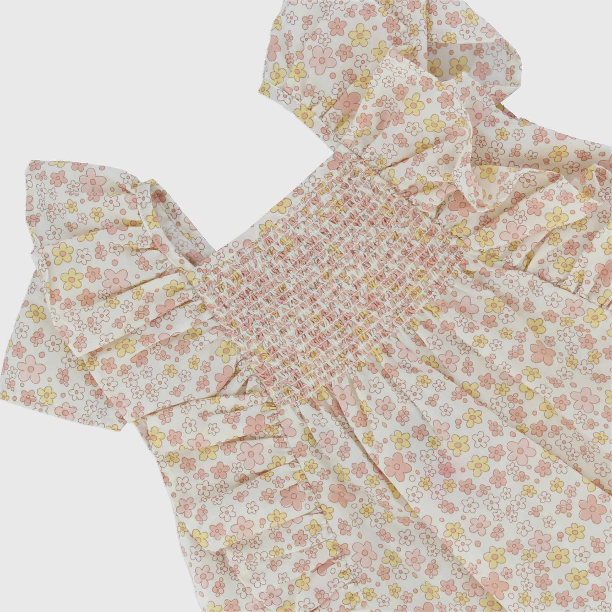 Robe en coton imprimé, encolure carré, avec manches courtes et volants appliqués. Boucles élastique sur épaules et derrière.