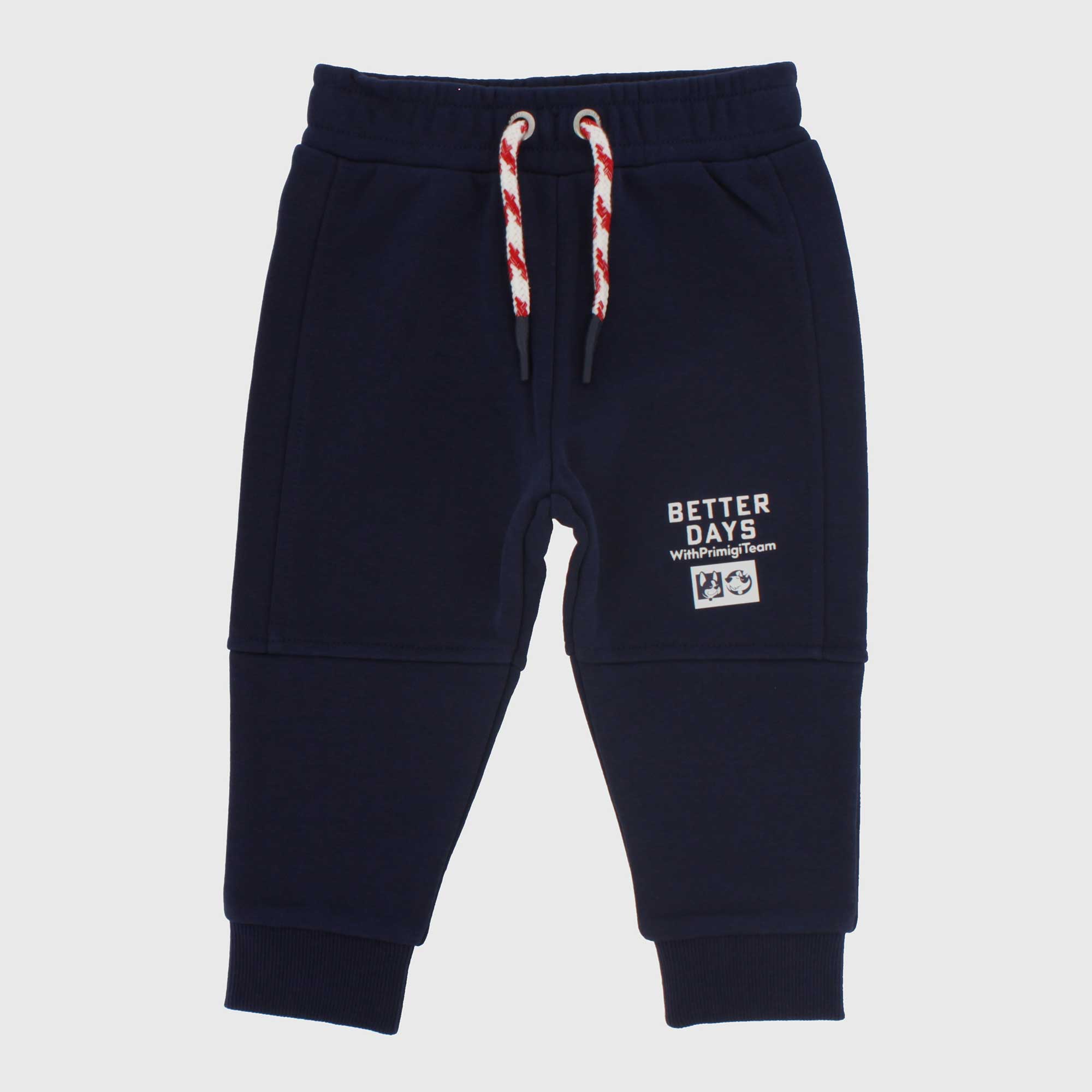 Pantalon en molleton avec taille élastique et lacets devant. Petit imprimé devant. Fond côtelé.