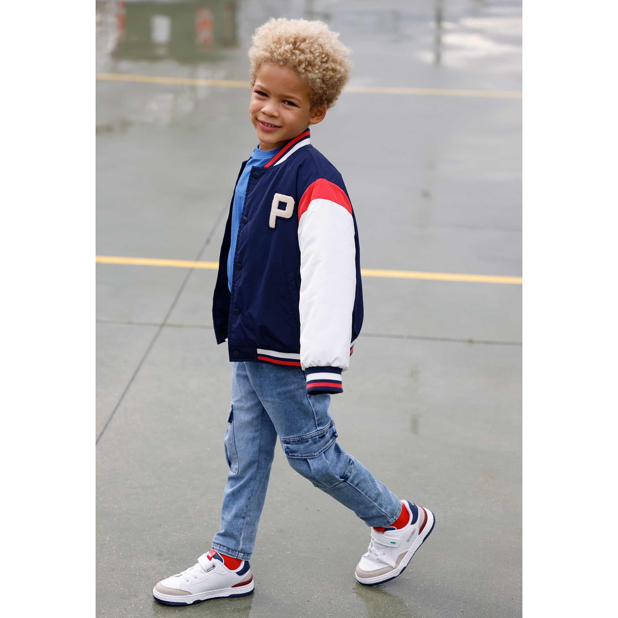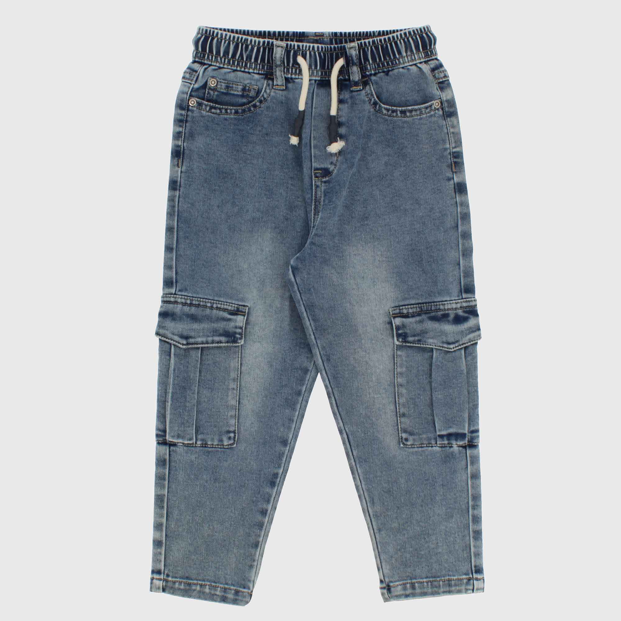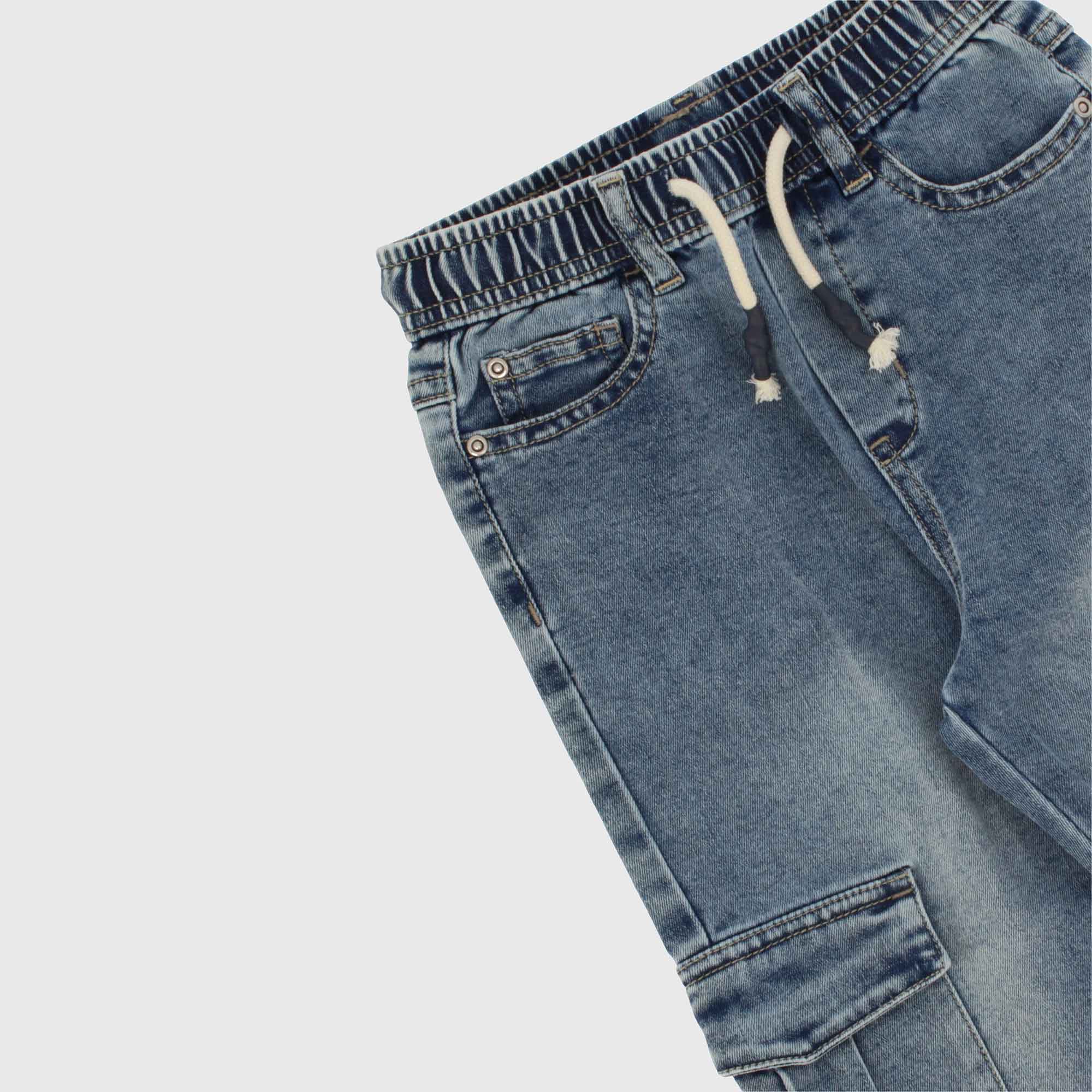 Pantalon en Jeans avec taille élastique et lacets devant. Poches devant et poches avec rabat sur le côté. Poches appliquées derrière avec petit imprimé.