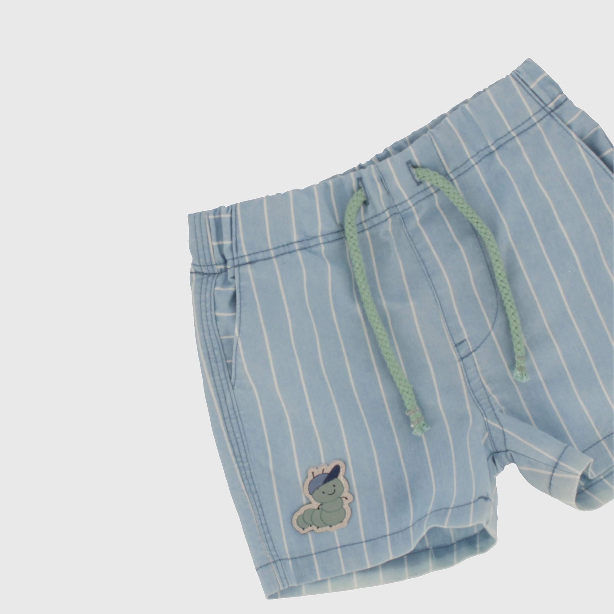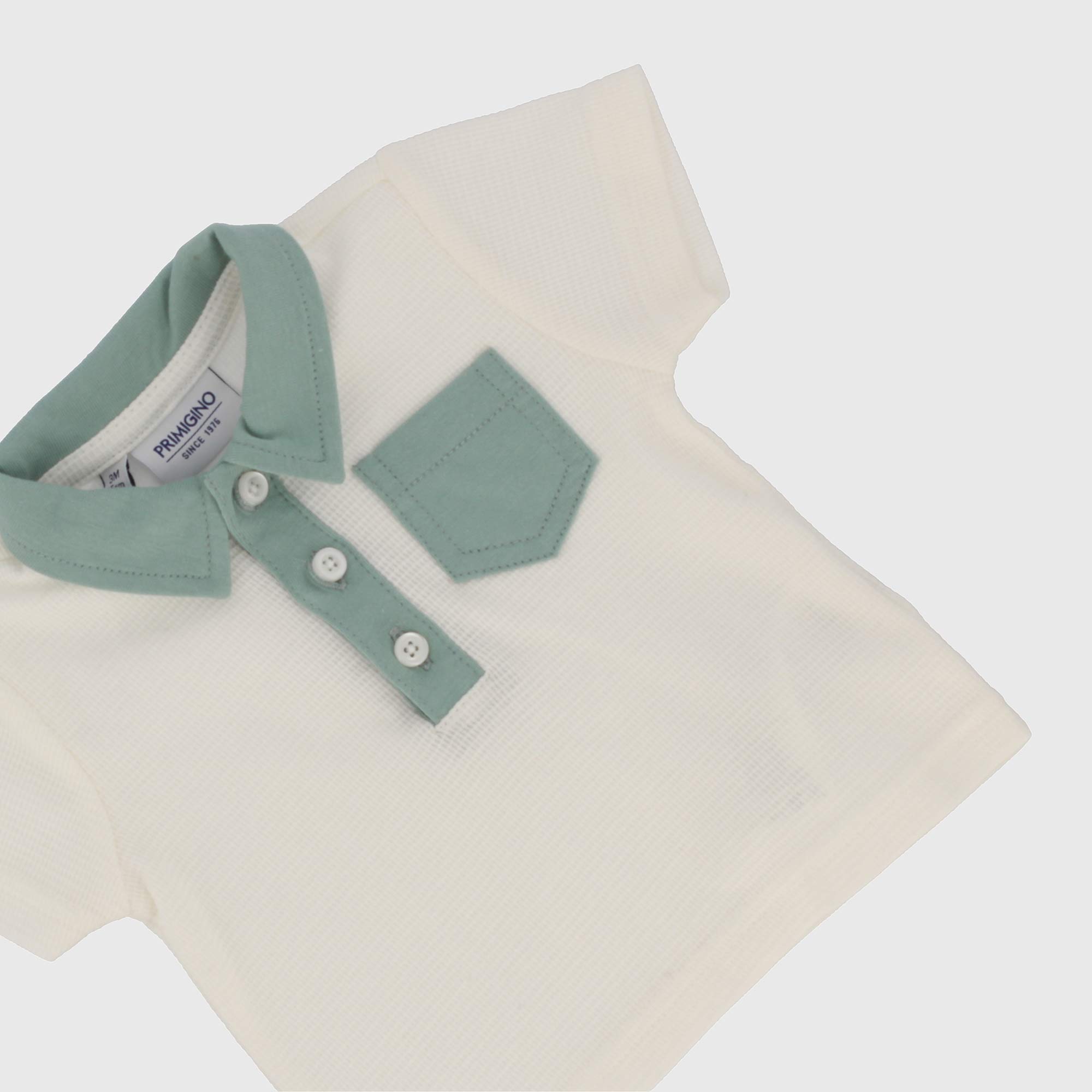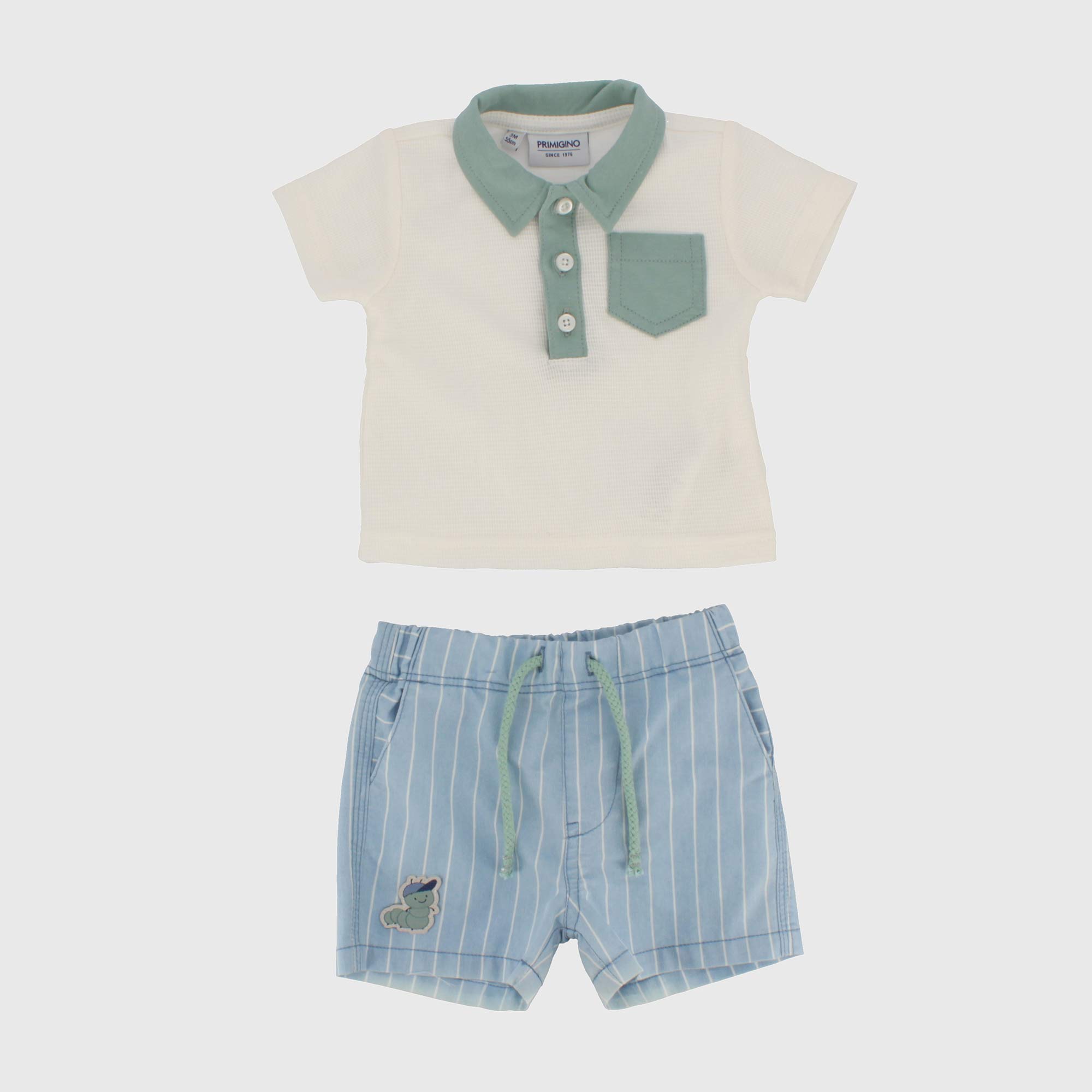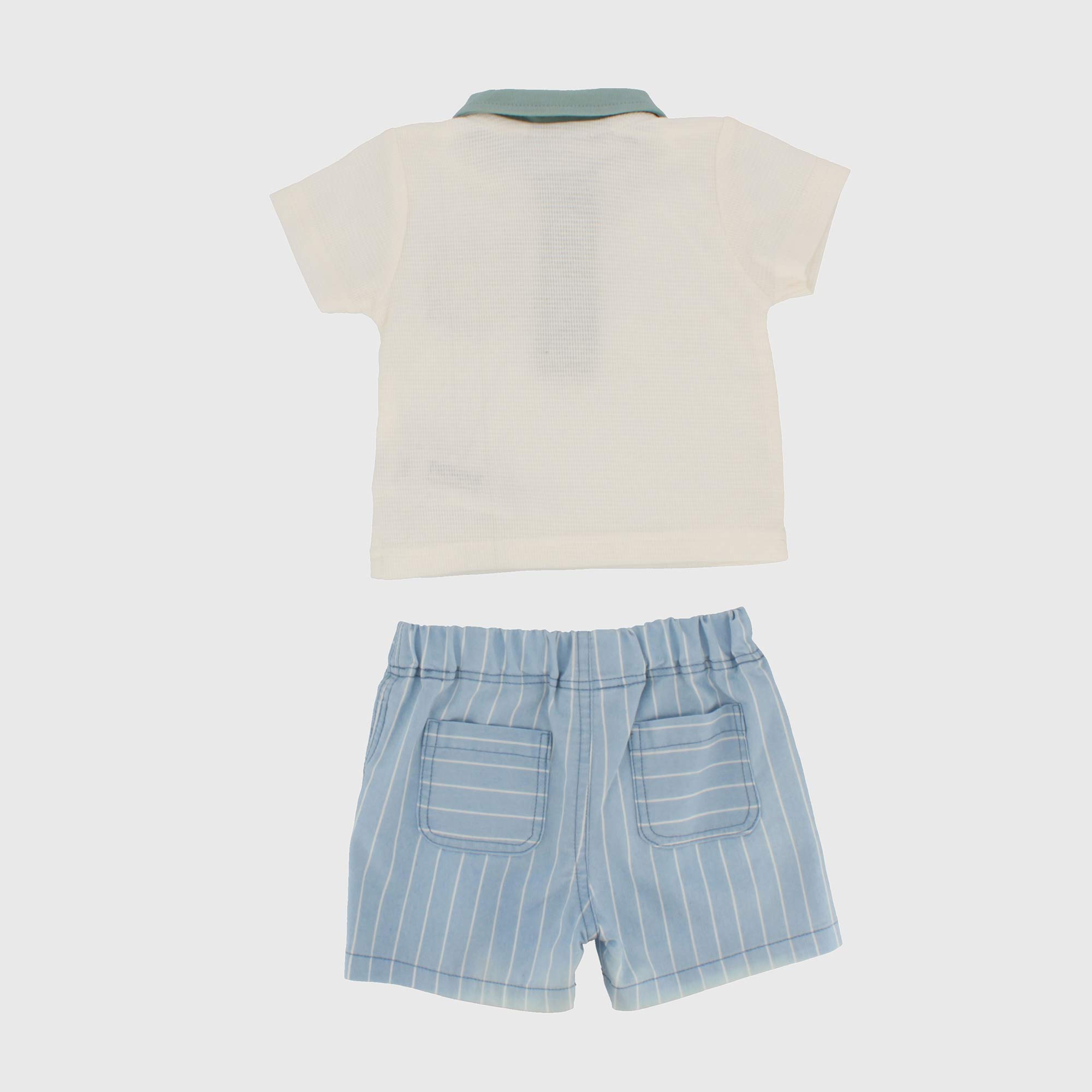 Complet deux pièces, Polo en jersey, avec façonnage à nid d'abeille, à manches courtes . Petite poche et col à contraste. Pantalon en chambray à rayure, taille élastique et lacets devant à contraste. Patch devant et poches appliquées derrière.