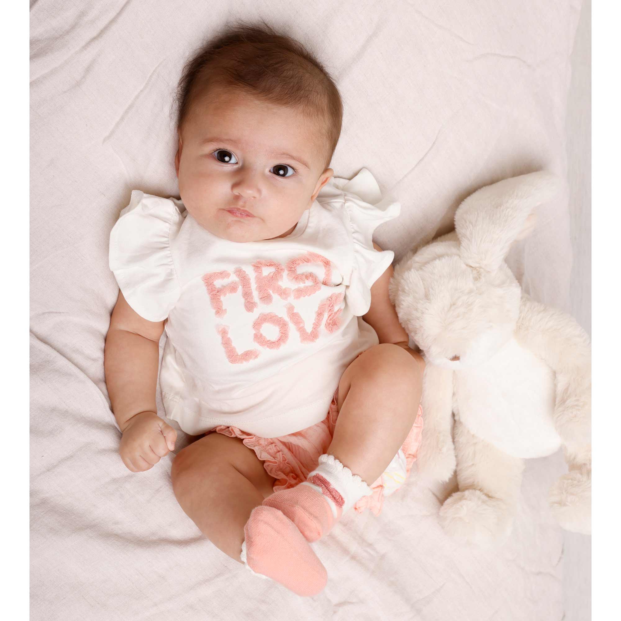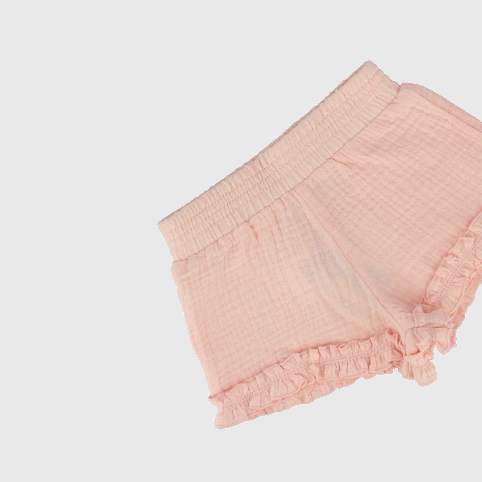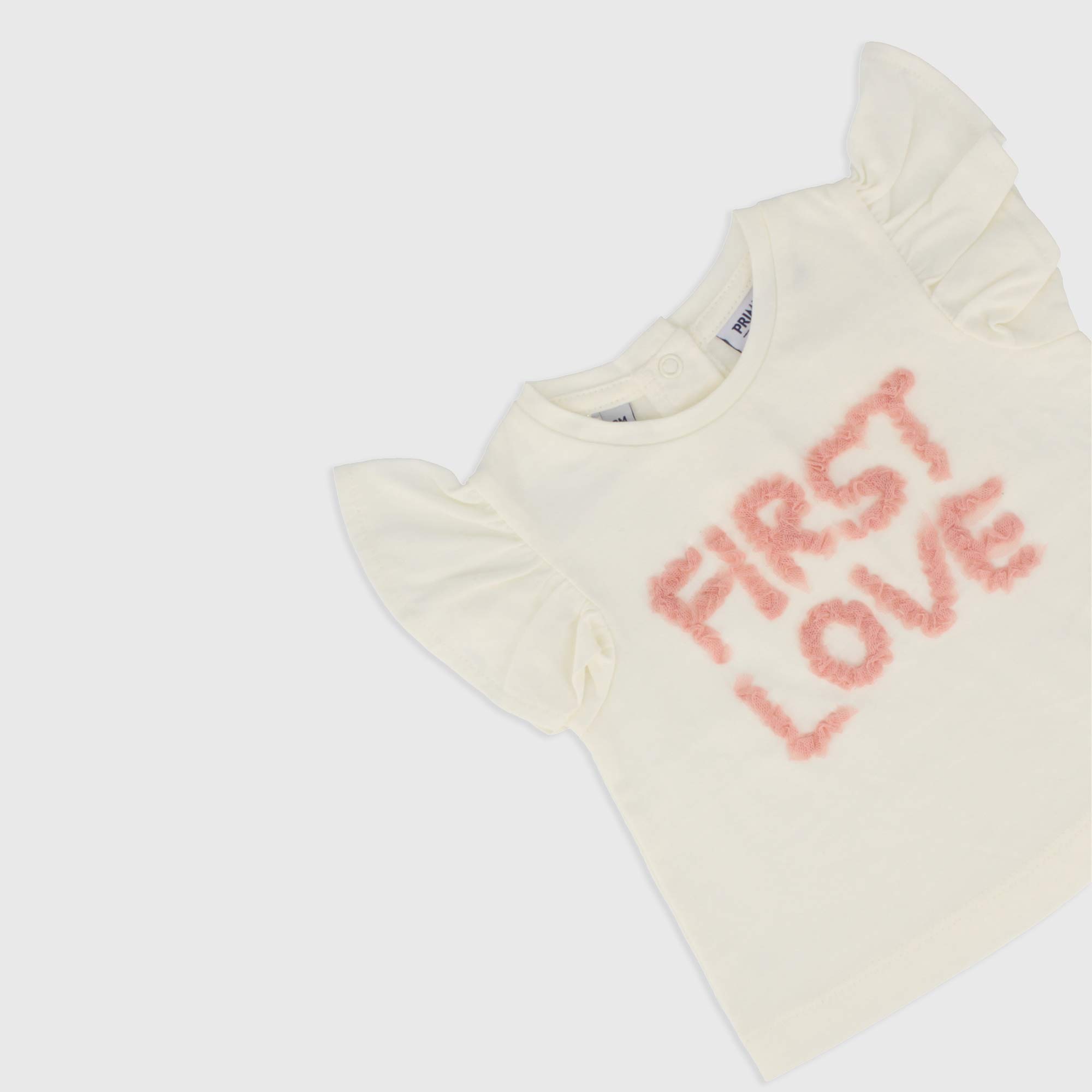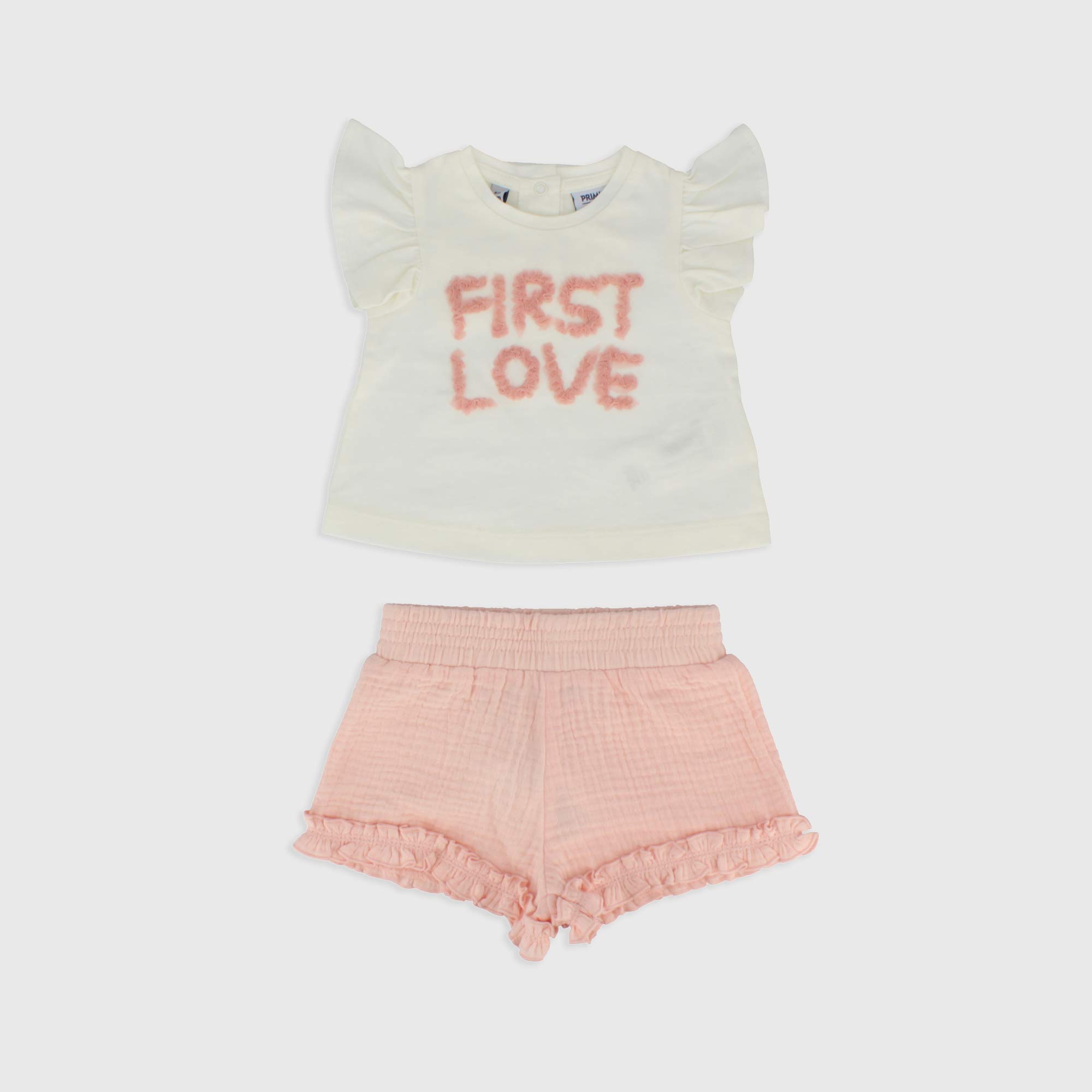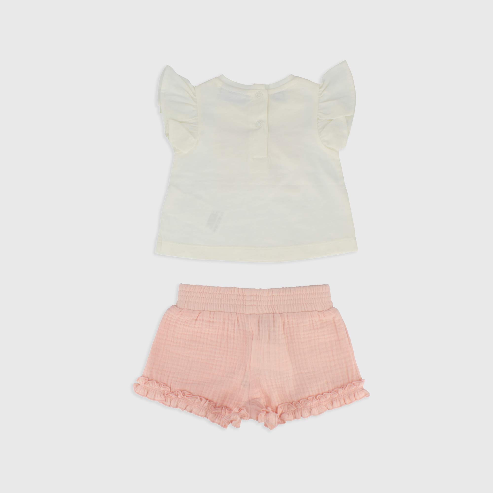 Complet deux pièces, T-shirt en jersey col-rond, manches courtes avec volants. Fermeture derrière avec boutons automatiques. Lettrage en tulle devant. Shorts en gaze de coton avec taille élastique.