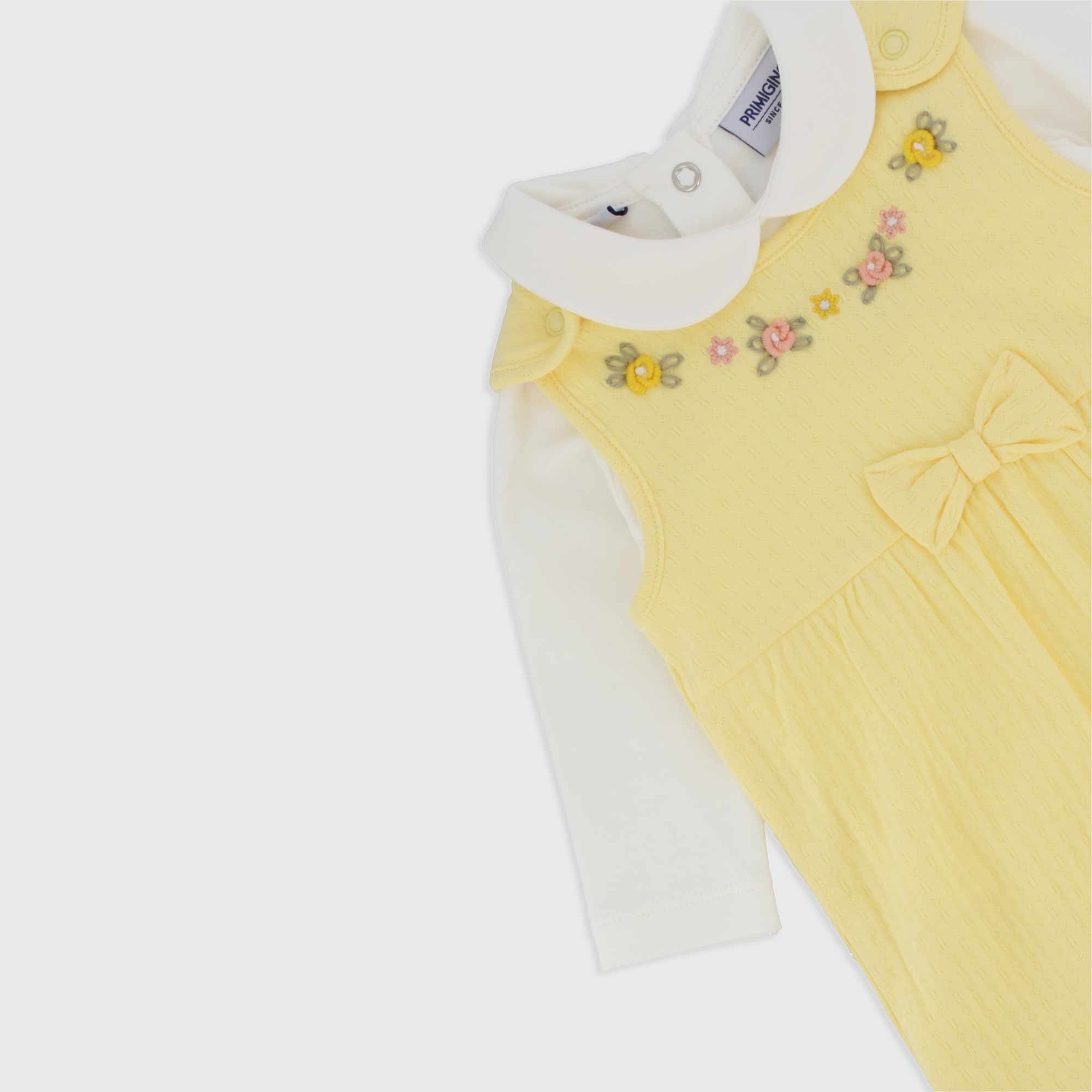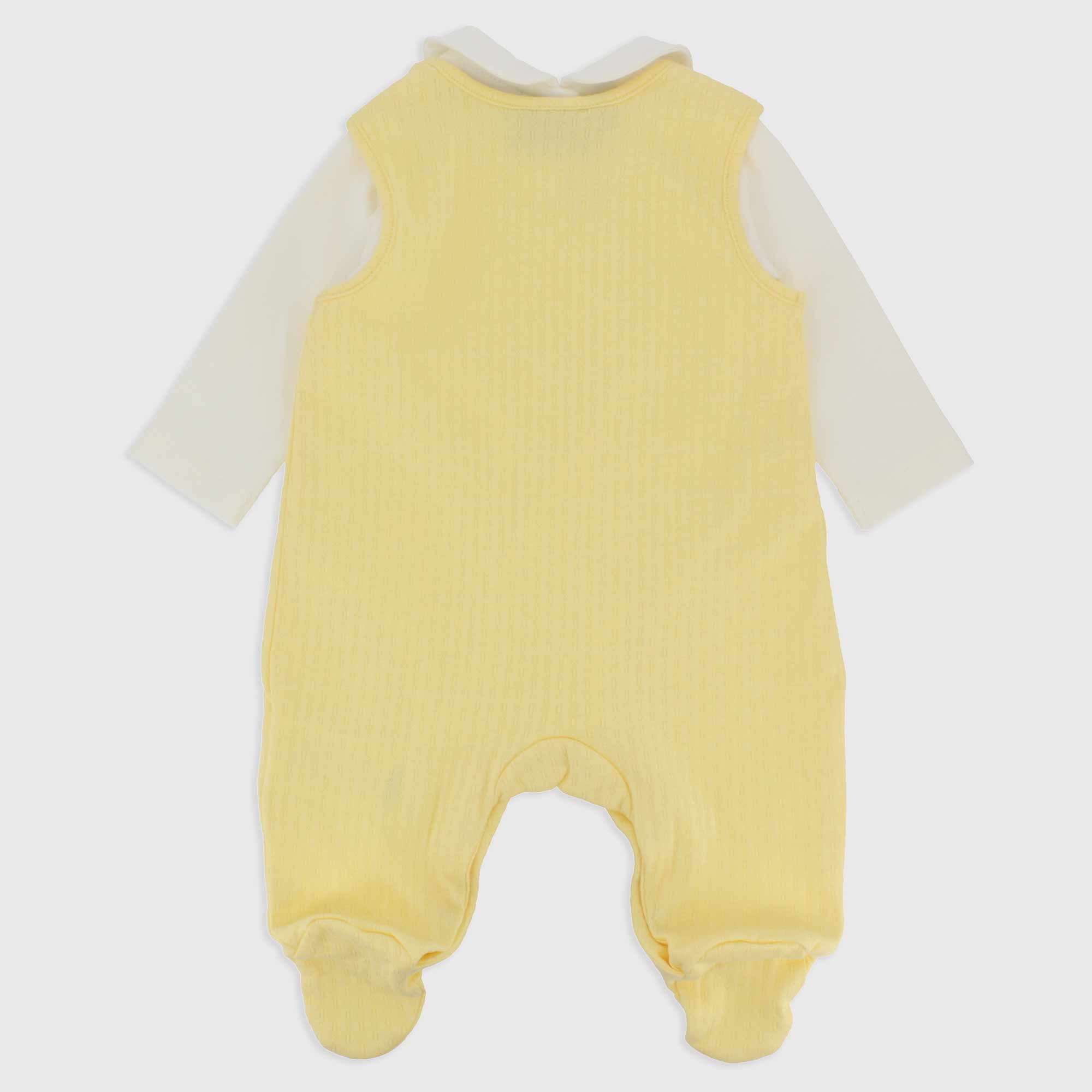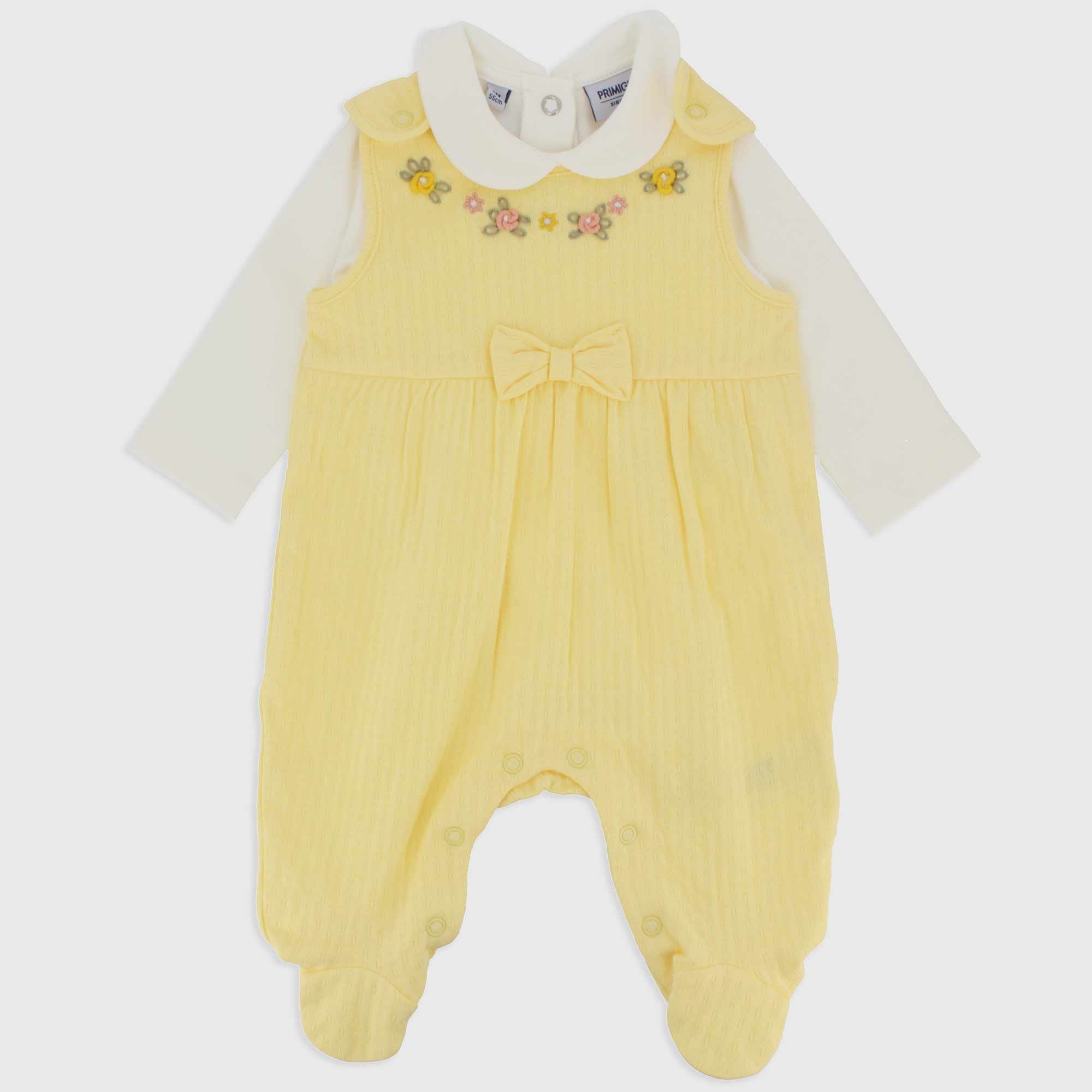 Complet deux pièces, Body en jersey avec col, à manches longues. Fermeture derrière avec boutons automatiques. Salopette avec boutons automatiques sur l'entrejambe et pieds . Broderie devant et noeud appliqué.