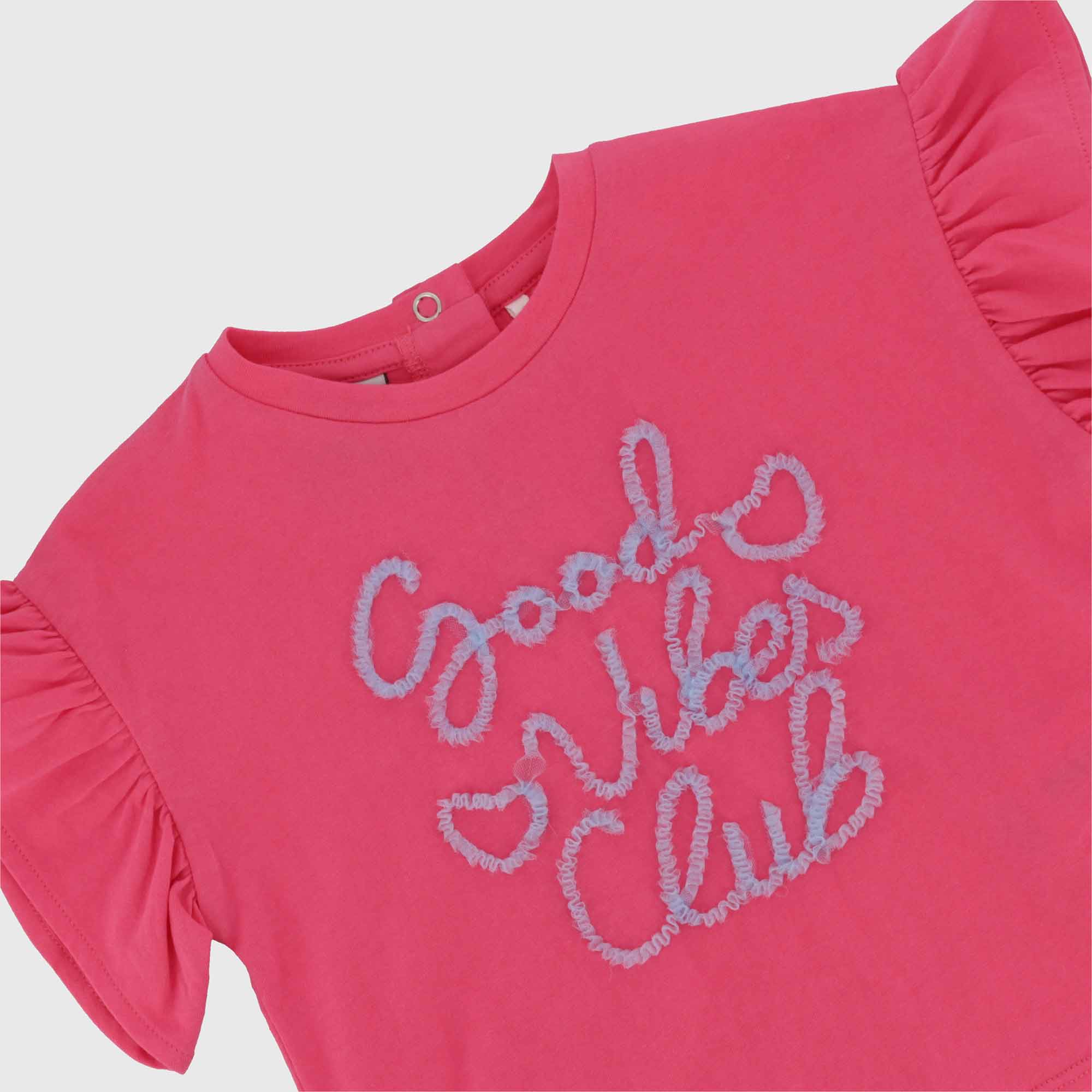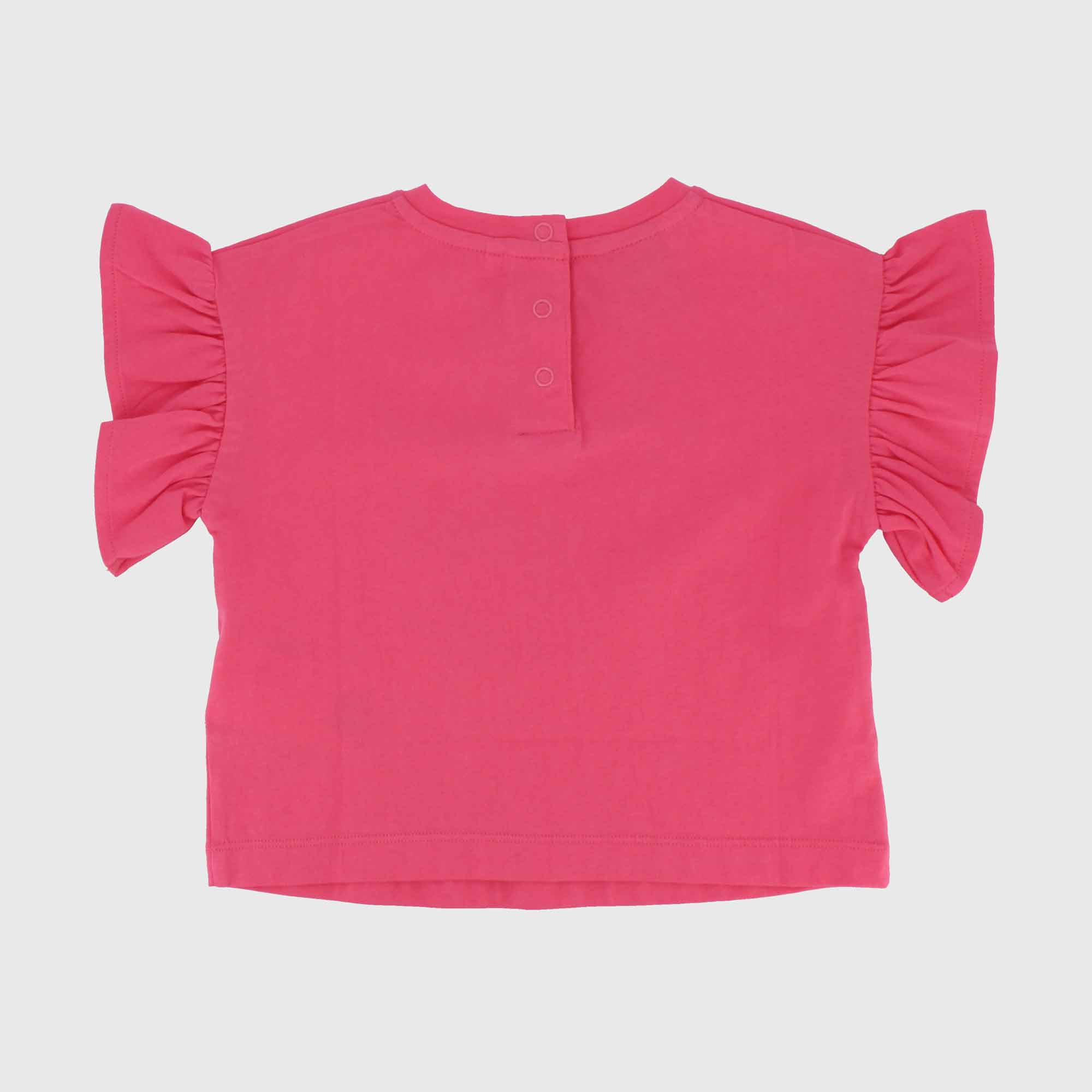 T-shirt en jersey, col-rond, manches courtes avec volants. Fermeture avec boutons automatiques sur l'épaule. Broderie avec lettrage devant.