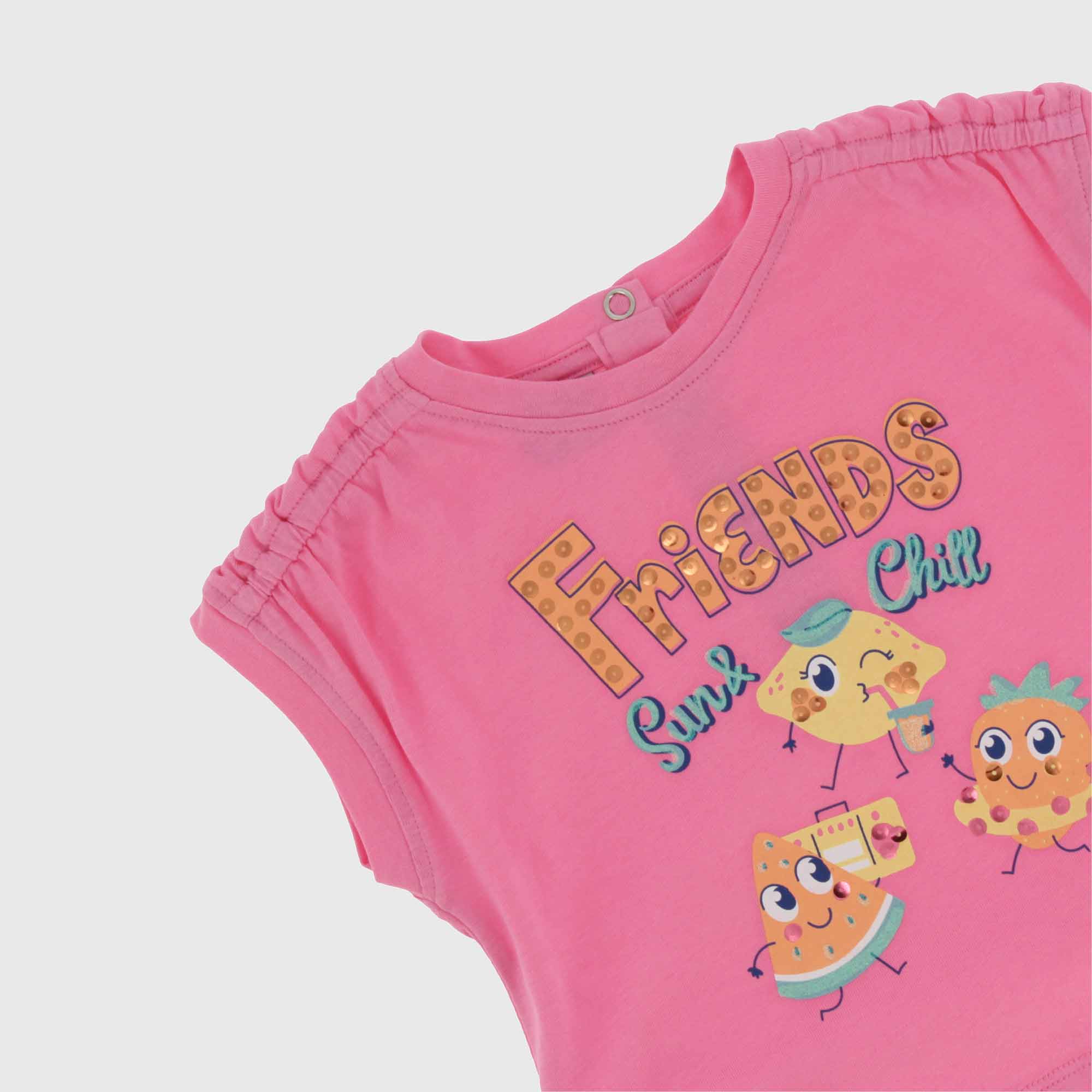 T-shirt en jersey, col-rond, à manches courtes . Fermeture derrière avec boutons automatiques. Imprimé avec paillettes et détails glitter devant.