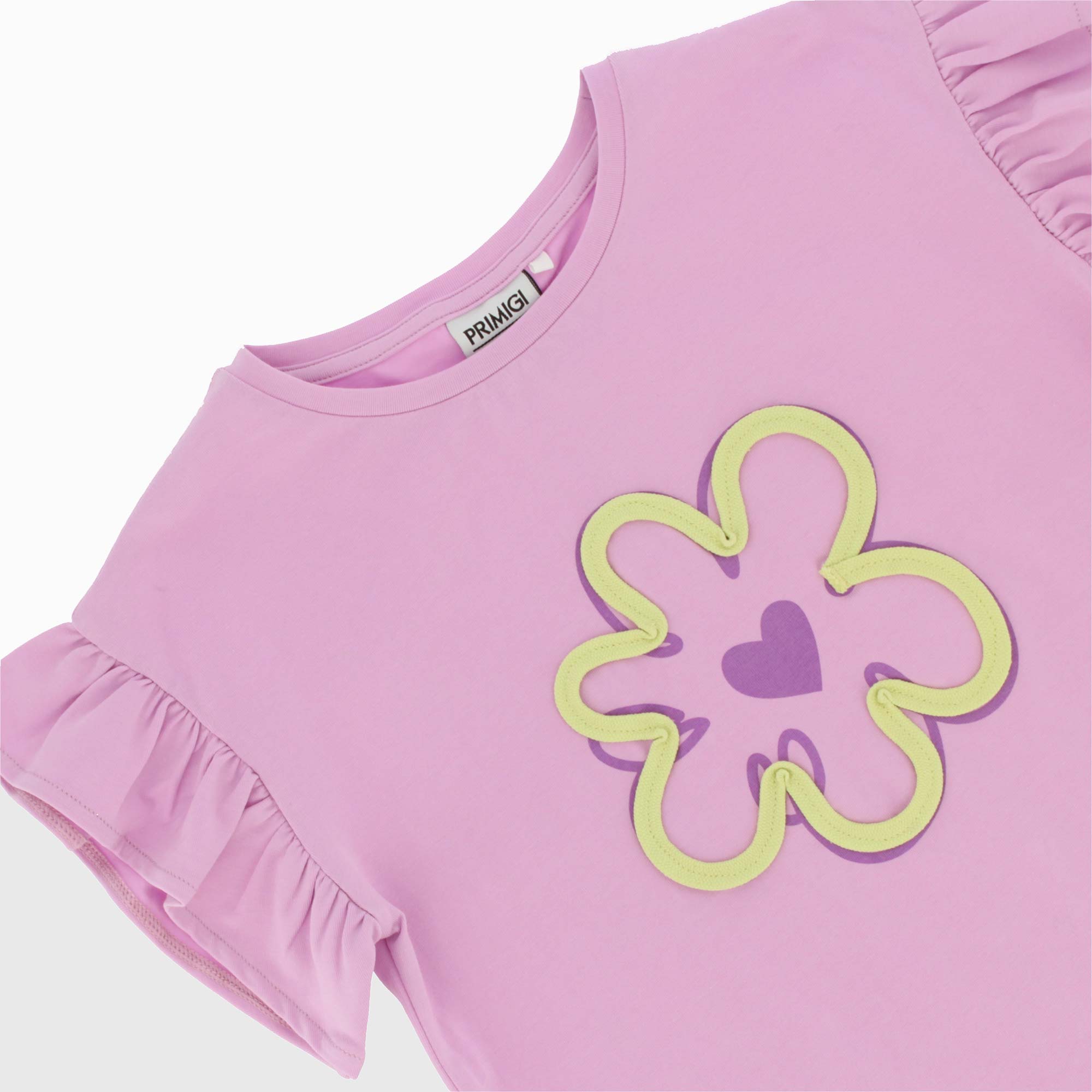 T-shirt en jersey, col-rond, manches courtes avec volants. Imprimé avec application à forme de fleur devant.