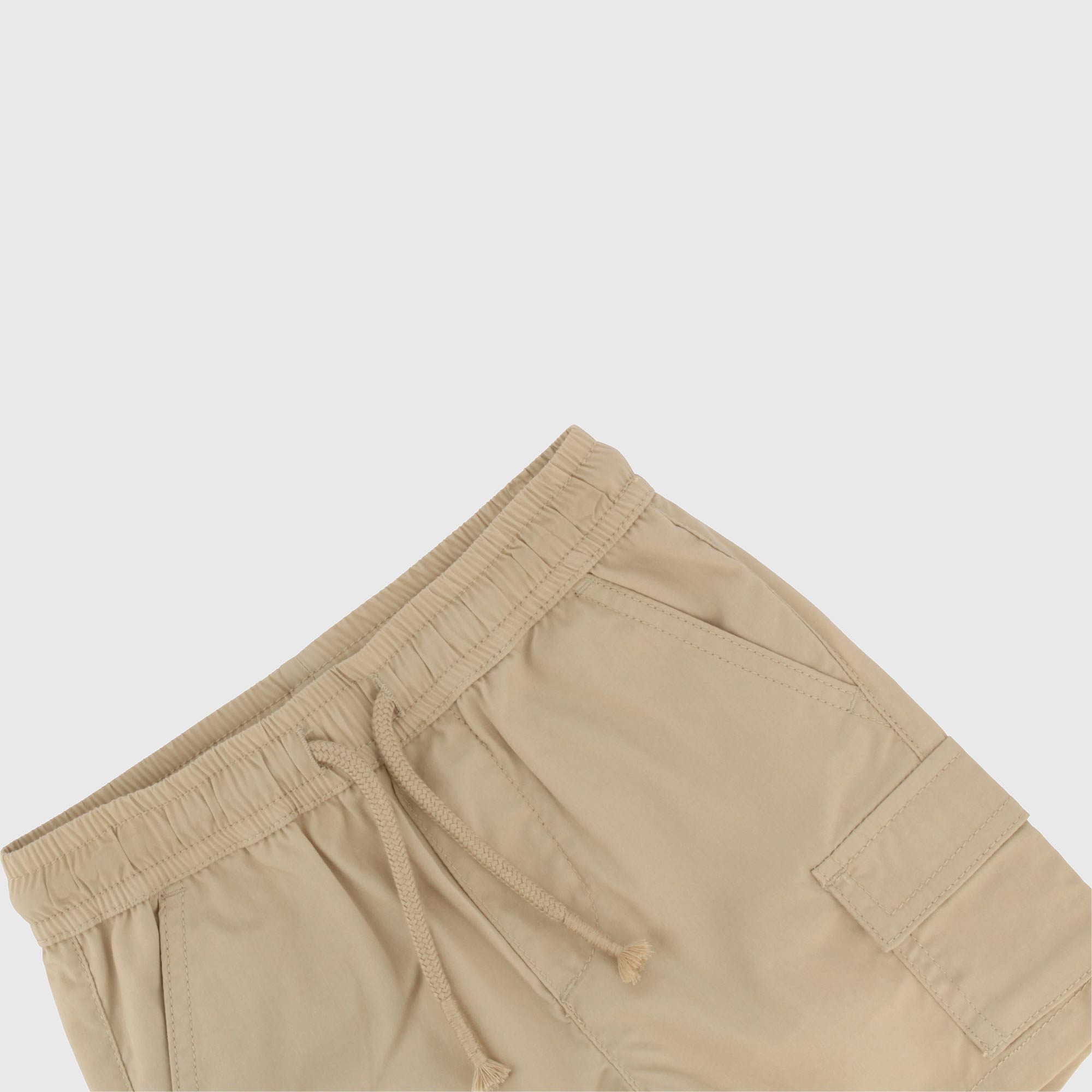 Bermuda en popeline avec taille élastique et lacets devant. Poches françaises devant, poche latérale et poches lisière derrière.