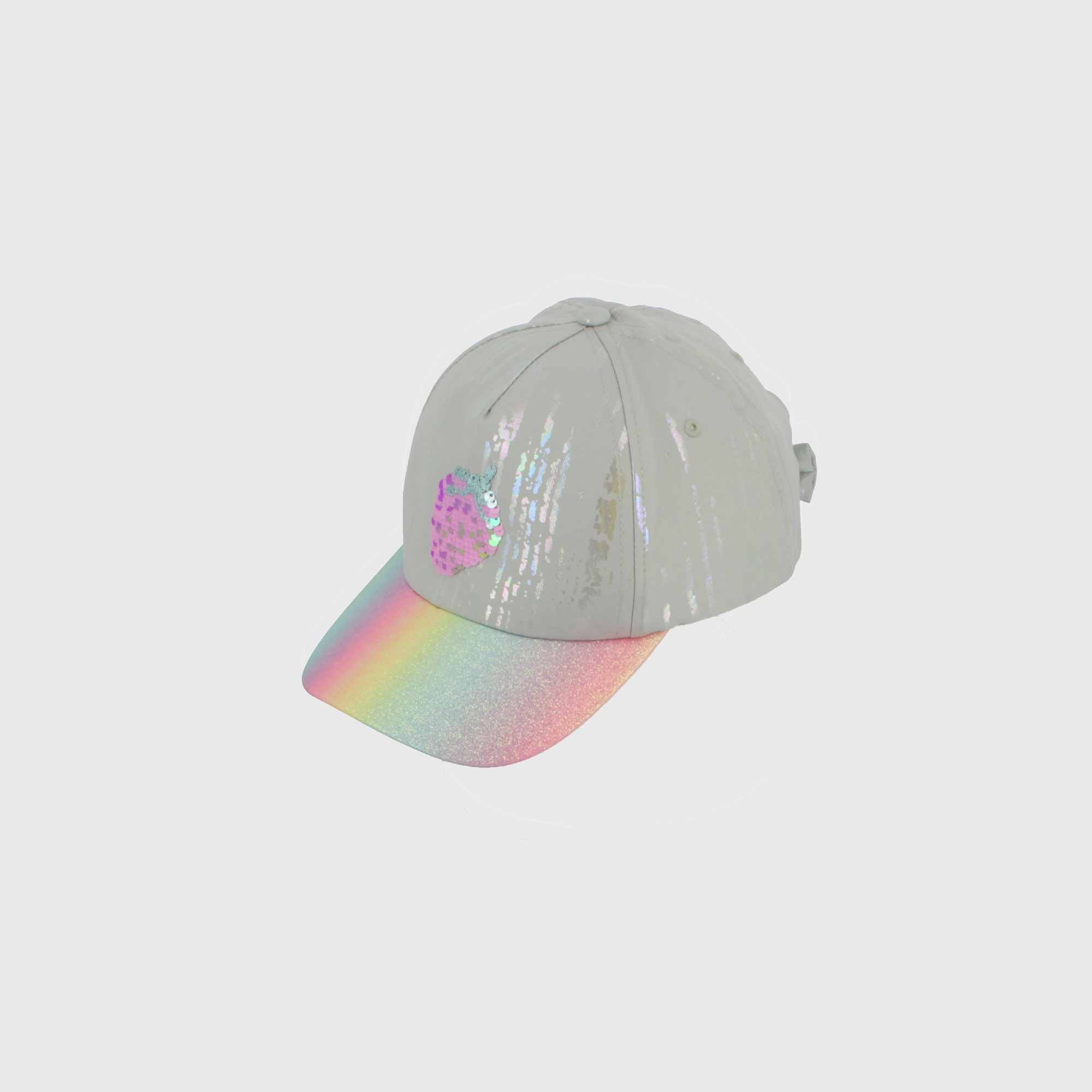Béret baseball avec fraise en paillettes et visière glitter. Ruban en velcro réglable derrière.