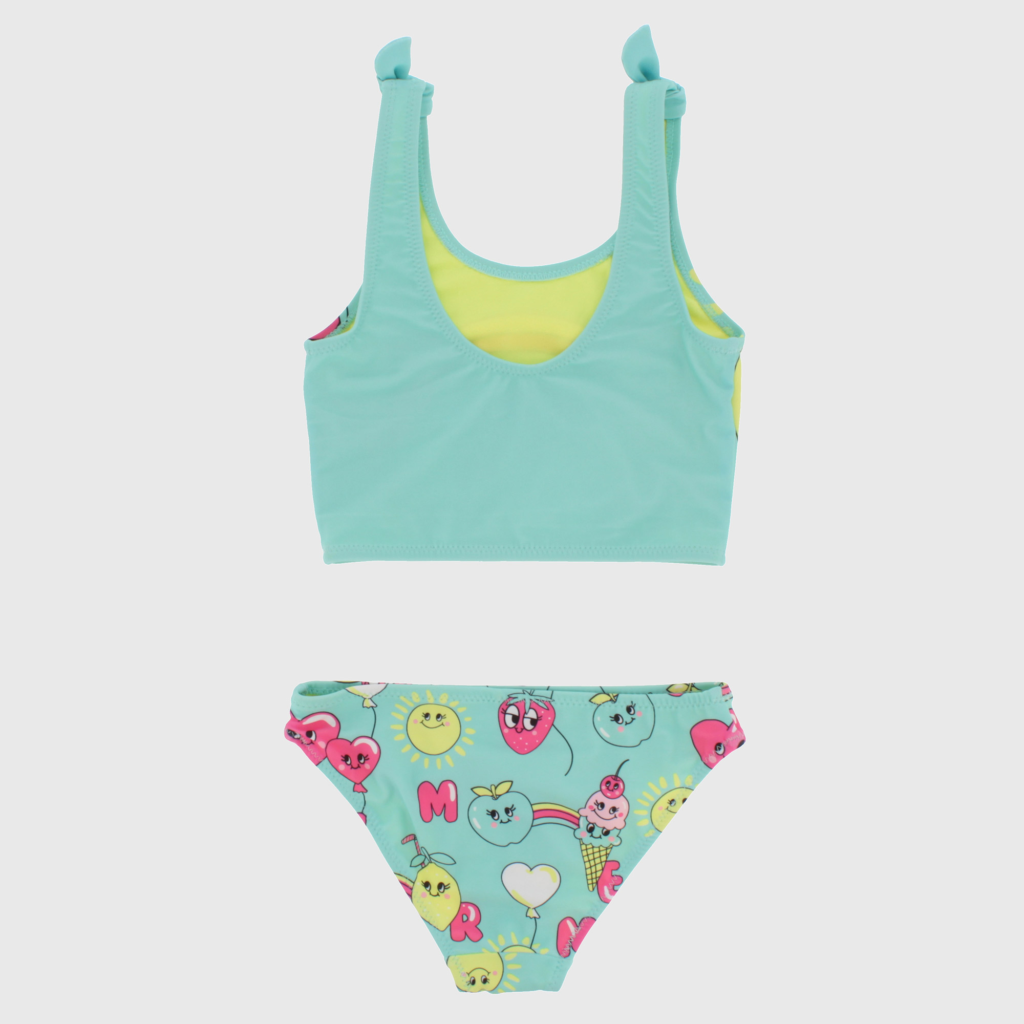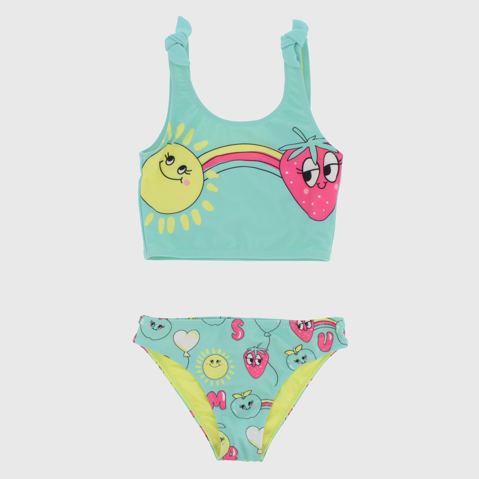 Bikini imprimé avec top et slip combiné. Top avec épaulettes et noeuds. Slip avec taille élastique.