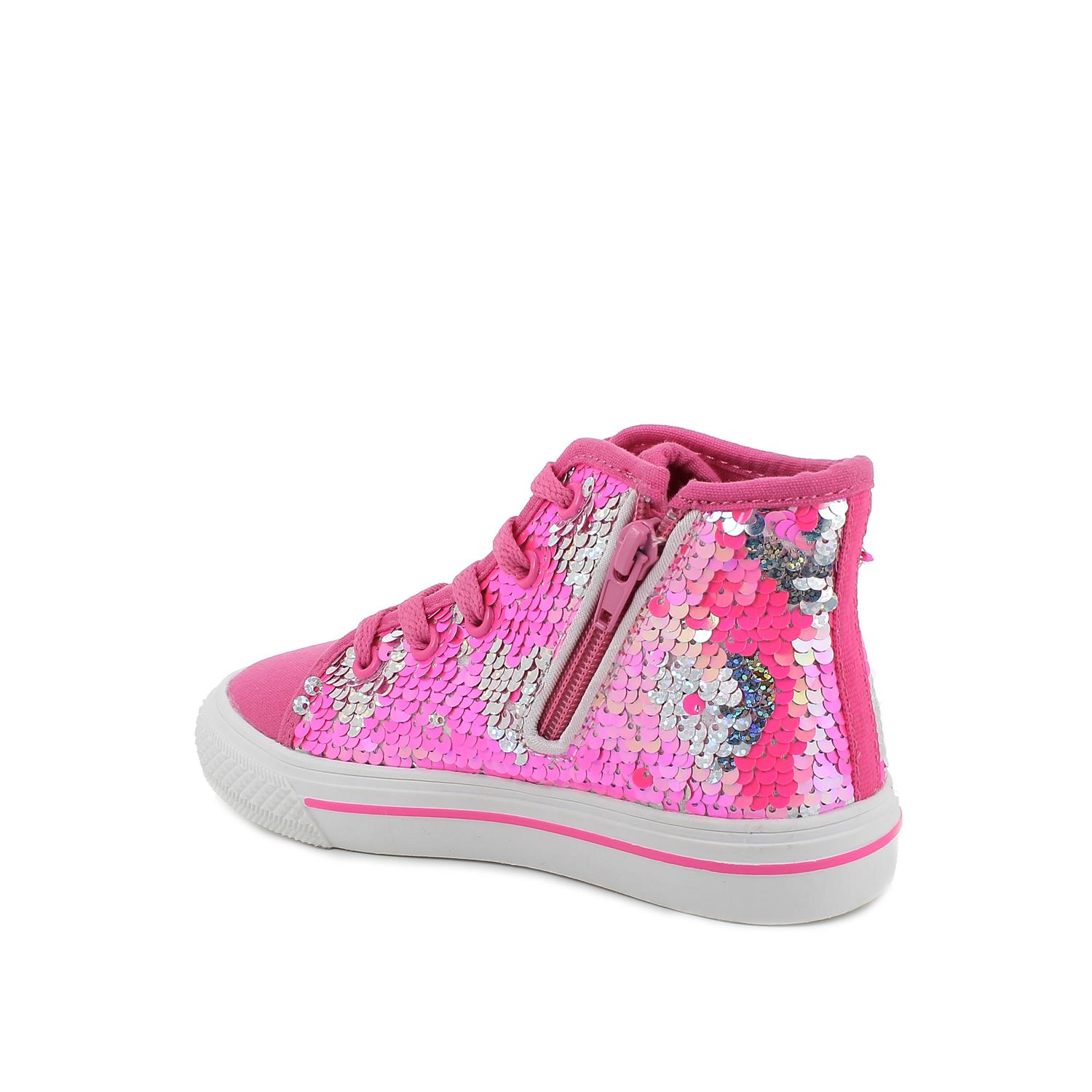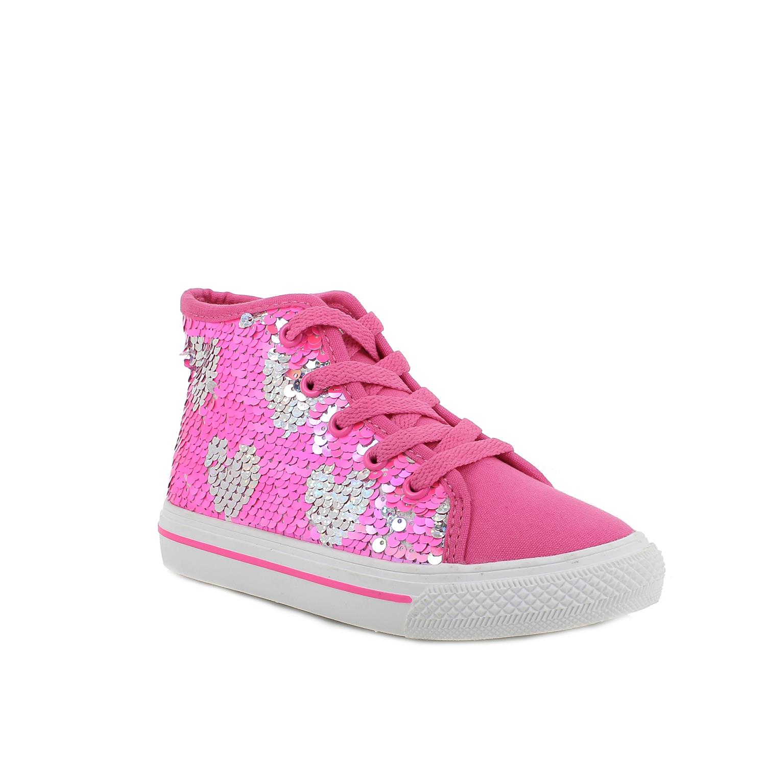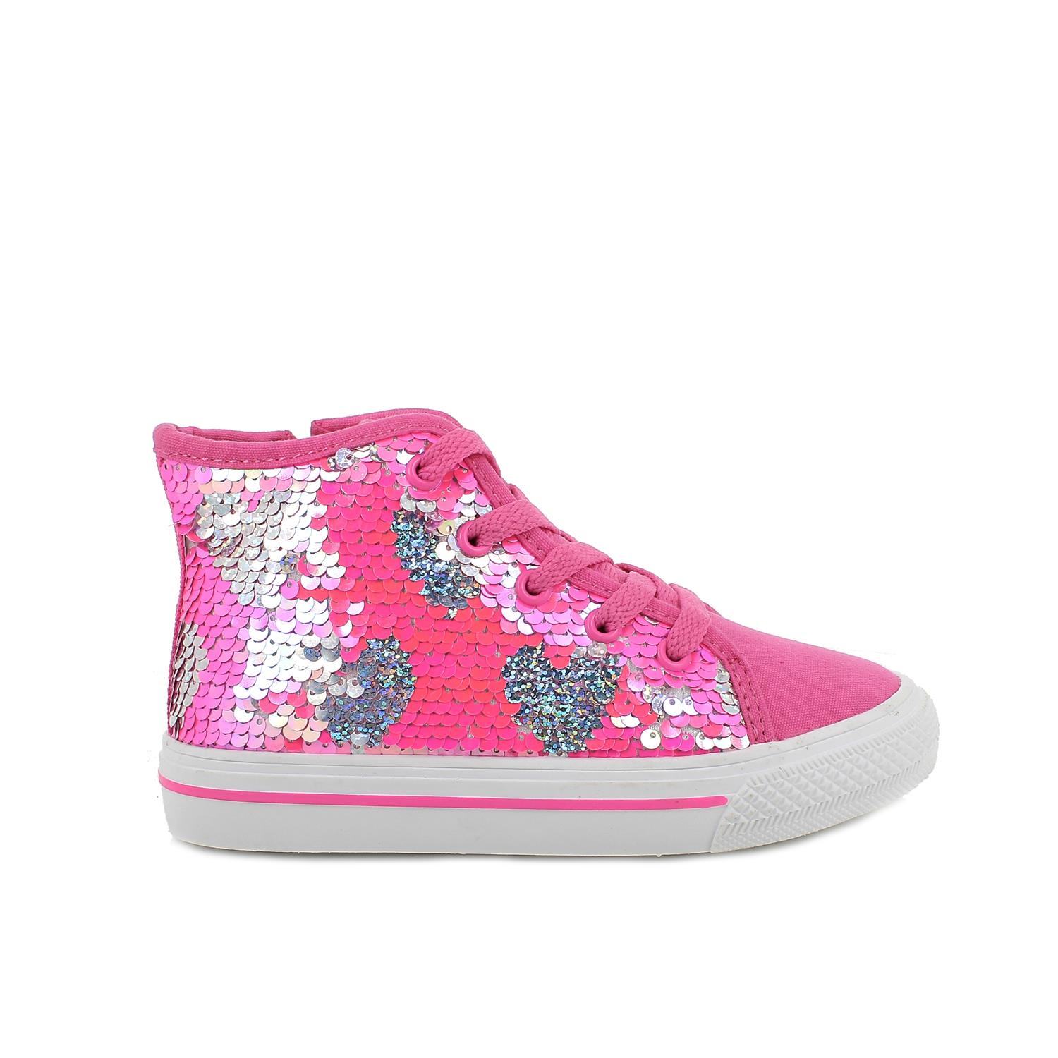Baskets hautes pour fille en tissu avec paillettes et motif cœur. Parfaites pour les petites filles qui aiment se faire remarquer. Le zip interne empêche les lacets de se défaire lors du port. La semelle est plate avec une pointe arrondie. La semelle intérieure est amovible et recouverte de cuir pour garantir transpirabilité et hygiène.