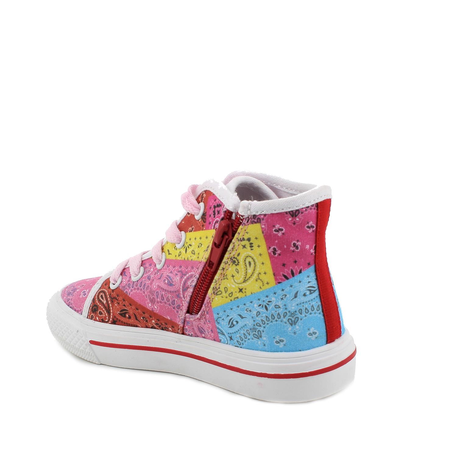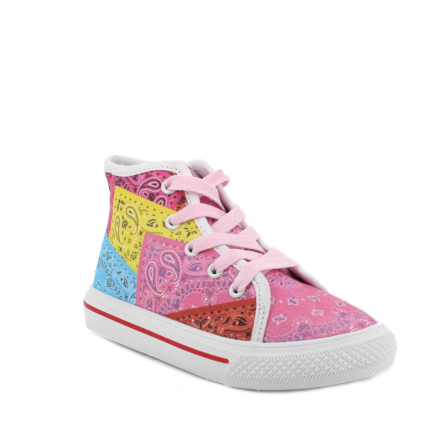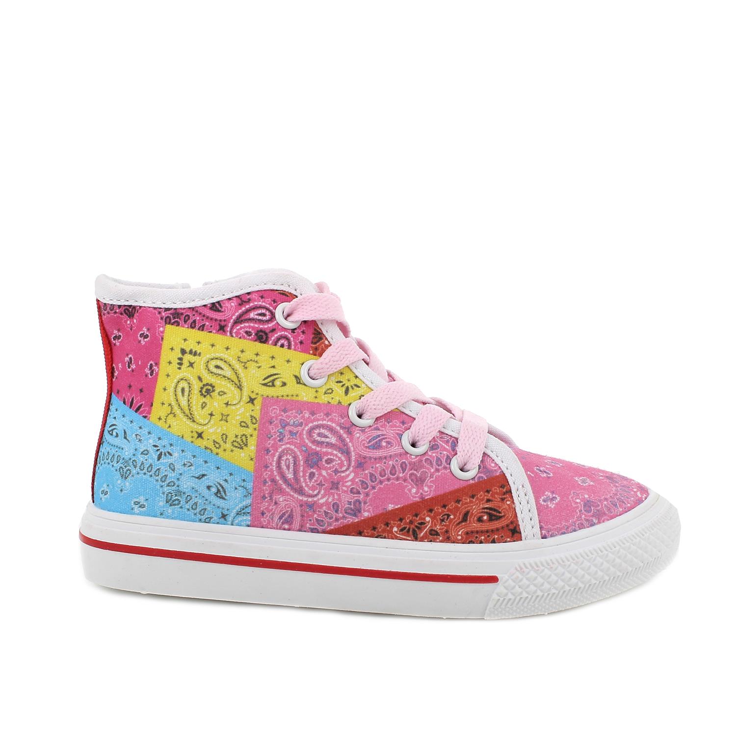 Baskets hautes pour fille en tissu coloré, effet patchwork. Parfaites pour les petites filles qui aiment se faire remarquer. Le zip interne empêche les lacets de se défaire lors du port. La semelle est plate avec une pointe arrondie. La semelle intérieure est amovible et recouverte de cuir pour garantir transpirabilité et hygiène.
