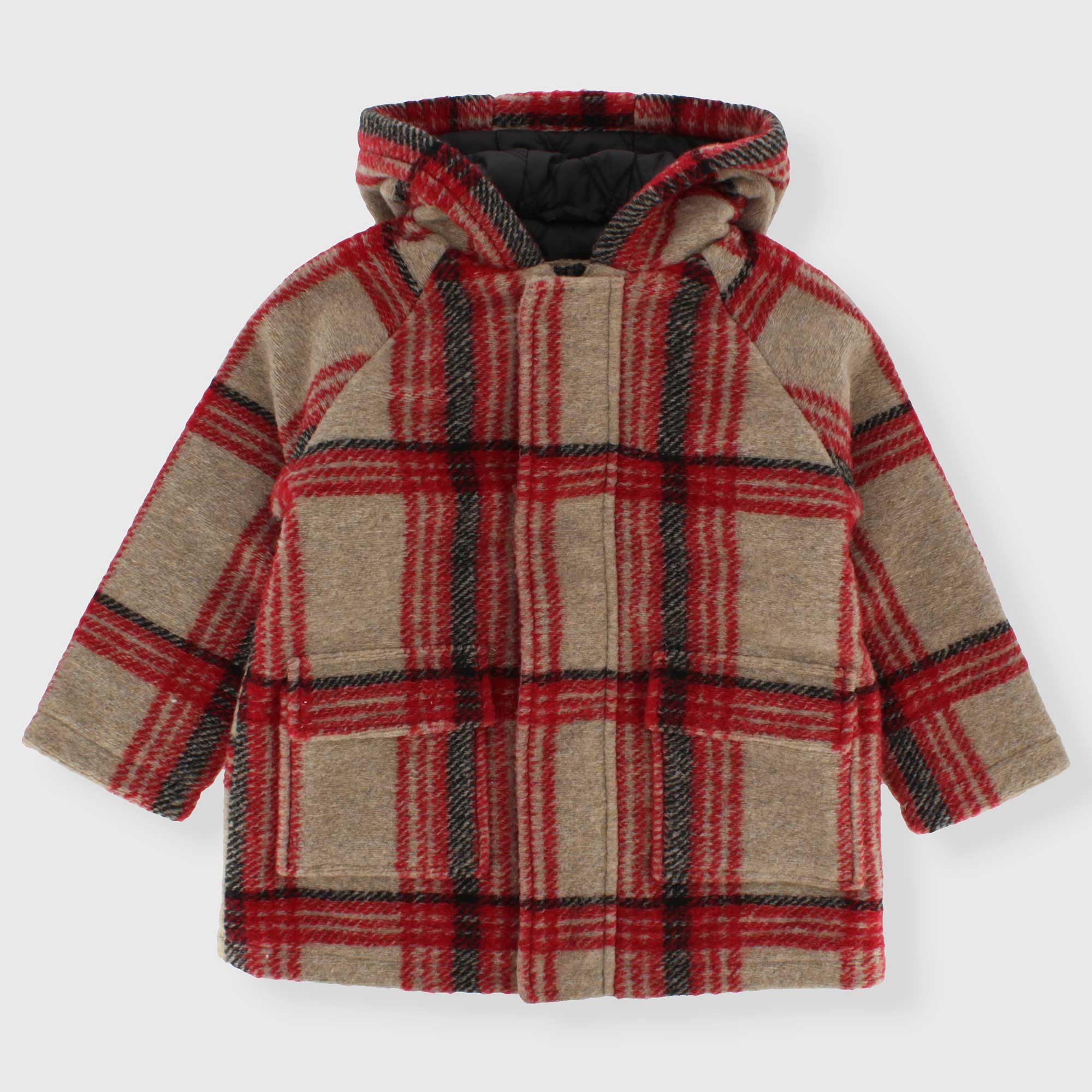 Manteau en tissu Madras à capuche, manches longues. Fermeture avant avec zip et boutons. Poches plaquées à rabat sur le devant.