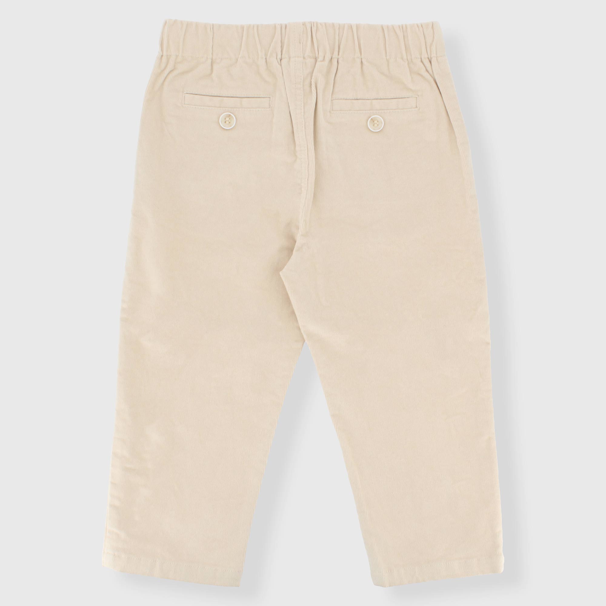 Pantalon en velours côtelé, avec taille élastiquée et lacets sur le devant. Poches françaises sur le devant et poches lisière à l'arrière.