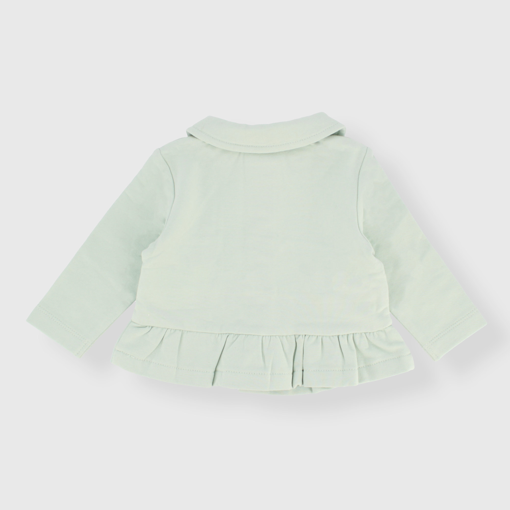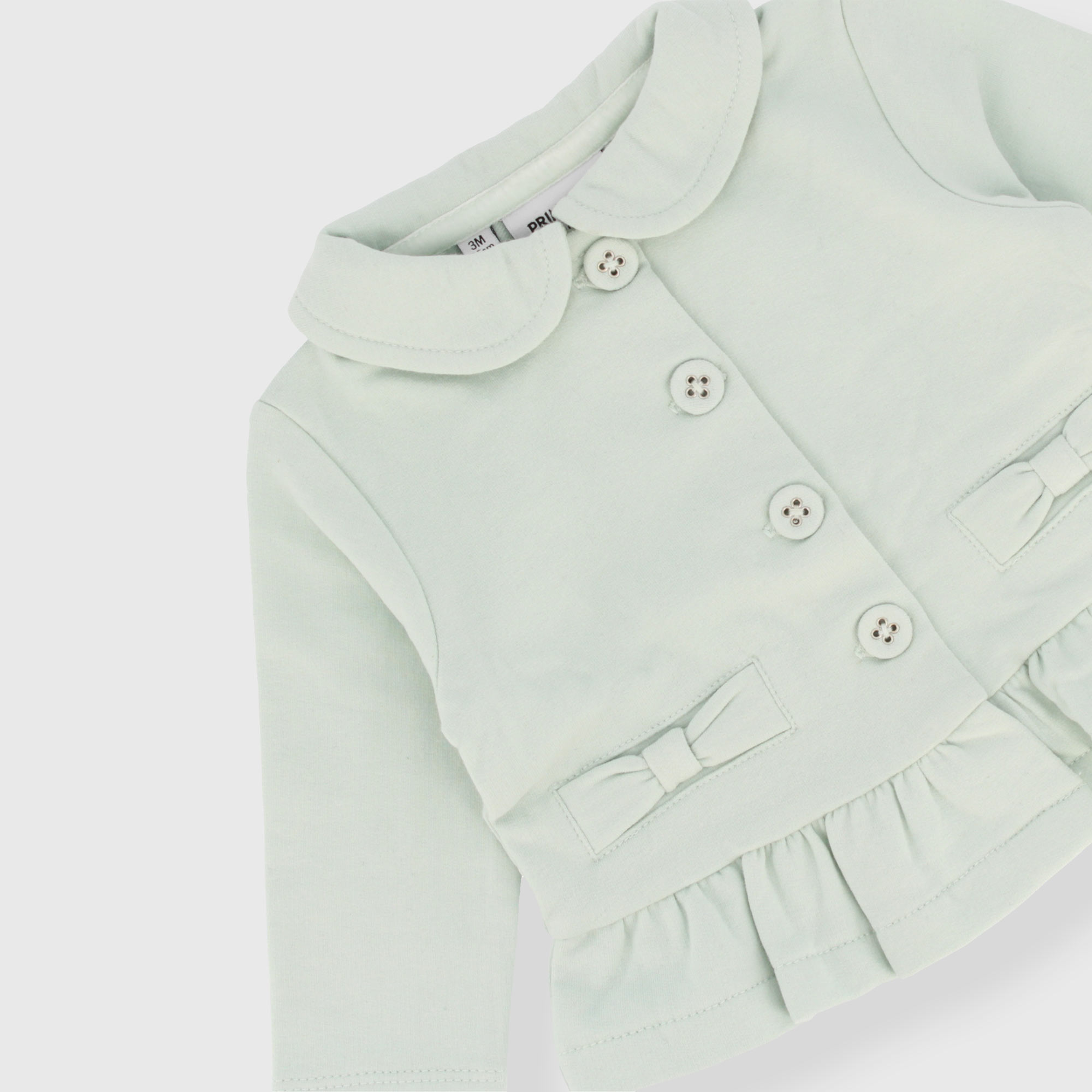 Veste en molleton avec intérieur doux brossé, col, manches longues. Boutonnage devant. Fausses poches sur le devant avec nœuds appliqués. Volant en bas.