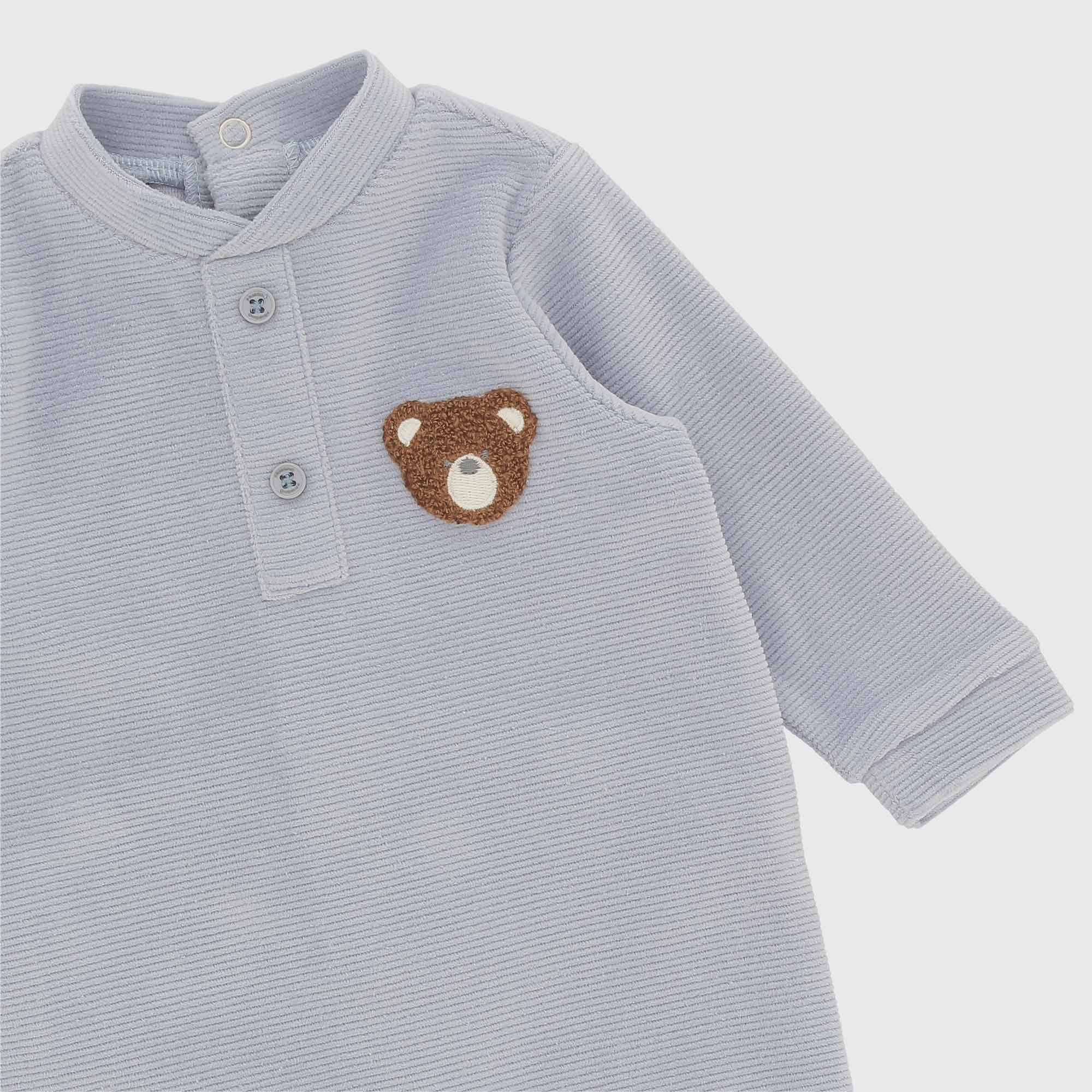 Combinaison en chenille à col mao, manches longues. Fermeture avec boutons automatiques au dos. Broderie ourson en point éponge sur le devant.
