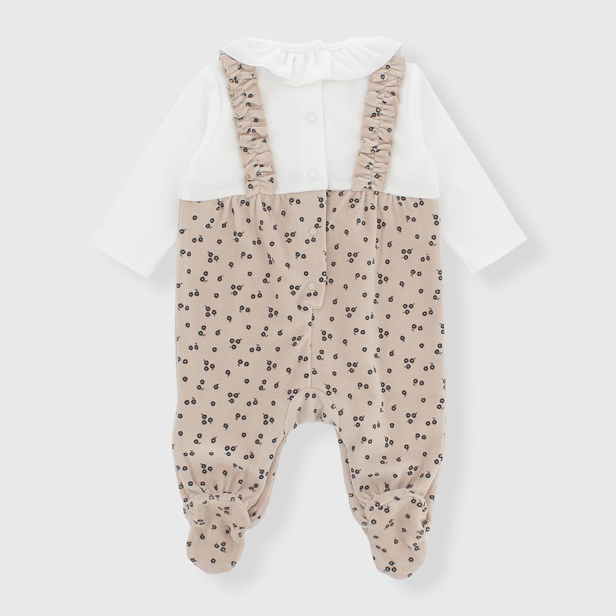 Combinaison col rond en chenille avec volants, manches longues. Fermeture par boutons pression au dos et à l'entrejambe. Fausse salopette avec imprimé floral all-over.