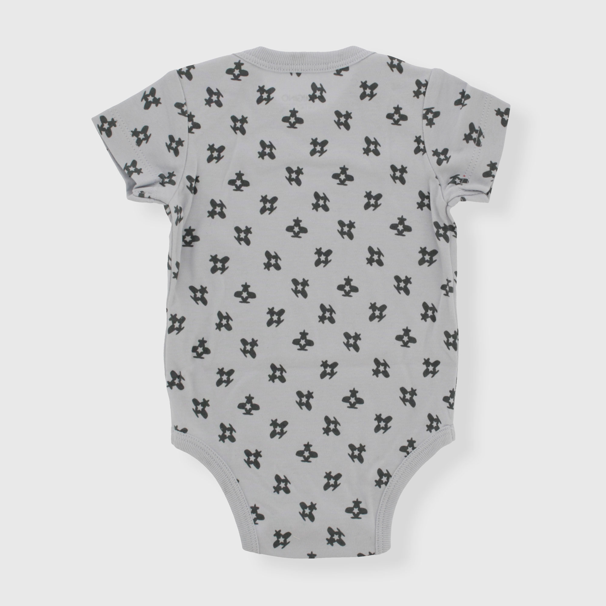 Body chaud en coton, col rond, manches courtes. Fermeture par bouton pression sur le bas. Imprimé all-over avec des avions.