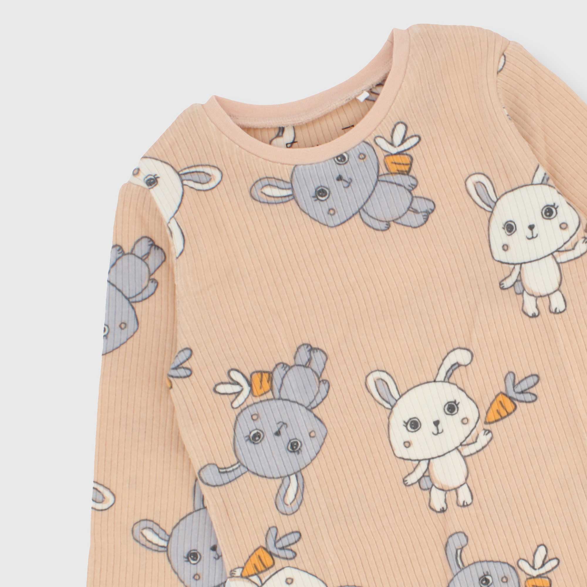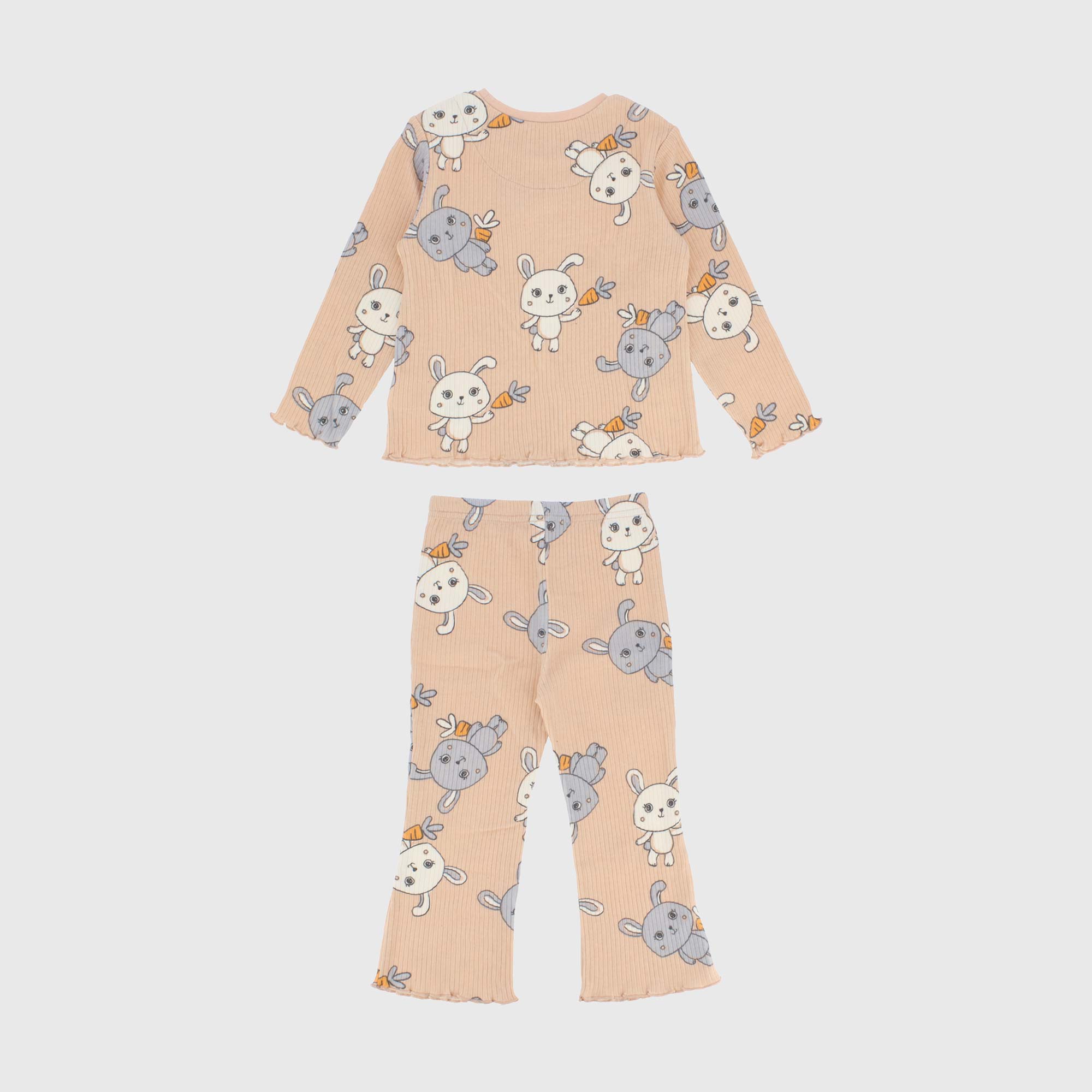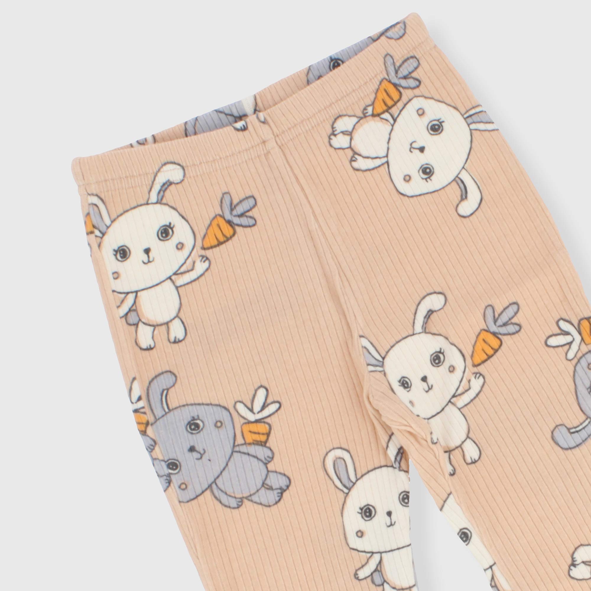 Ensemble pyjama côtelé avec imprimé lapin all-over. Pull col rond à manches longues. Legging forme cloche avec taille élastiquée.