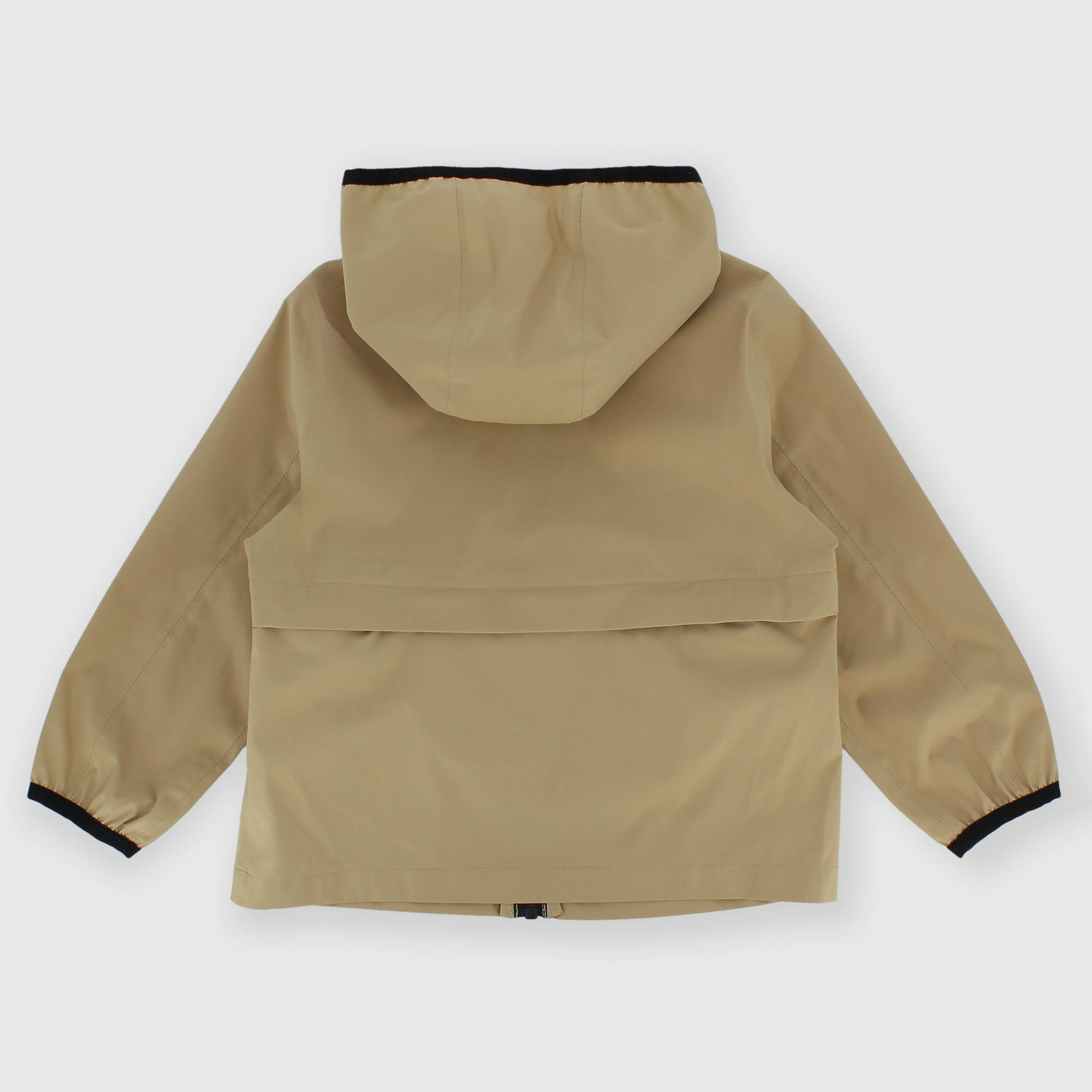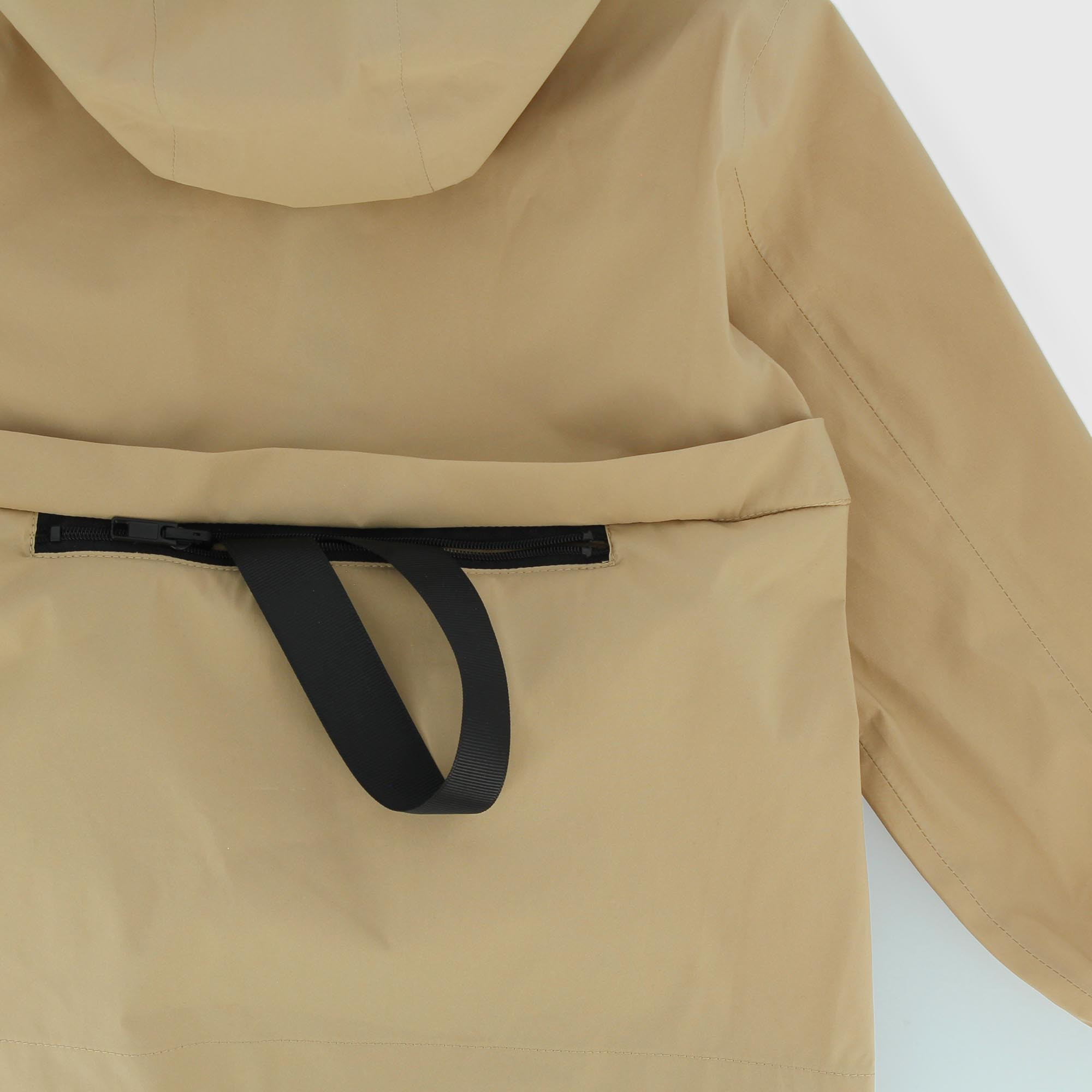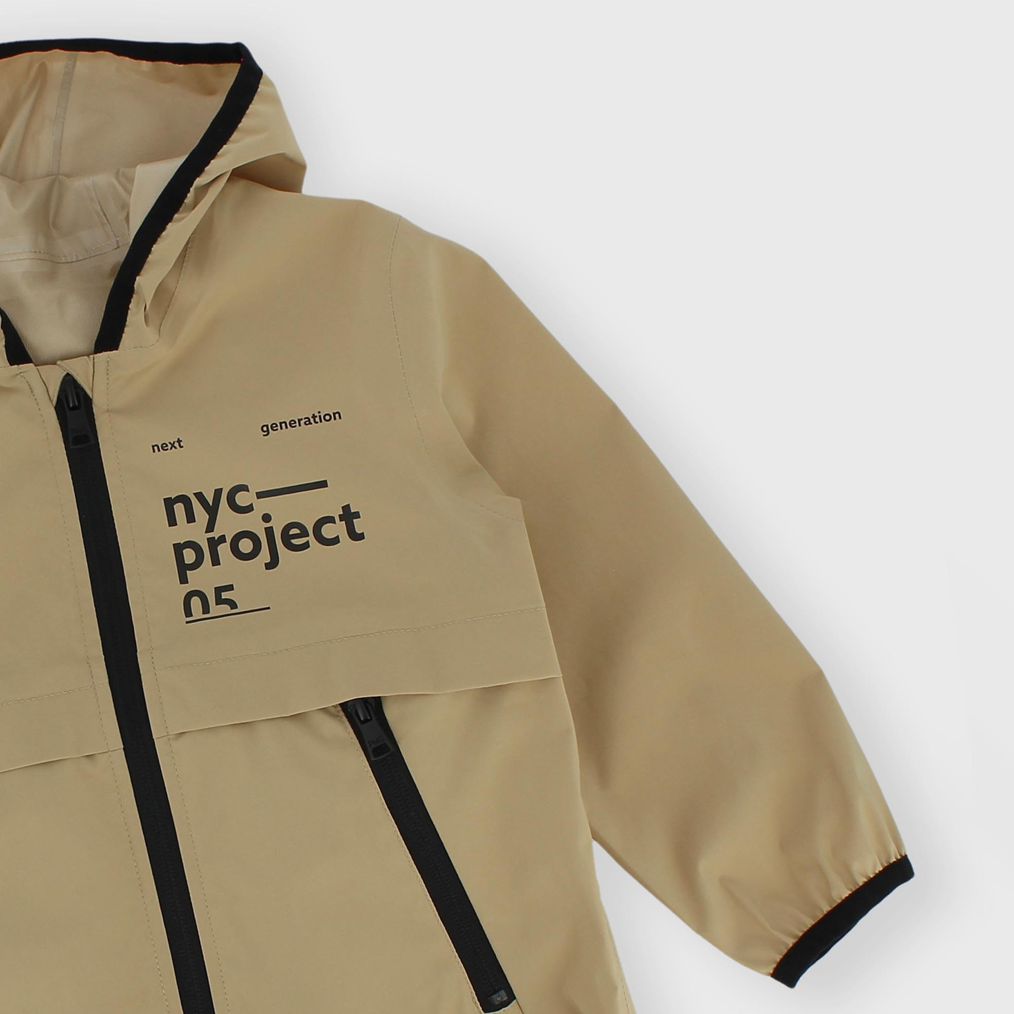 Blouson en nylon avec capuchon et manches longues. Fermeture devant avec zip. Coutures internes thermosoudées. Poches avec zip et imprimé sur poitrine. Poignets avec élastique et profils à contraste. Zip cachée derrière qui permet de fermer le blouson genre sac.