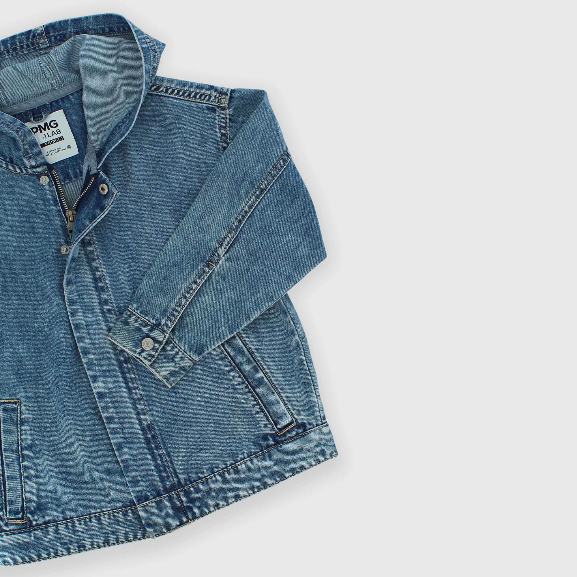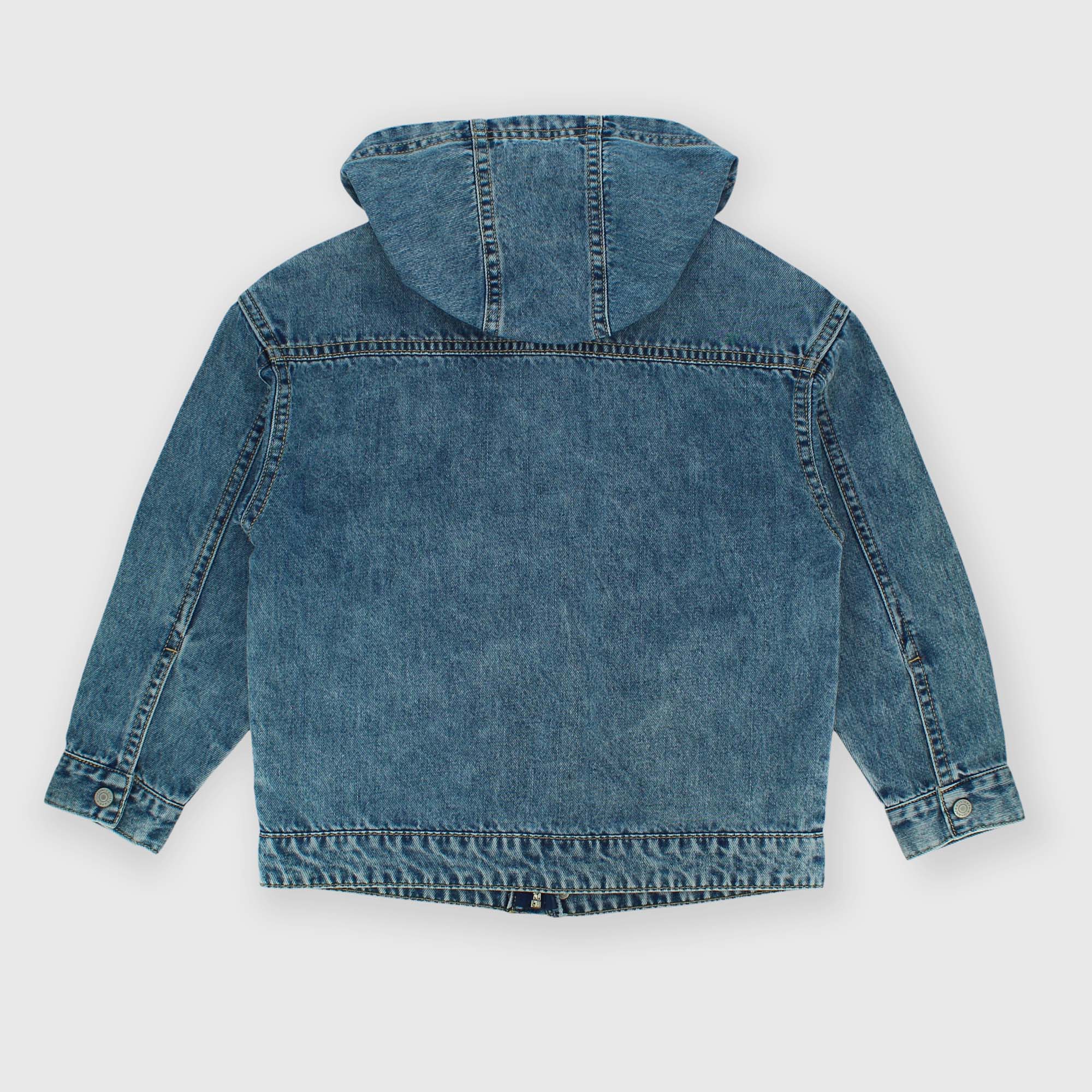 Blouson en jeans avec capuchon et manches longues. Fermeture devant avec zip et boutons pression. Poches lisière.