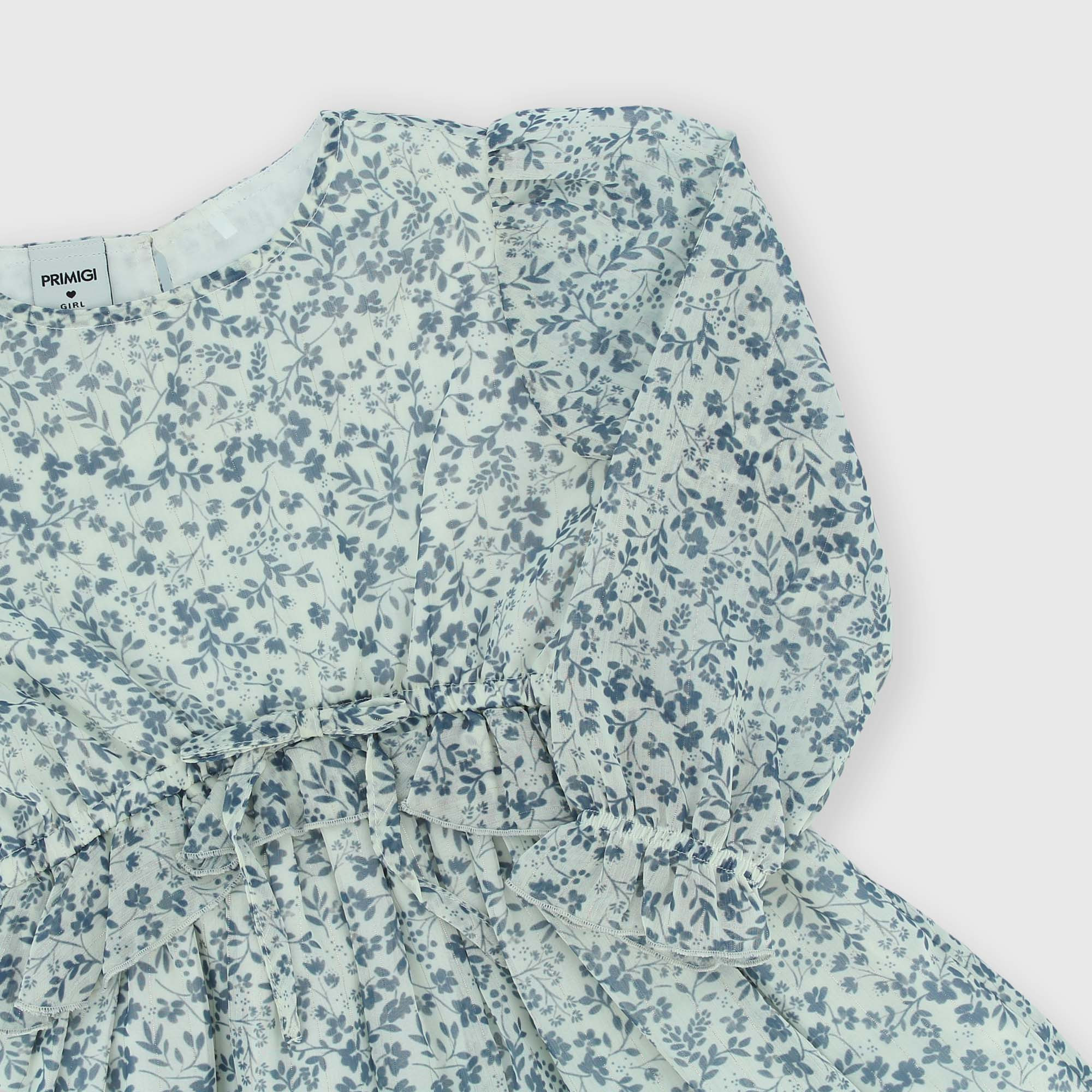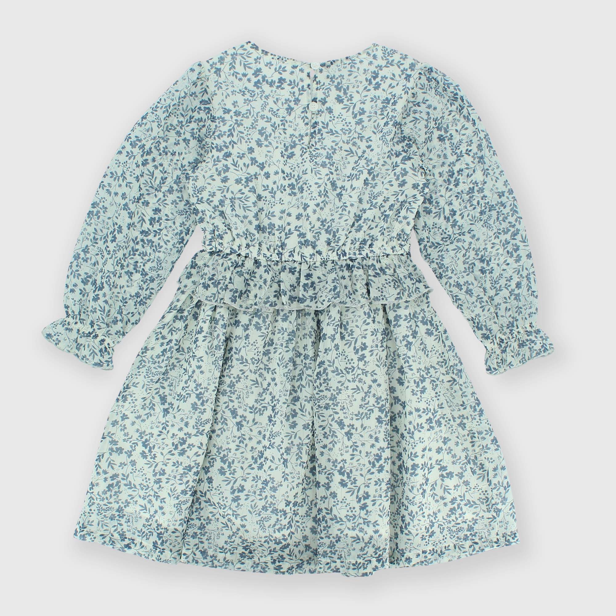 Robe en chiffon avec fleurs imprimées, raz de cou, manches longues. Fermeture avec deux boutons sur le dos. Taille élastique avec noeud et volants appliqués. Doublure.