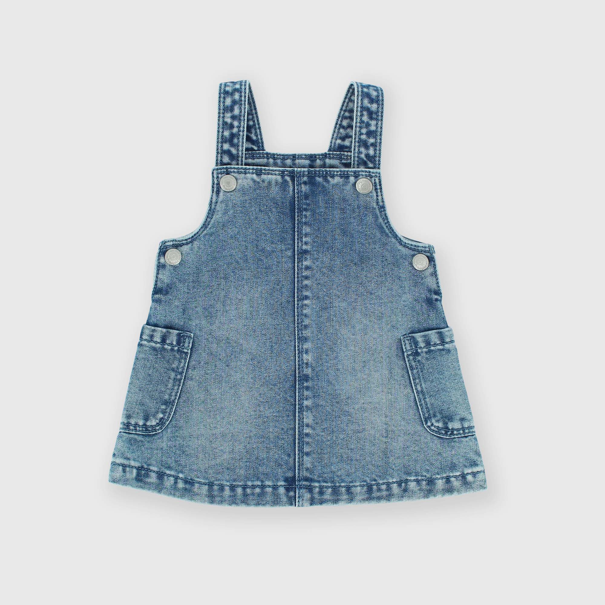 Salopette en jeans avec boutons pression. Poches appliquées latéralement.