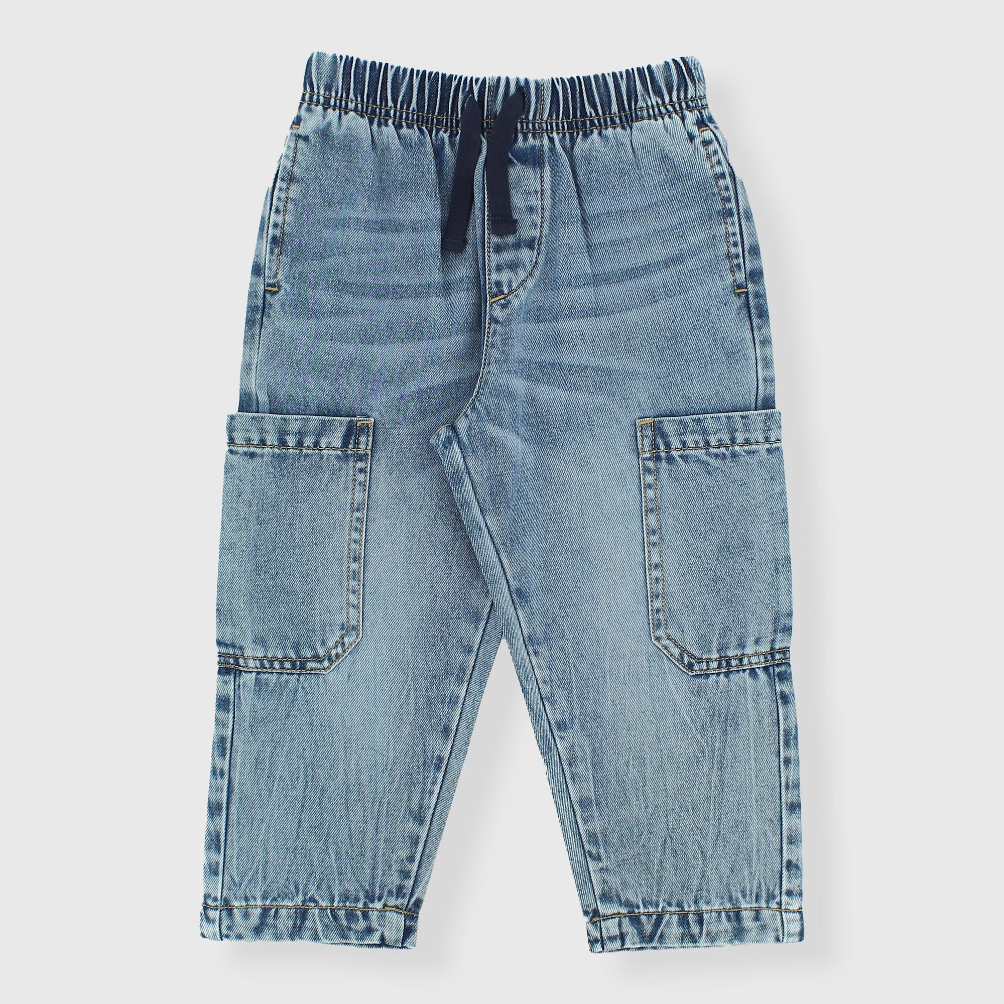Pantalon en jeans avec taille élastique et lacets devant. Fausses poches et poches appliquées sur le côté.